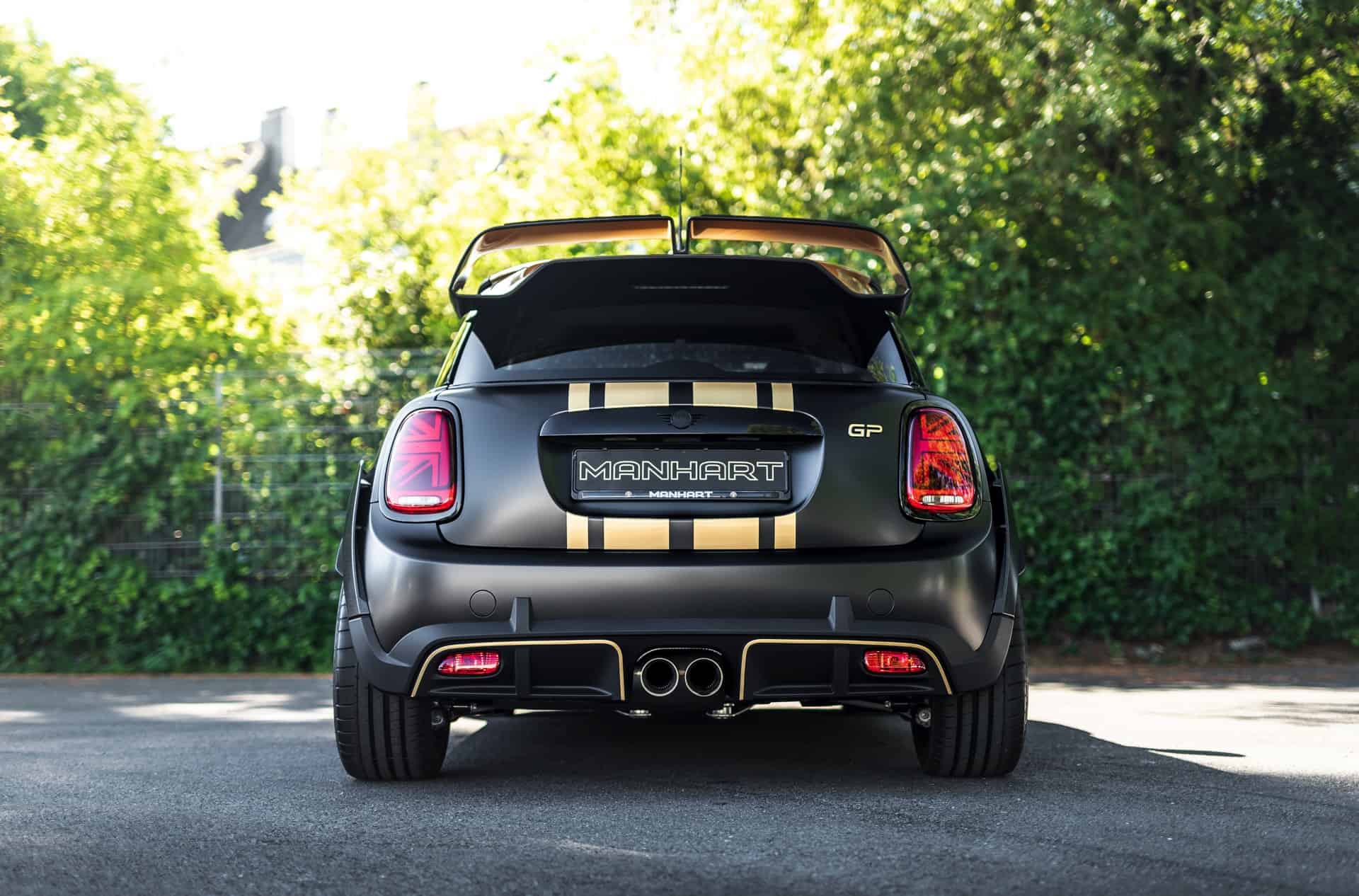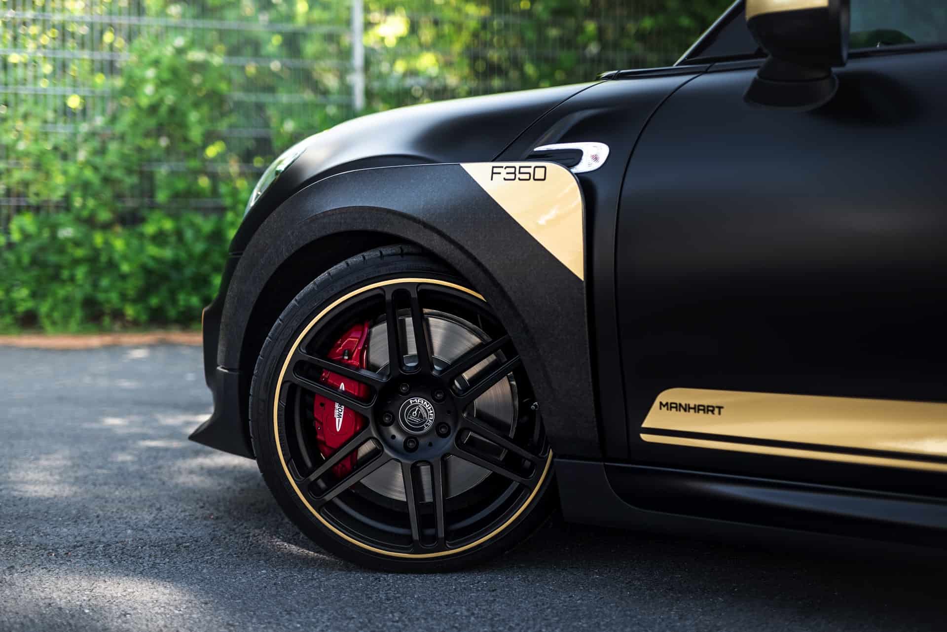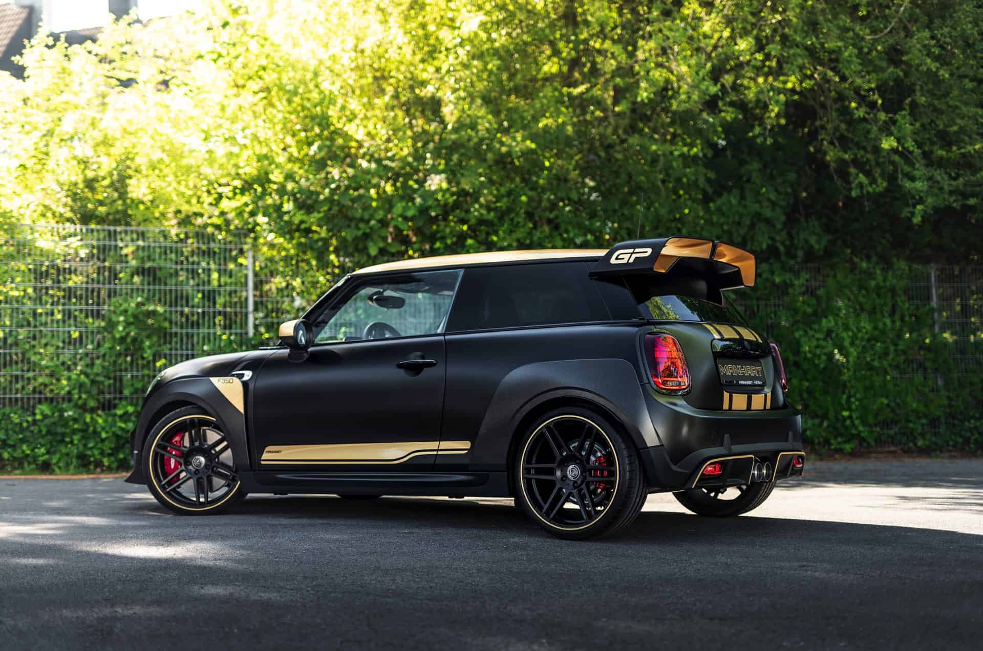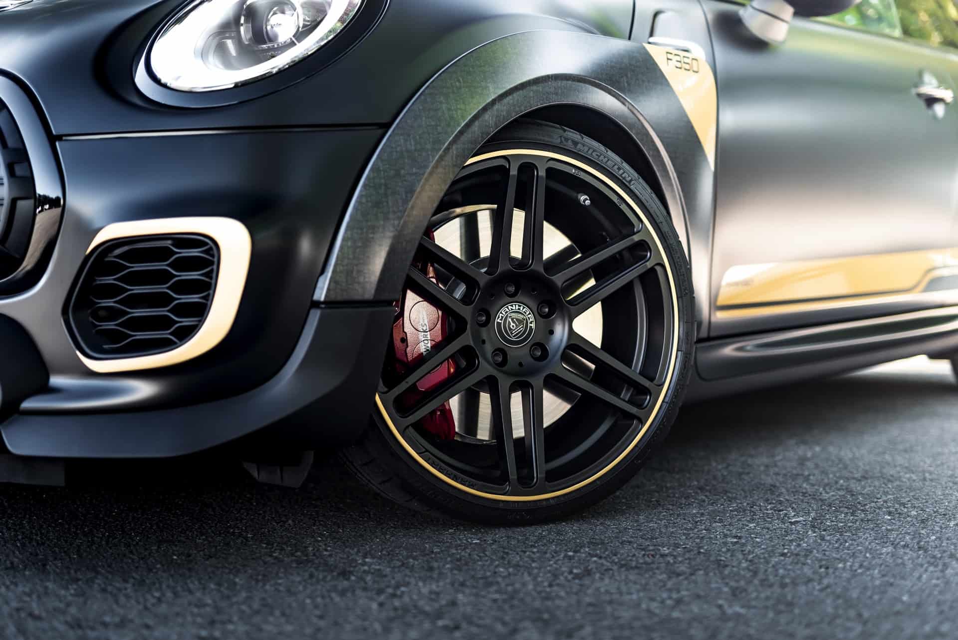 The look of the Manhart GP3 F350 will also stand out in the crowd. The standard fender flares and the huge rear wing of the MINI John Cooper Works GP get some golden accents. Next, the air inlets and the diffuser are also painted with the same golden accents.