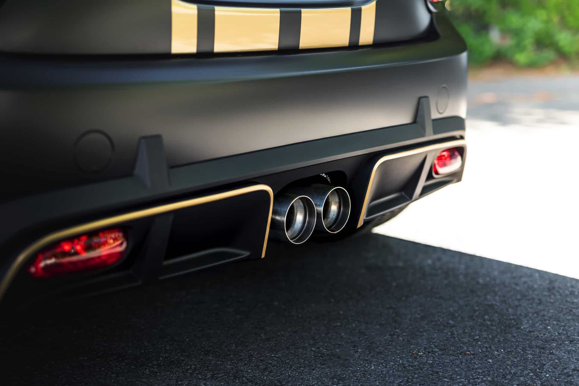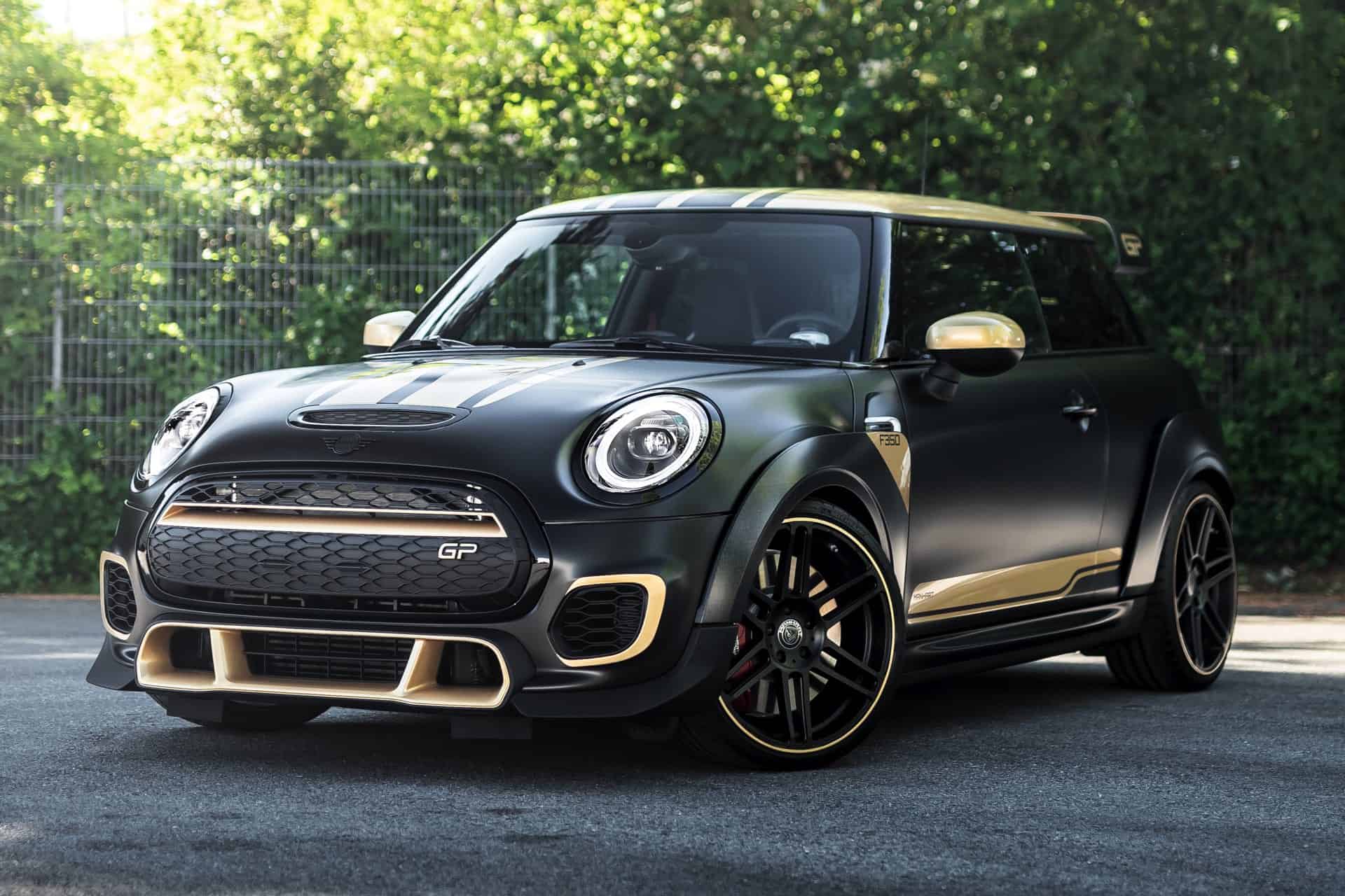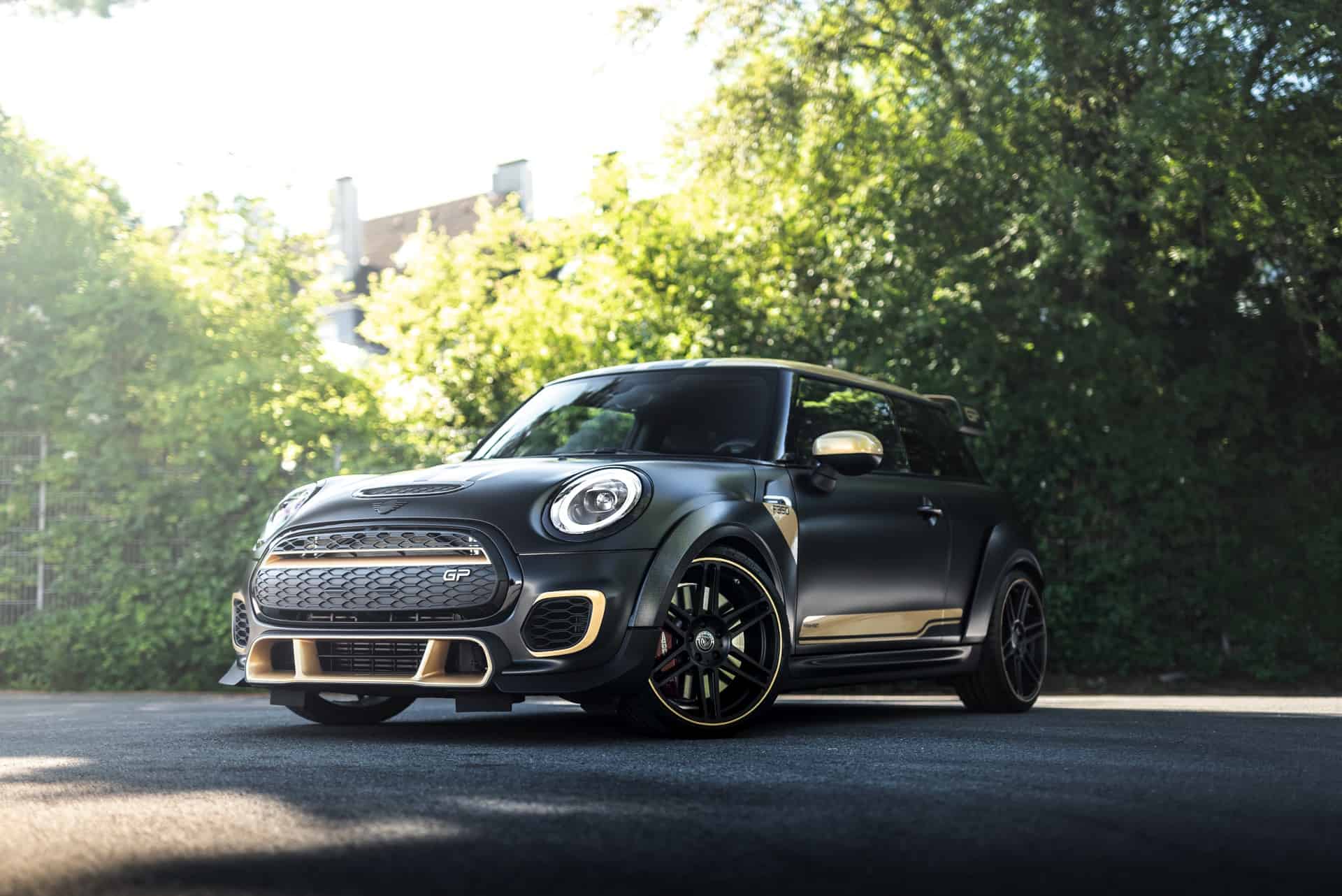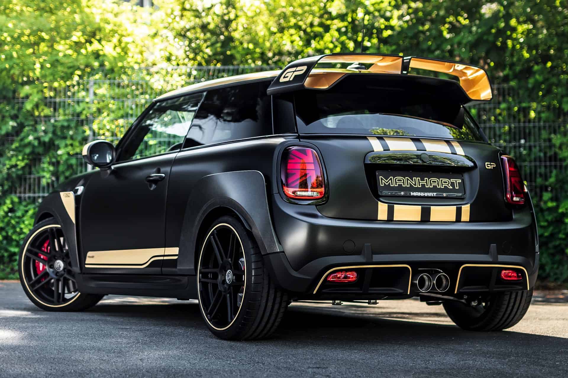 The look of the Manhart GP3 F350 will also stand out in the crowd. The standard fender flares and the huge rear wing of the MINI John Cooper Works GP get some golden accents. Next, the air inlets and the diffuser are also painted with the same golden accents.