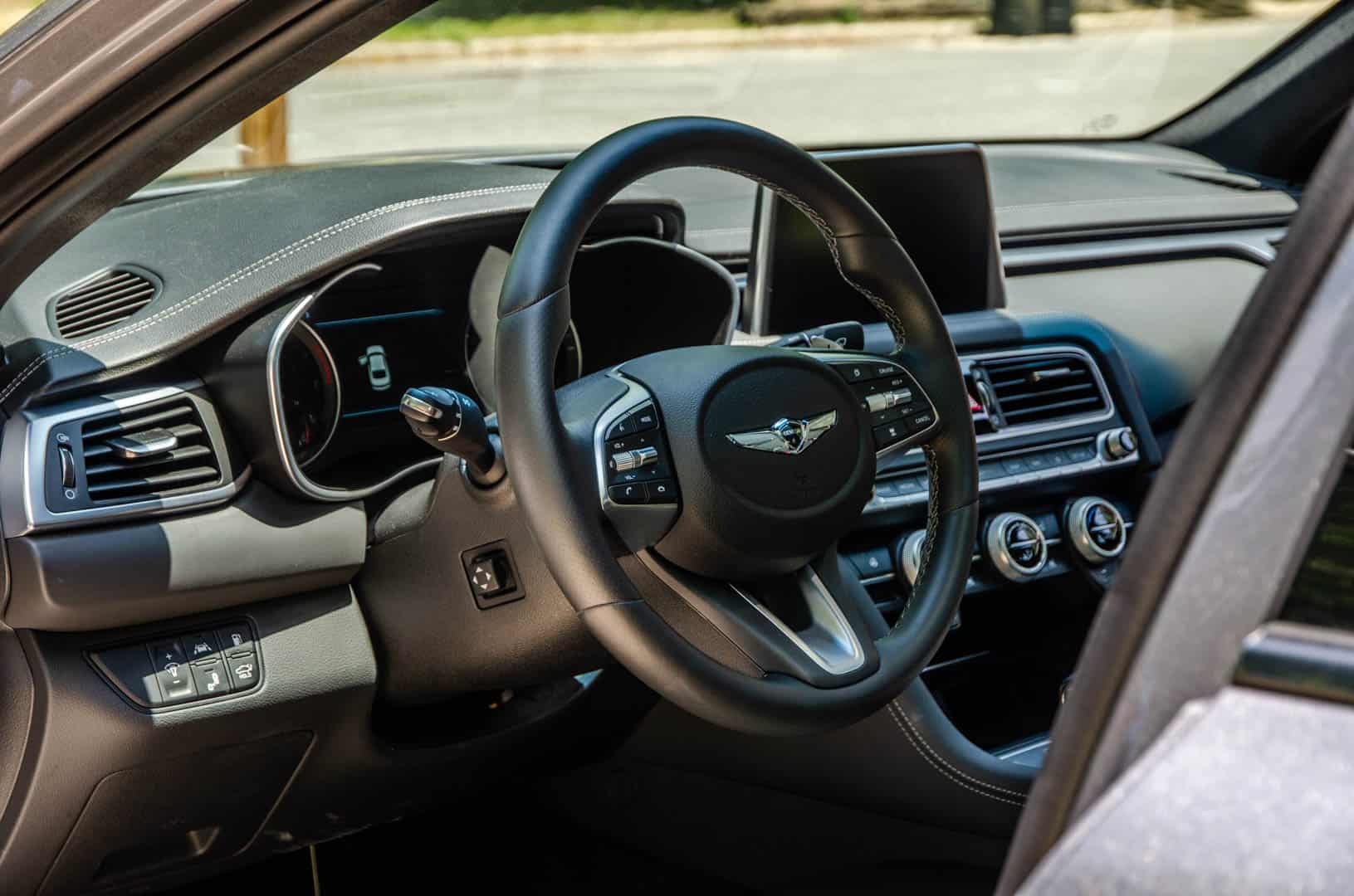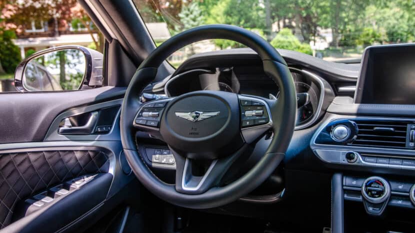 The G70’s steering is also lovely It’s lighter than you’ll find in the M340i but its ratio feels a bit faster and actually provides better feedback through the wheel. It’s a bit short of the segment benchmark — the Alfa Romeo Giulia — but I’d argue it’s the next-best steering in the segment, better even than the BMW M340i’s. I also really like the feel of the steering wheel, which has a thin rim and is easy to wield. Though, the center airbag cover feels a bit cheap and plasticky, which is far less premium than in the M340i.