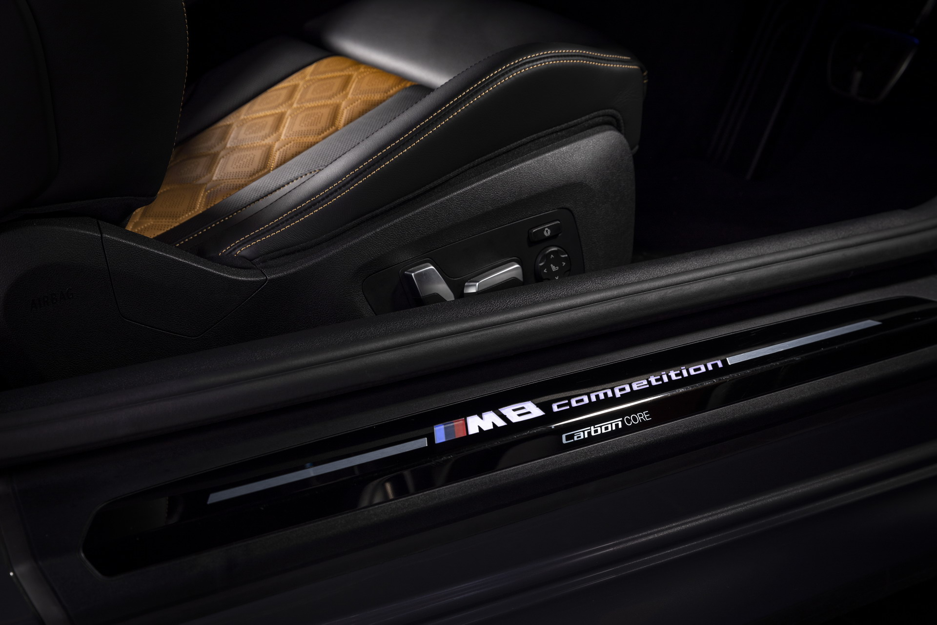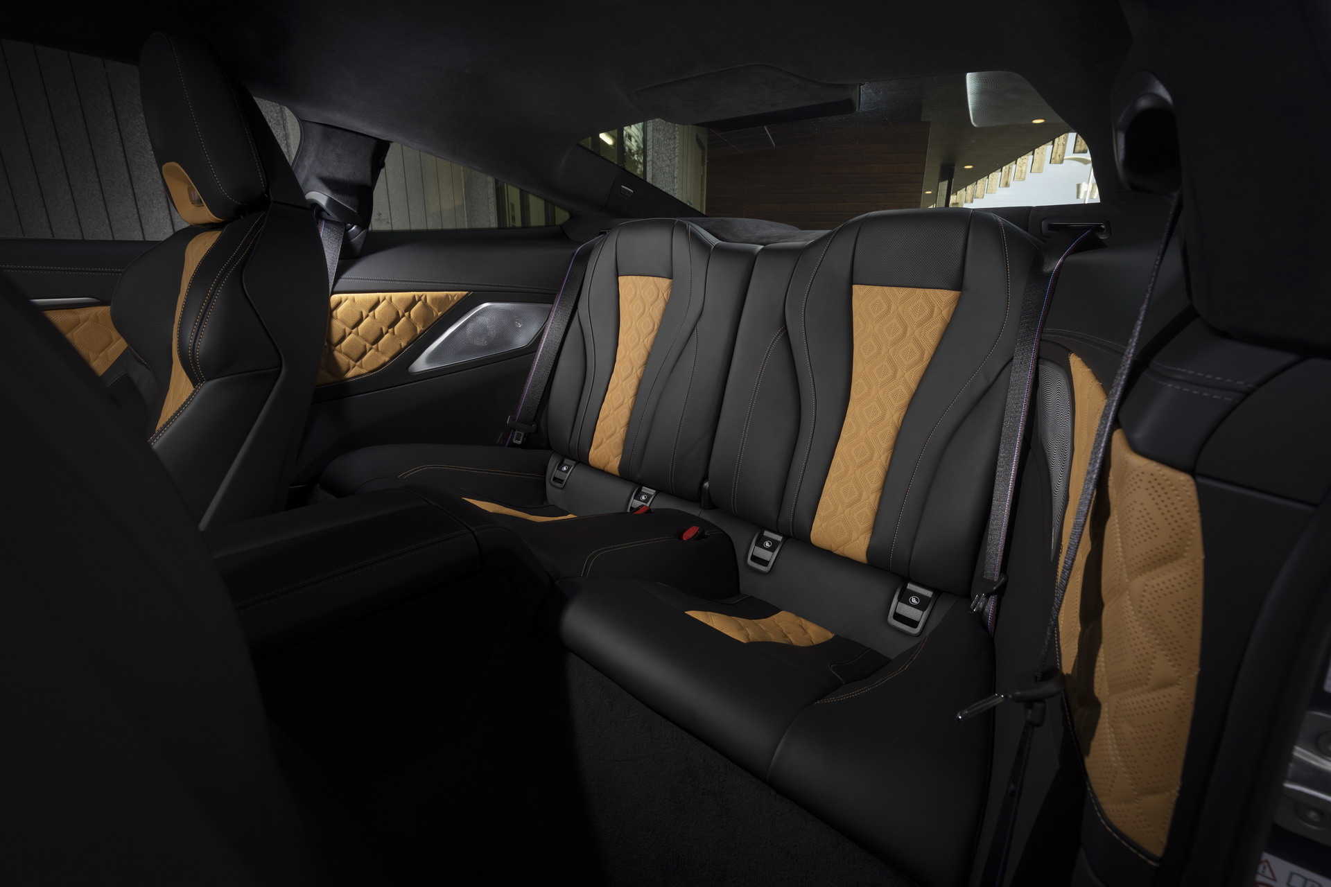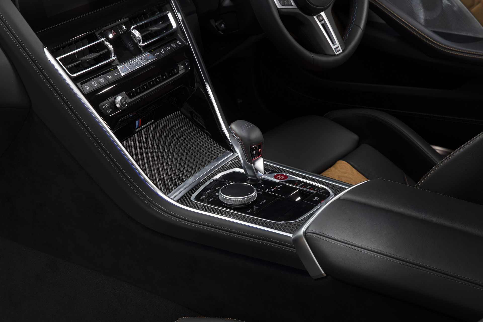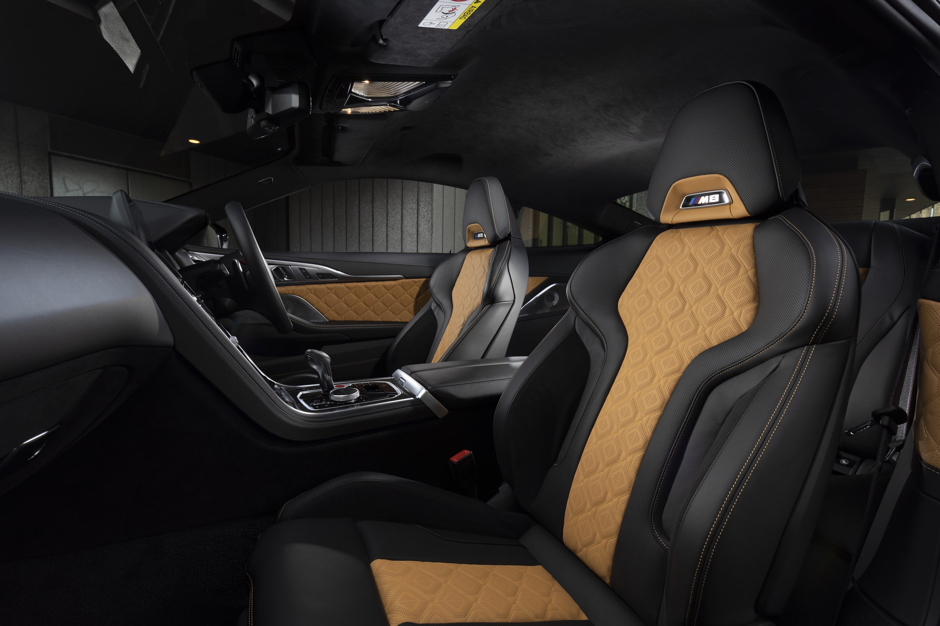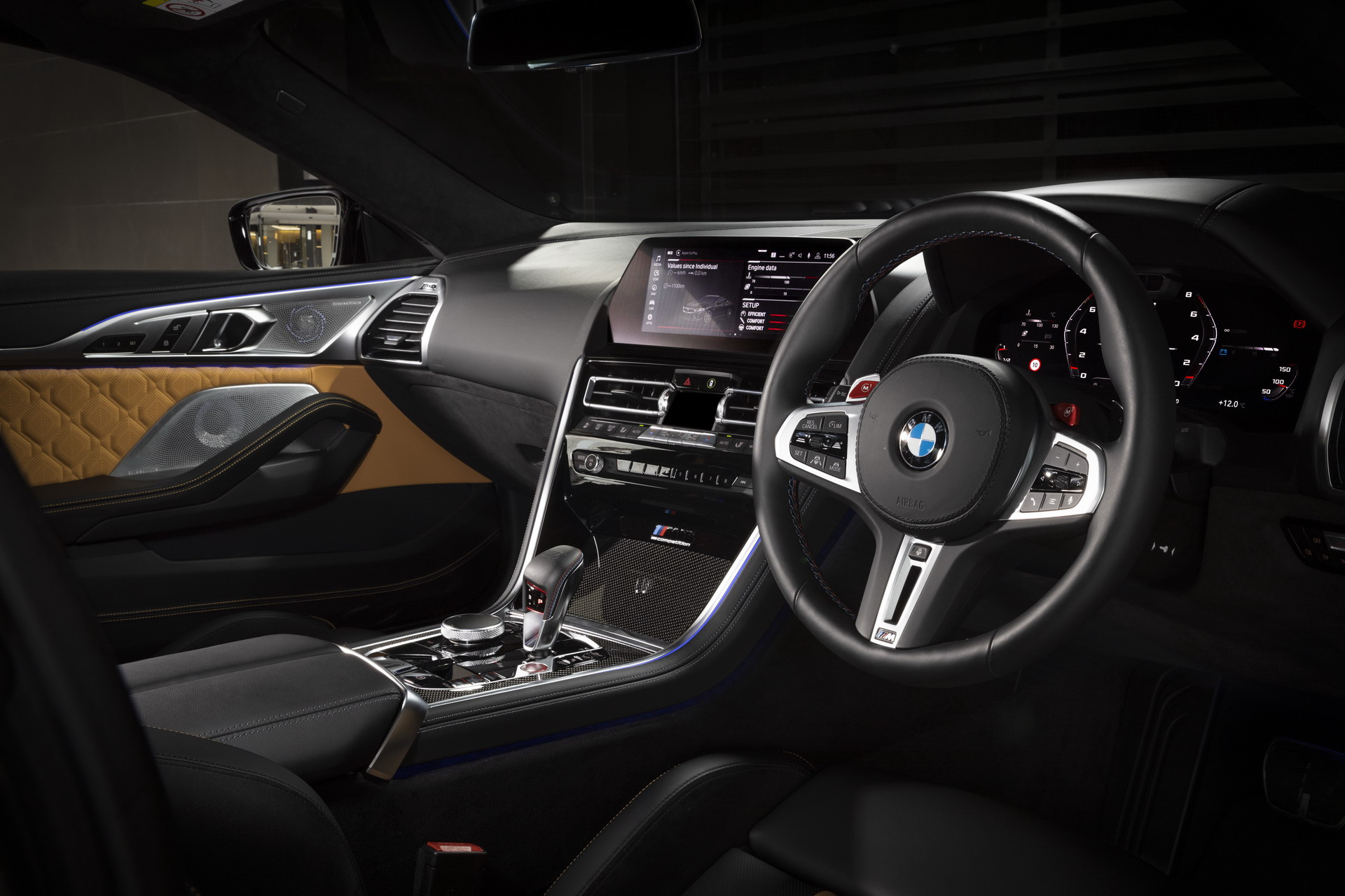 Inside, the M8 Competition Coupe is garnished with the Midrand Beige/Black leather upholstery with yellow contrast stitching. There are also sports carbon fiber ornaments on the center console. The headliner comes courtesy of BMW Individual and is manufactured out of black Alcantara.