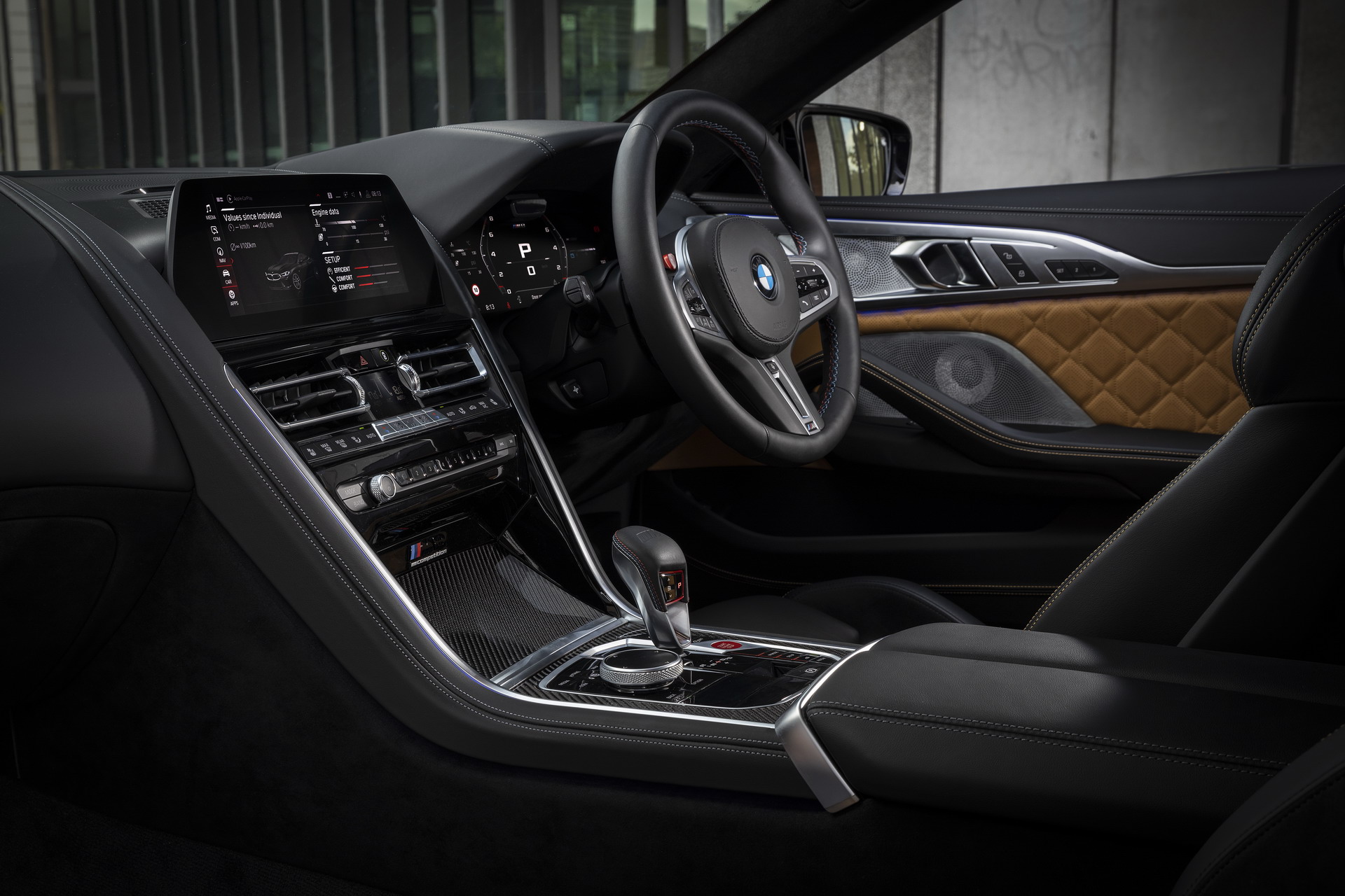 Inside, the M8 Competition Coupe is garnished with the Midrand Beige/Black leather upholstery with yellow contrast stitching. There are also sports carbon fiber ornaments on the center console. The headliner comes courtesy of BMW Individual and is manufactured out of black Alcantara.