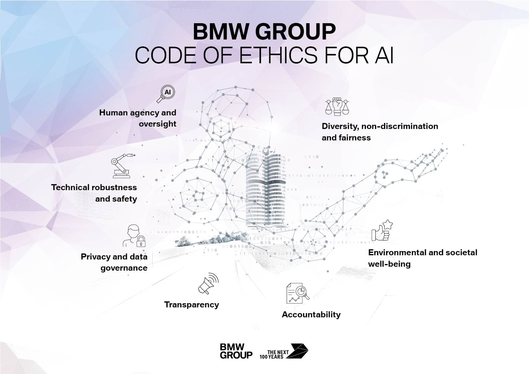 The BMW Group’s AI applications should be implemented so they work responsibly. The BMW Group will identify, assess, report and mitigate risks, in accordance with good corporate governance.