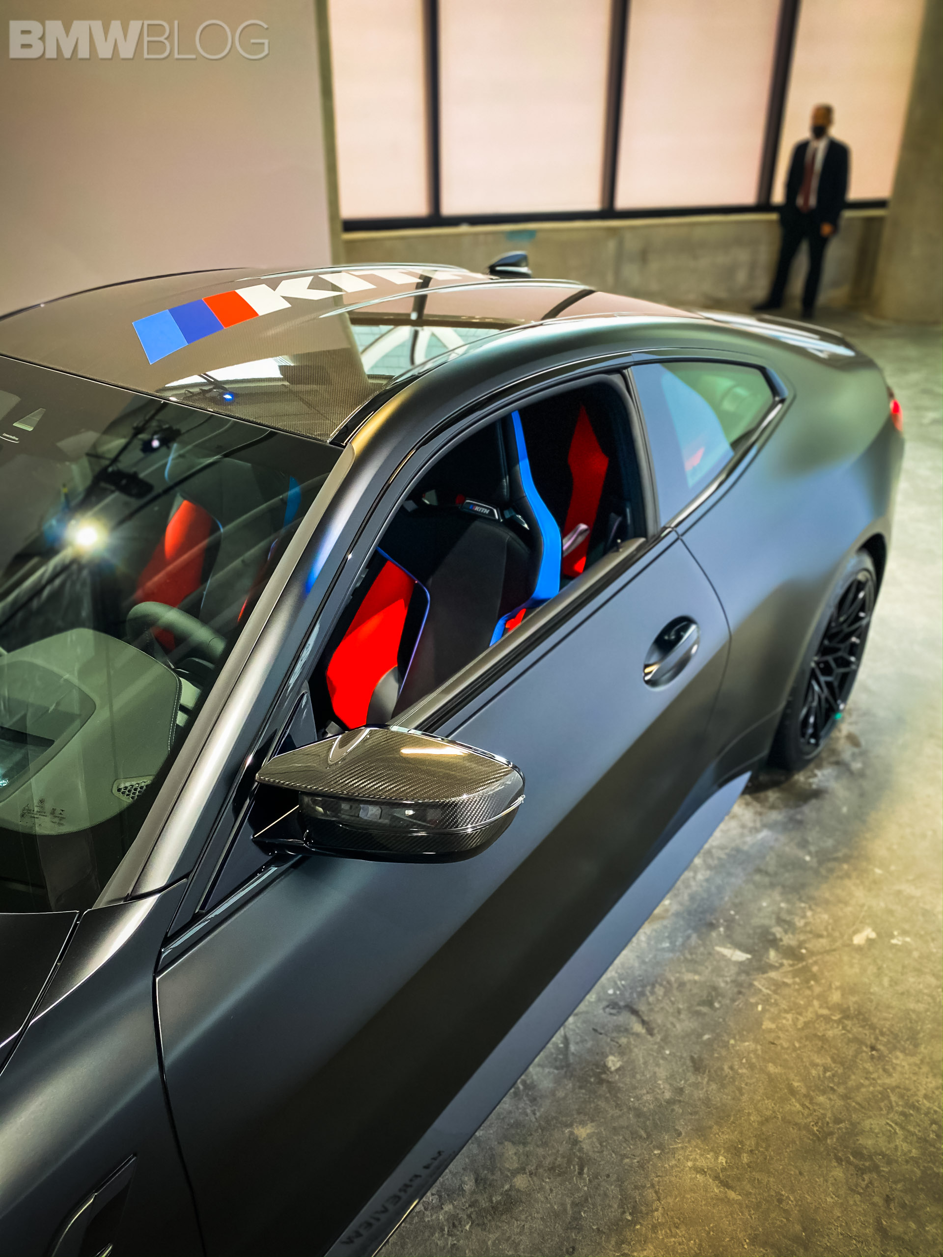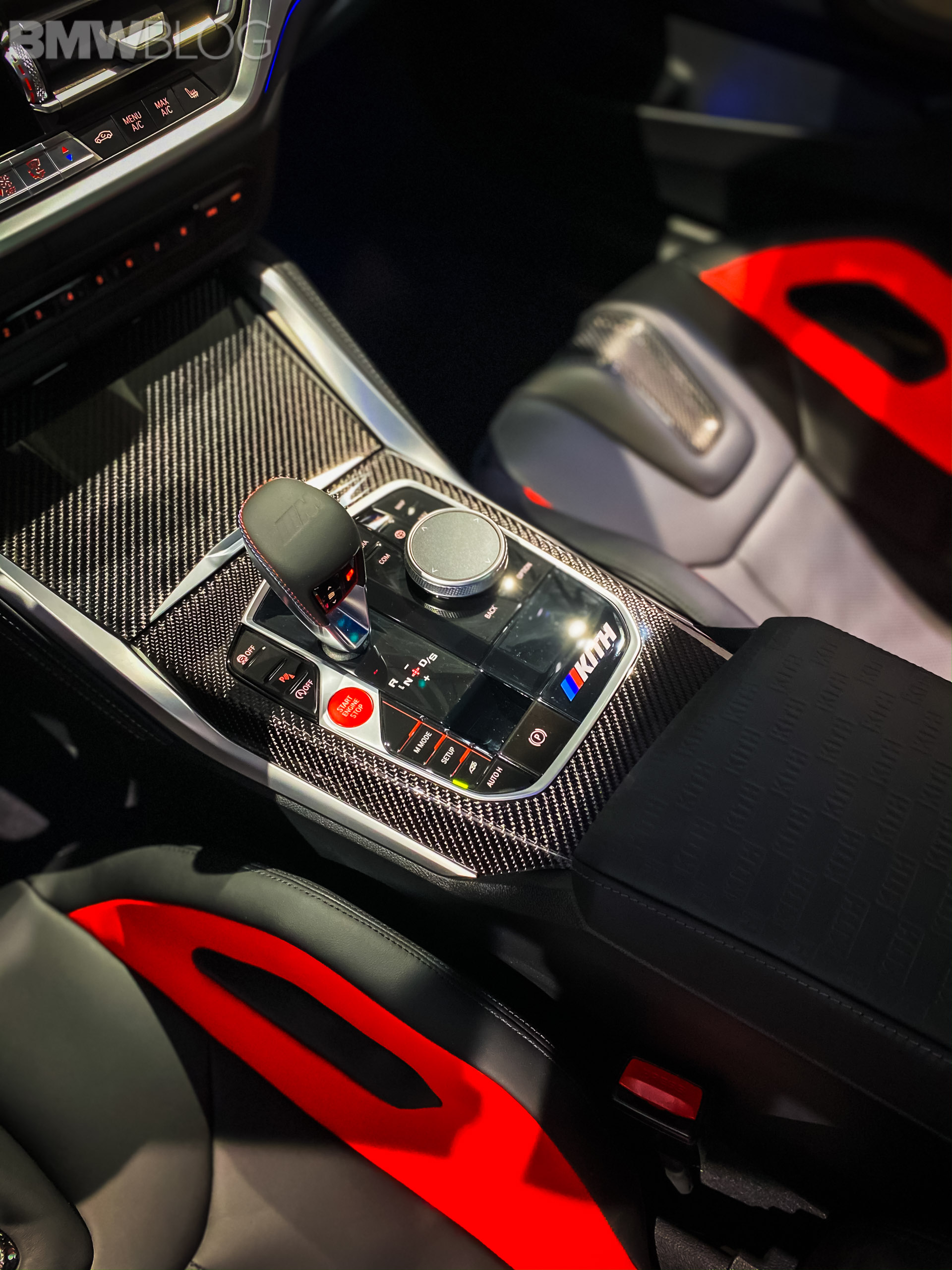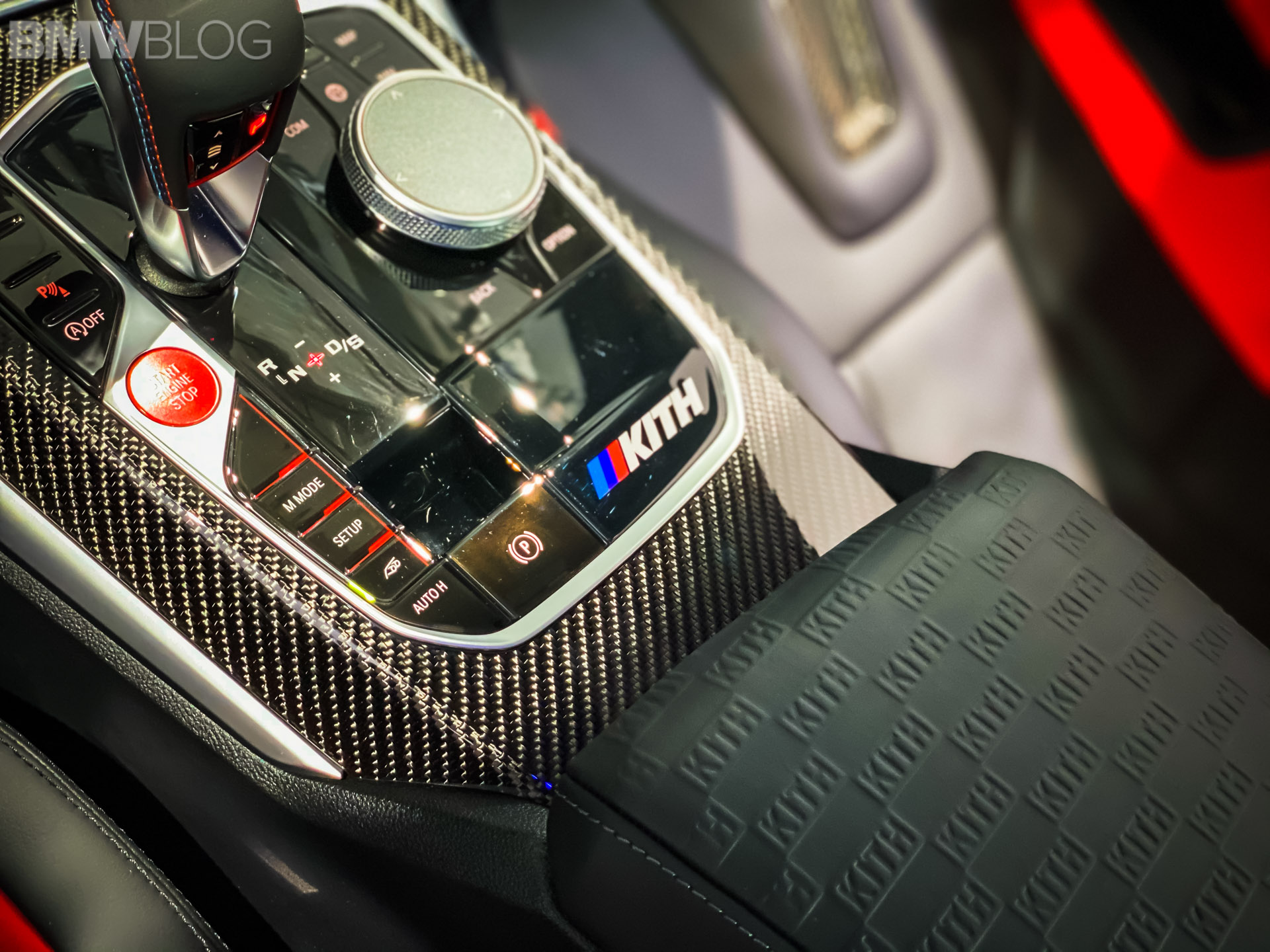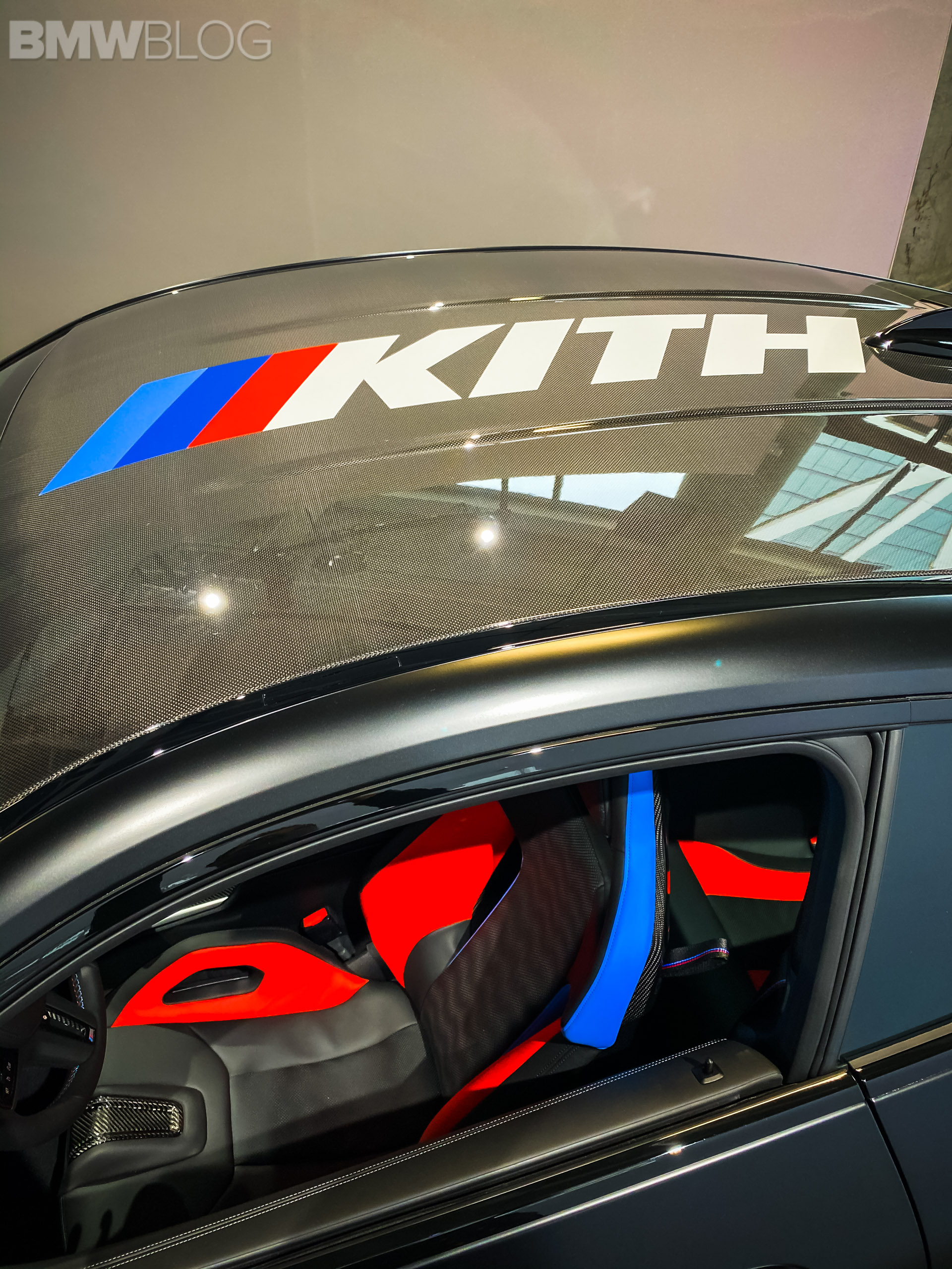 There’s also an optional carbon fiber roof with a massive “Kith” logo, again with M-colored stripes. Inside, black Competition seats with blue and red accents dominate the cabin. Those seats also feature “Kith” embossing in the headrests. The same embossing can also be found on the center arm rest and the M-colored “Kith” logo is seen on the center console, under the gear lever.