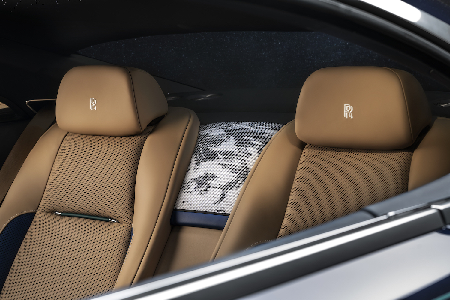 Arctic White ‘RR’ monograms and stitching hint at clouds and translucent running water. The rear waterfall features a spectacular scene of atmospheric clouds rendered in minutely detailed embroidery using Photoflash technology. On the fascia, the Piano Milori veneer is embellished with a satellite image of the Middle East, so realistic that it appears to be a photograph but in fact is skilfully air-brushed.
