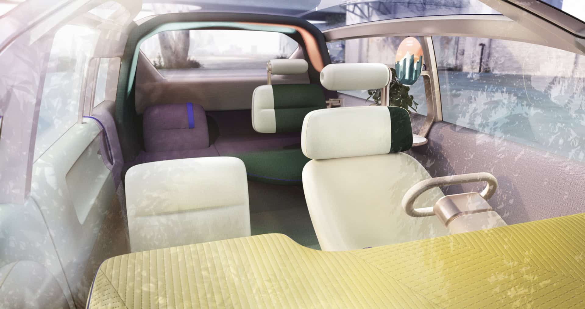 Speaking of its interior, there are a few different configurations for the four seats inside the MINI Vision Urbanaut. The front seat can not only swivel around to allow the “driver” to converse with other passengers but, while stationary, the entire dashboard actually lowers to become a little bench. MINI calls this the “Daybed”. Adding to the Daybed, the entire windshield pops open, upwards like a canopy, to create what MINI calls the “Street Balcony”. But wait, it gets better. In the back, there’s a little bed-like seat that’s apparently called the “Cozy Corner”. Said Cozy Corner also features a textile-covered “Loop”, which is essentially an LED backlit arch that extends over the seat, for reading about how to DIY sustainably-sourced beaded seat covers.