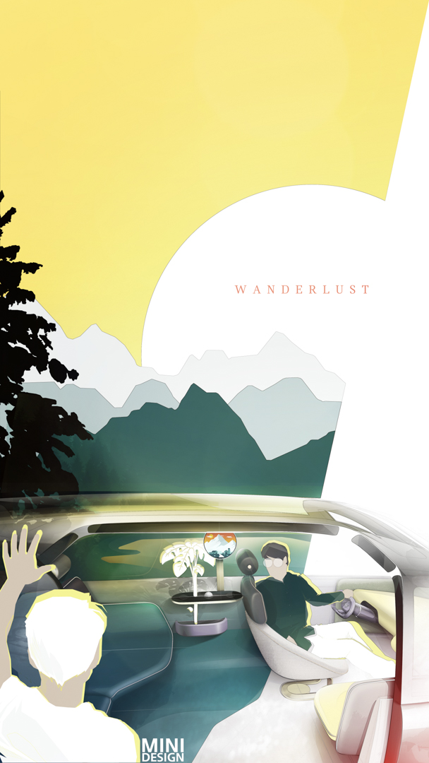 In “Chill”, the car becomes a relaxing pod, so that its driver can work peacefully or just sit and have a cup of kombucha tea on the way to work, as the car drives itself entirely autonomously. “Vibe” is designed to focus on passengers and letting them hang out with each other in the living room-like environment, presumably while playing banjos. “Wanderlust” mode is the only mode in which the MINI Urbanaut is actually driven by the driver, though it can still use automated driver aids to assist the driver.
