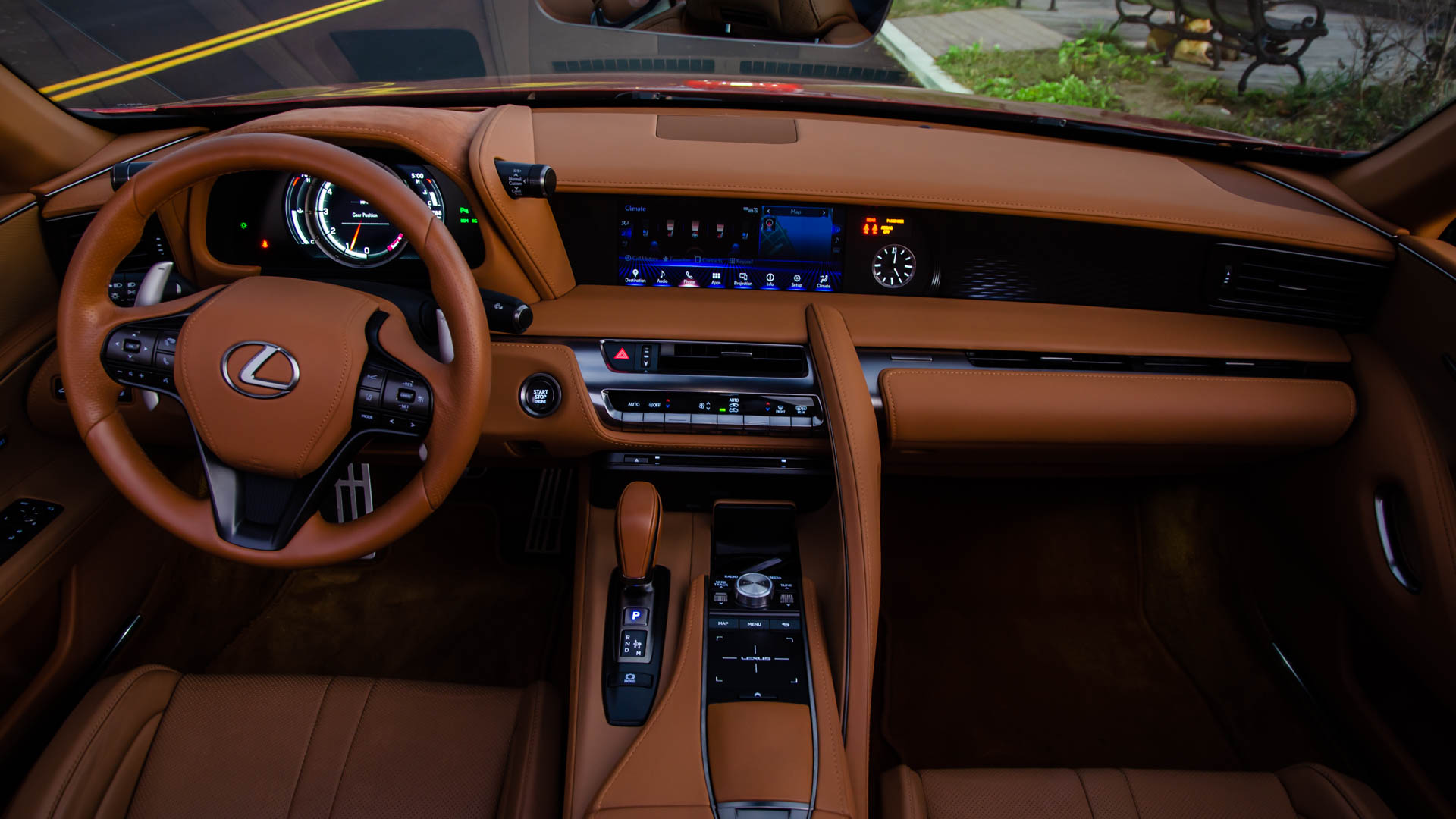 What potentially stands out even more than the exterior design is the interior design. The cabin of the Lexus LC500 Convertible is sensational to look at and sit in. It’s beautifully sculpted, with so much depth and so many layers to its design. The materials, fit and finish are all outstanding as well. Even something as simple as turning the aluminum volume knob, which features a smooth operation with no physical clicks, feels special. It’s one of the best looking, most interesting cabins on the market. Until you try to use anything.