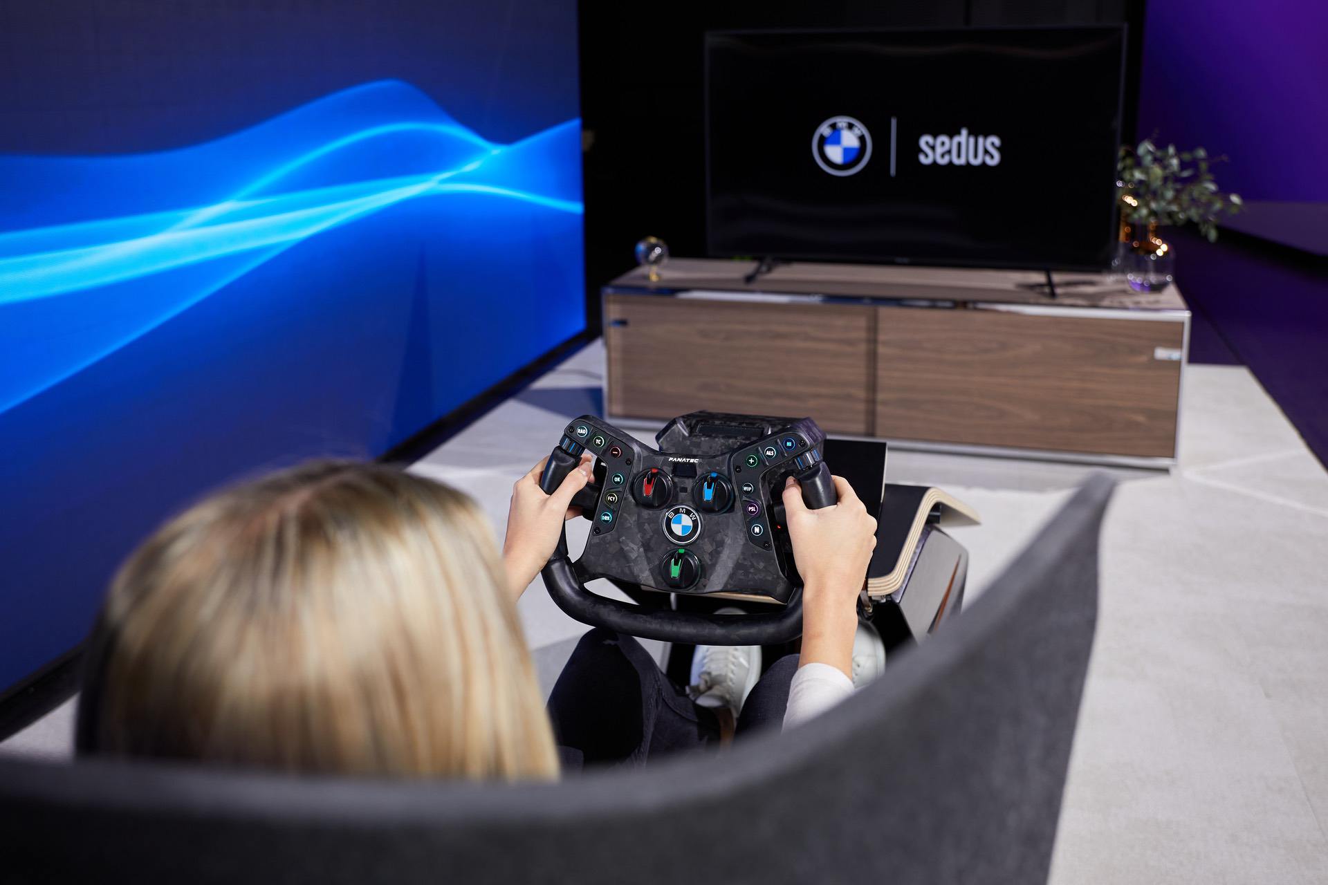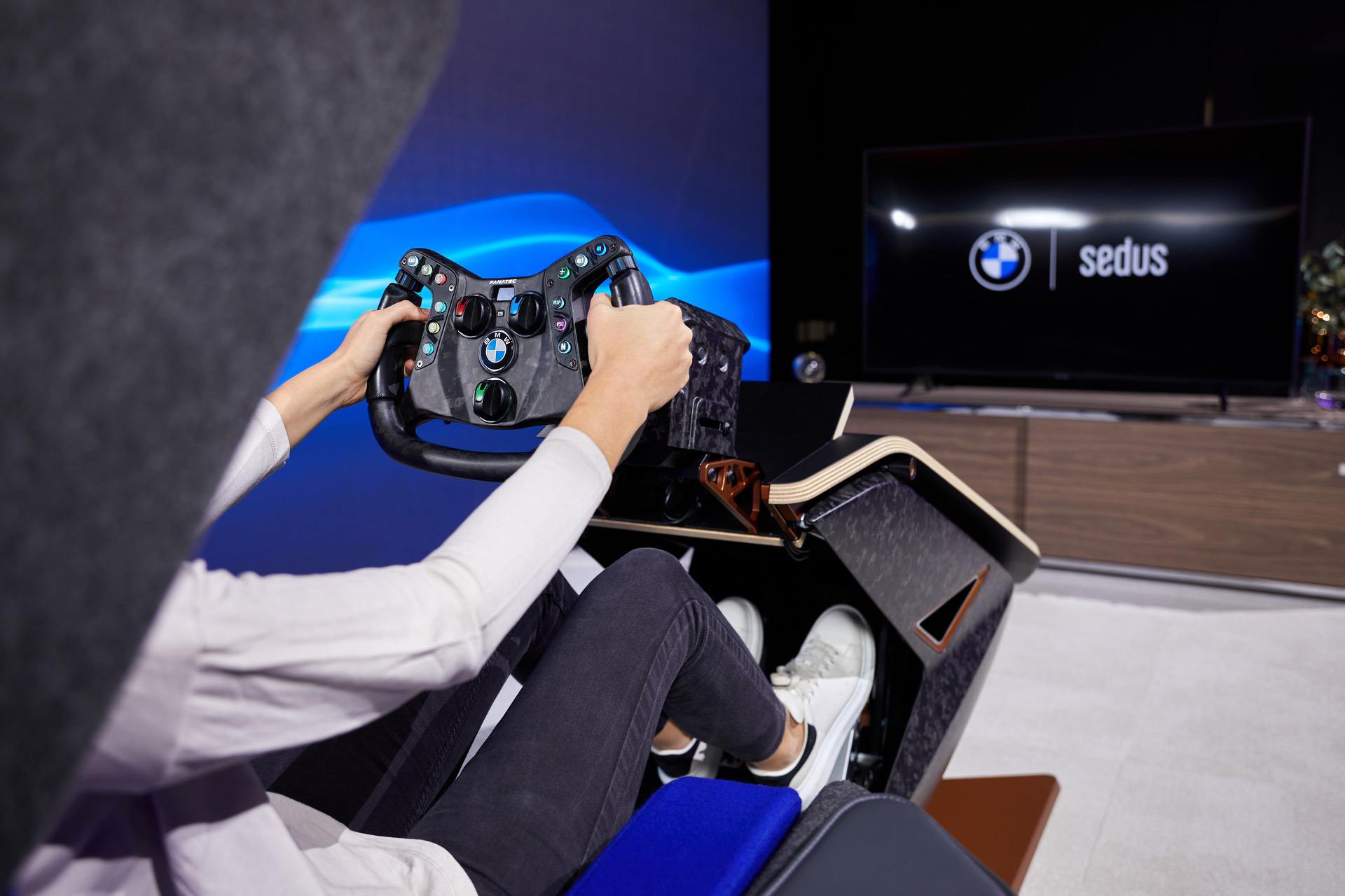 BMW says that absolutely no modifications are required for it to be used in the race car. The carbon steering wheel is a motorsport design, with illuminated buttons and magnetic, dual-action shift paddles also made of carbon. At today’s event in Munich, BMW works driver Philipp Eng entered the stage in the real BMW M4 GT3, emerged holding the steering wheel, inserted it into the simulator, and promptly completed a number of laps in the car’s virtual counterpart.
