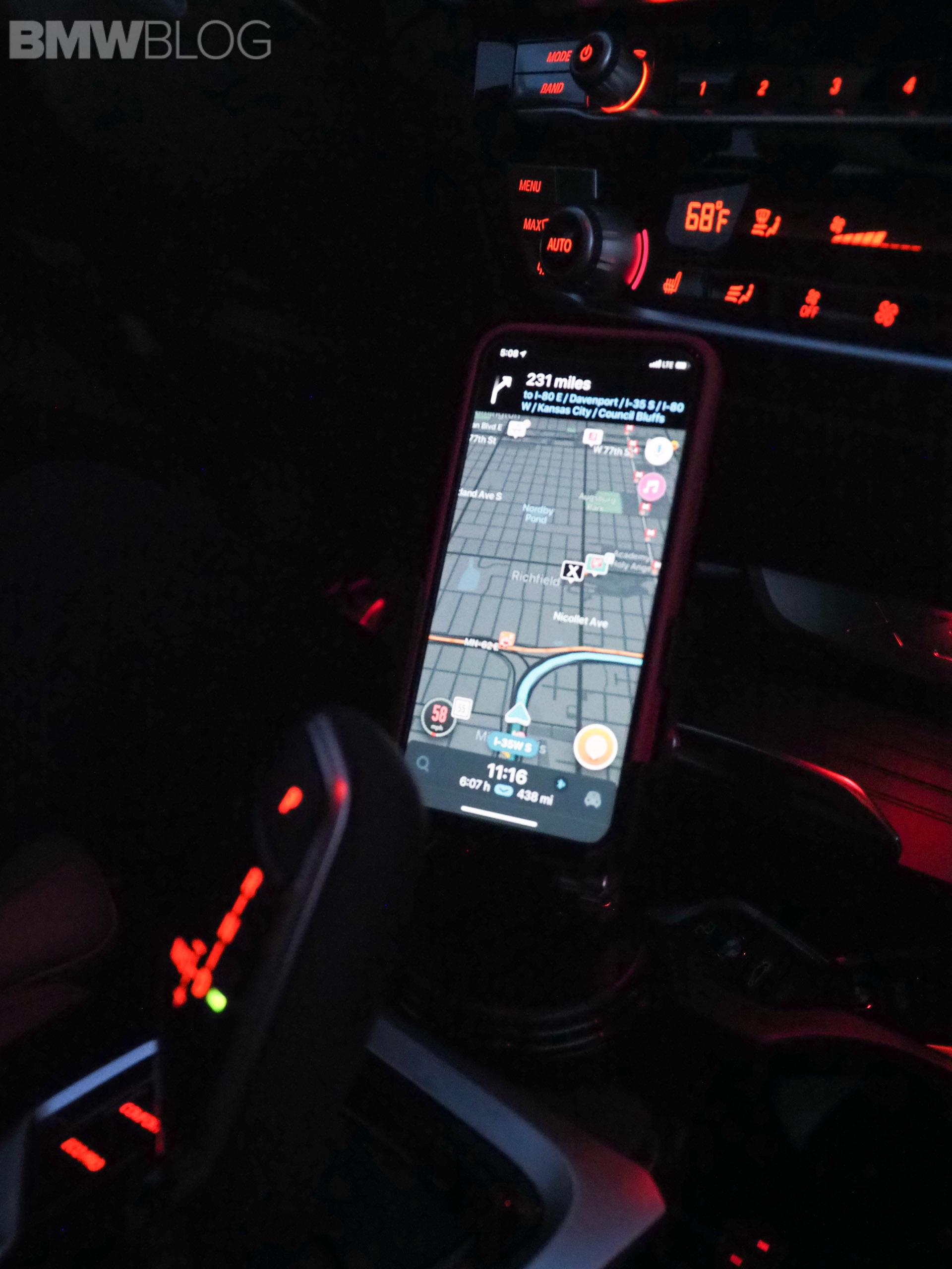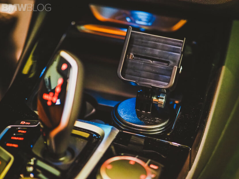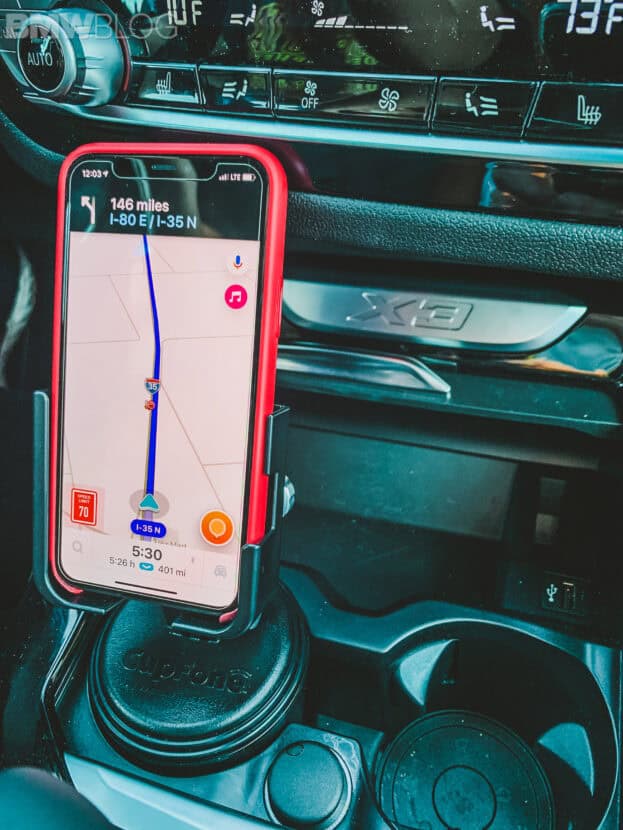 Modern BMWs have a great place to put a cellphone and even offer optional wireless charging for $500. But many times, there is an inconvenience: they are not always in the most optimal place for driving. You have to turn the phone sideways and shove it up under the center console in front of the cup holders. At best, you can see the bottom half of the screen horizontally and it’s far away.