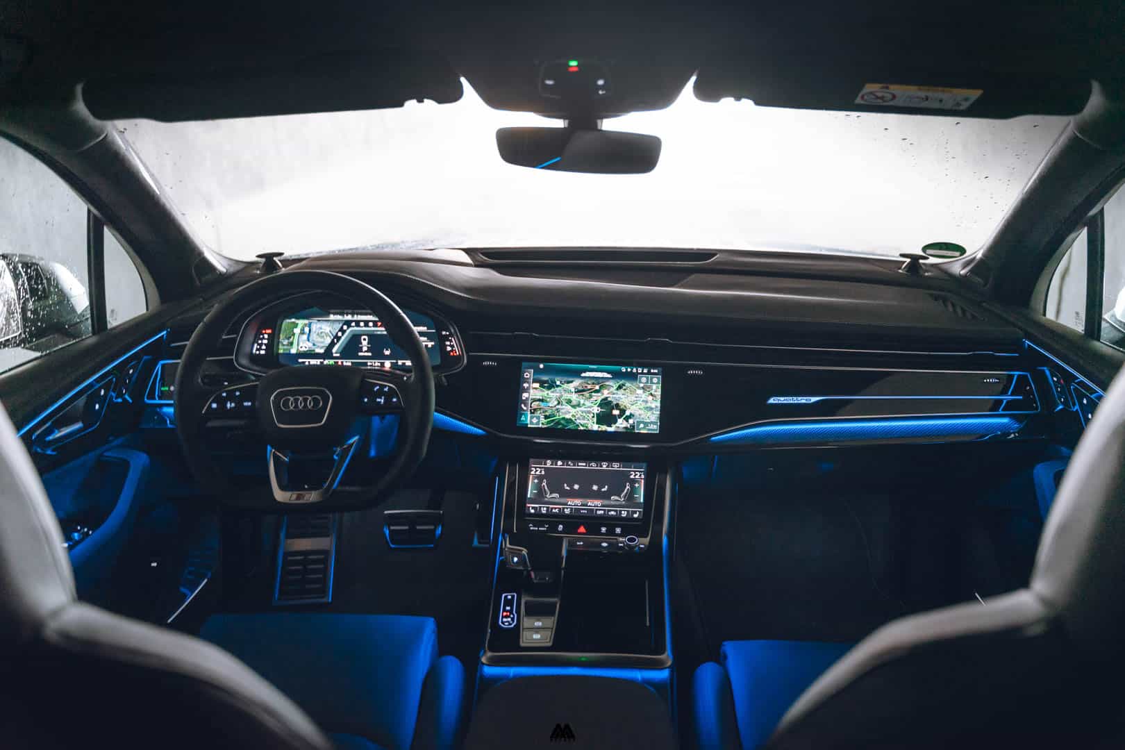 Leaving the technical ingredient behind with positiveness, we end up within the cabin where you are greeted with Audi’s familiar mix of soft-touch materials, leather seats, brushed aluminum trims, Alcantara on the doors and precision-action switches plus Audi’s latest infotainment system. Upon request, Audi will install sport seats with integrated head restraints and pneumatically adjustable side bolsters. You can even opt for ventilation and a massage function. A third seat row is available as well, but only applicable for children. There is not a lot of space to fit grownups. Also getting in or out of the third row is not the easiest in the world. For those interested, you can also choose the contour/ambient lighting package, which is also available as an option, illuminates contours and surfaces in 30 colors that can be adjusted to the driver’s individual taste via the MMI.