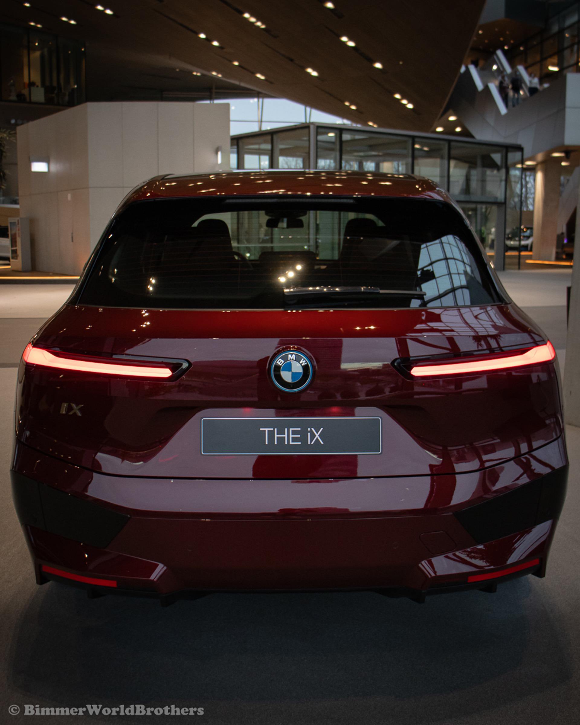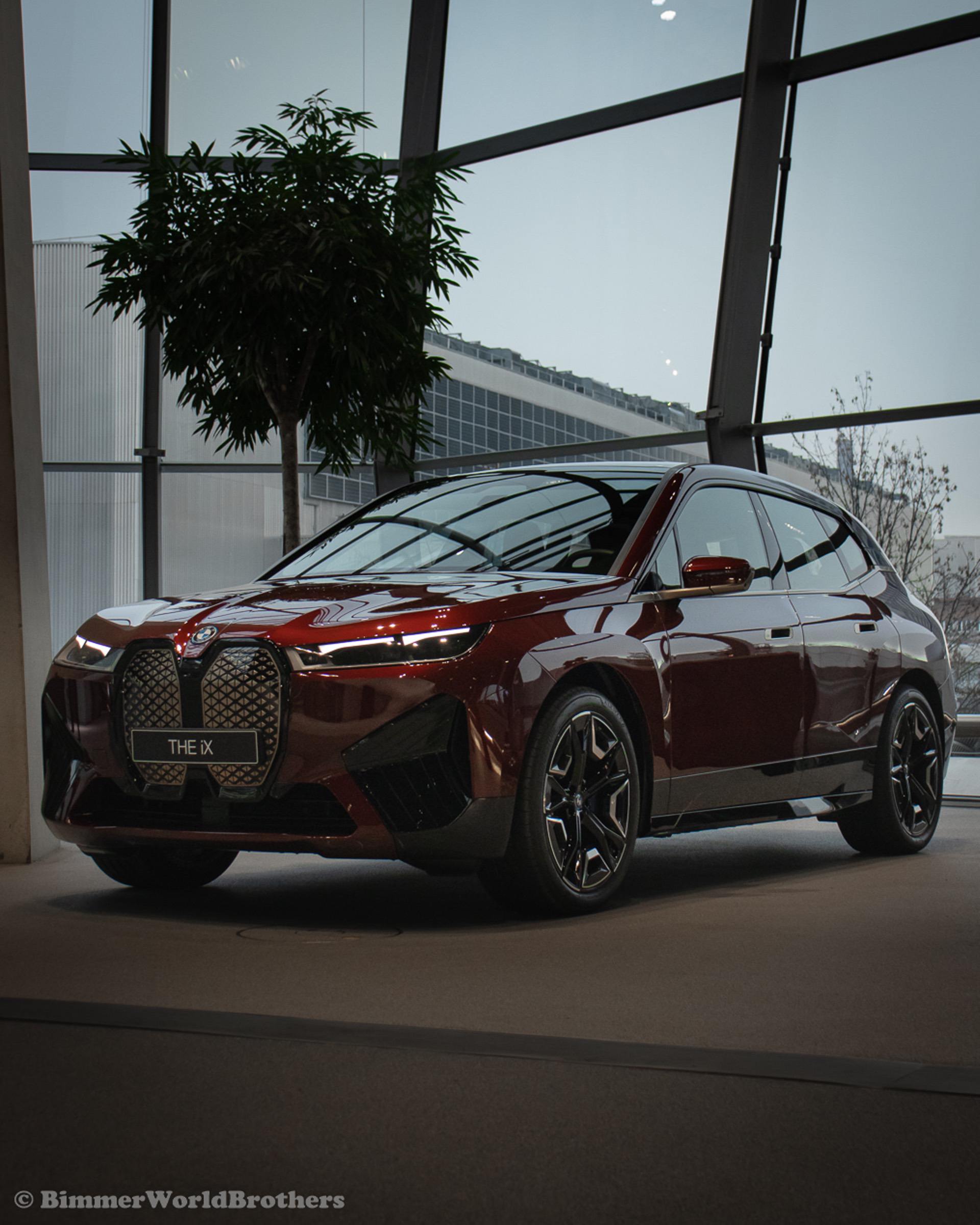 The @bimmerworldbrothers are bringing us new real life photos of the 2022 BMW iX electric crossover. The latest electric vehicle from Munich is now displayed at the famous BMW Welt. The model displayed is the Sport Package with the exquisite Aventurine Red II color. Compared to the standard offering, the Sport Package includes special triangular shields for the Air Curtains and high-gloss black coating for the bordering at the lower edge of the body, as well as for the door handles and the side skirts. As part of this package, the iX also receives smoked-glass tail lights, 21-inch Aerodynamic Wheels in Midnight Grey finish and blue-painted brake calipers.