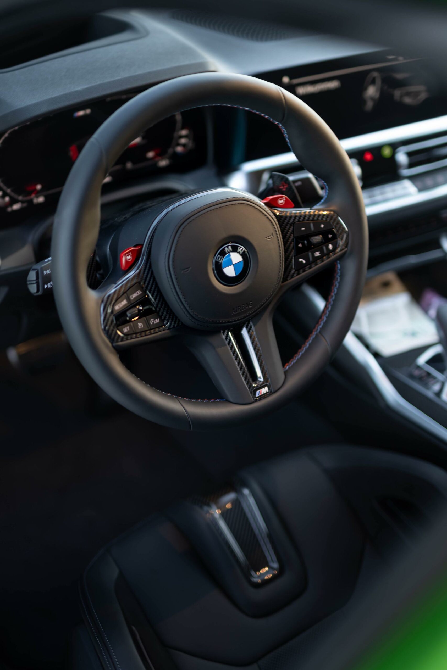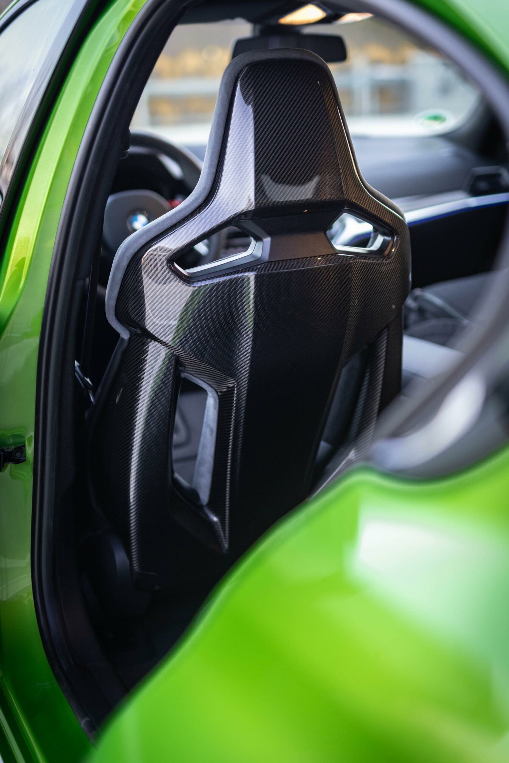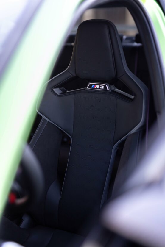 In the case of this G80 M3, the Java Green is paired with an all-black interior treatment, starting with the carbon fiber bucket seats and ending with the trim. Aside from this combo, customers can order the Silverstone/Black with accents in Anthracite, Kyalami Orange/Black with accents in Black and Yas Marina Blue/Black with accents in Yellow.