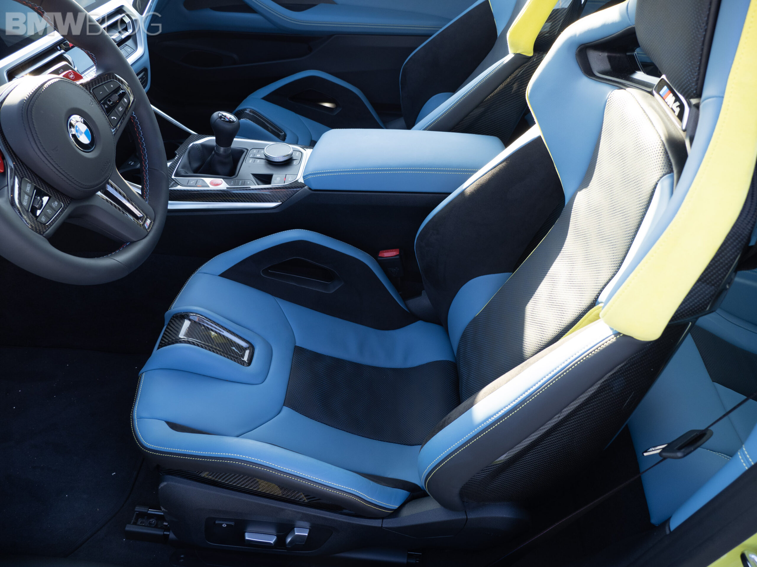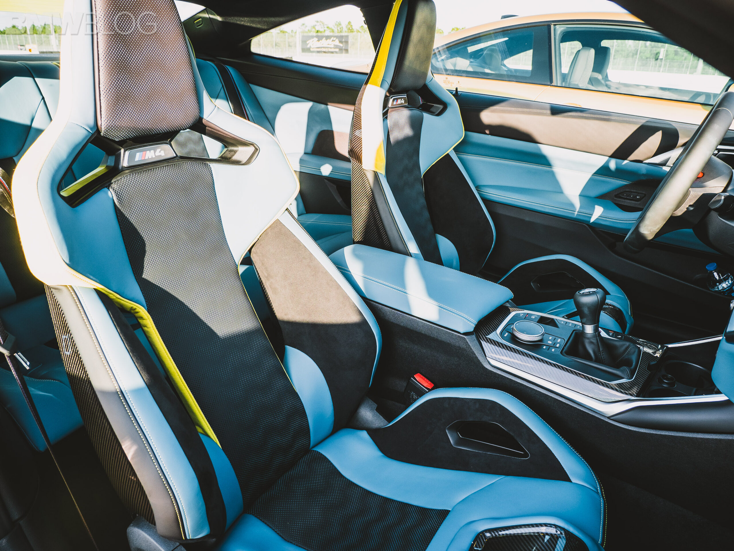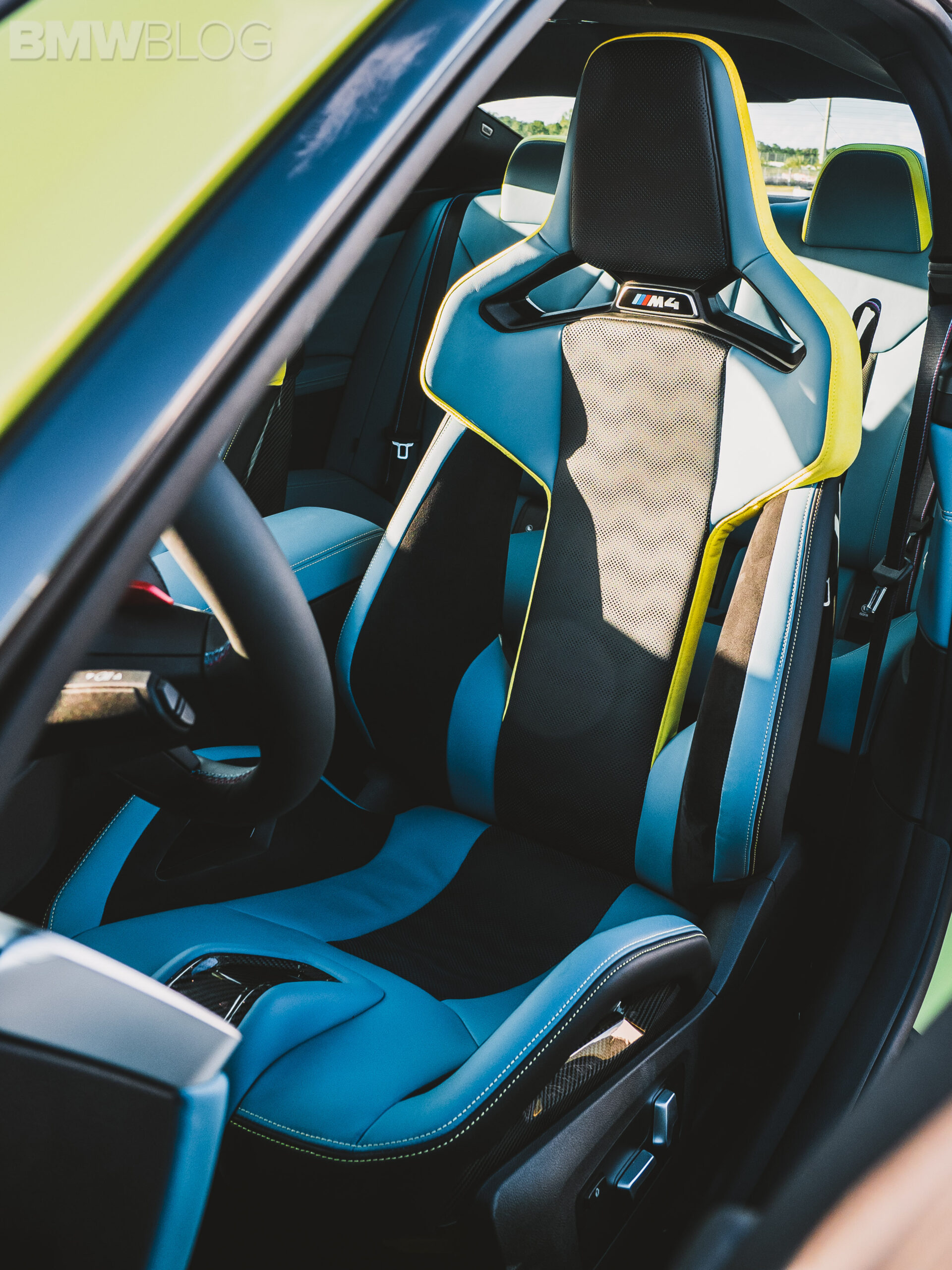 The two cars presented in Palm Beach were both rear-wheel drive and with the six speed manual. Whereas the G80 M3 in Isle of Man Green was in a stock form – no carbon fiber aero package, standard seats – the G82 M4 in Sao Paulo Yellow was decked out with the M Carbon Package, along with the carbon fiber sport seats with a BMW Individual leather.