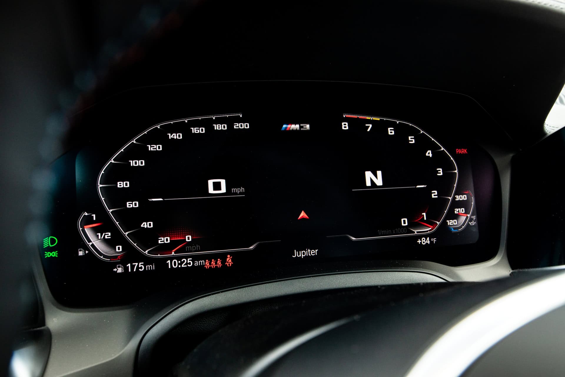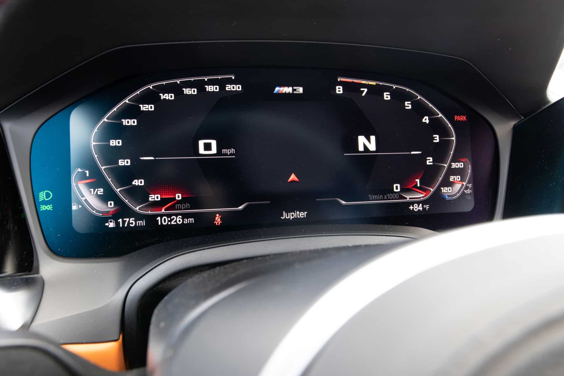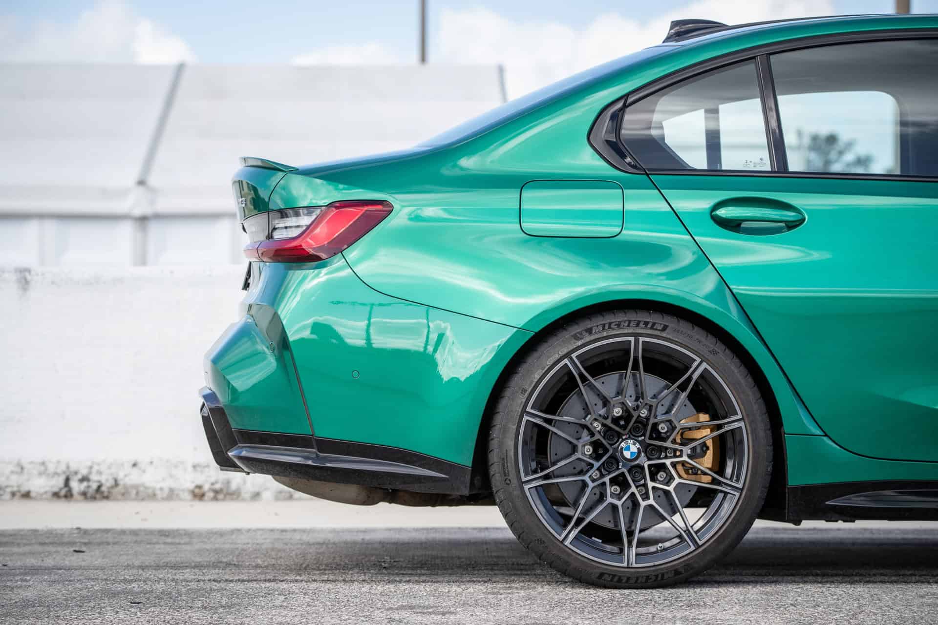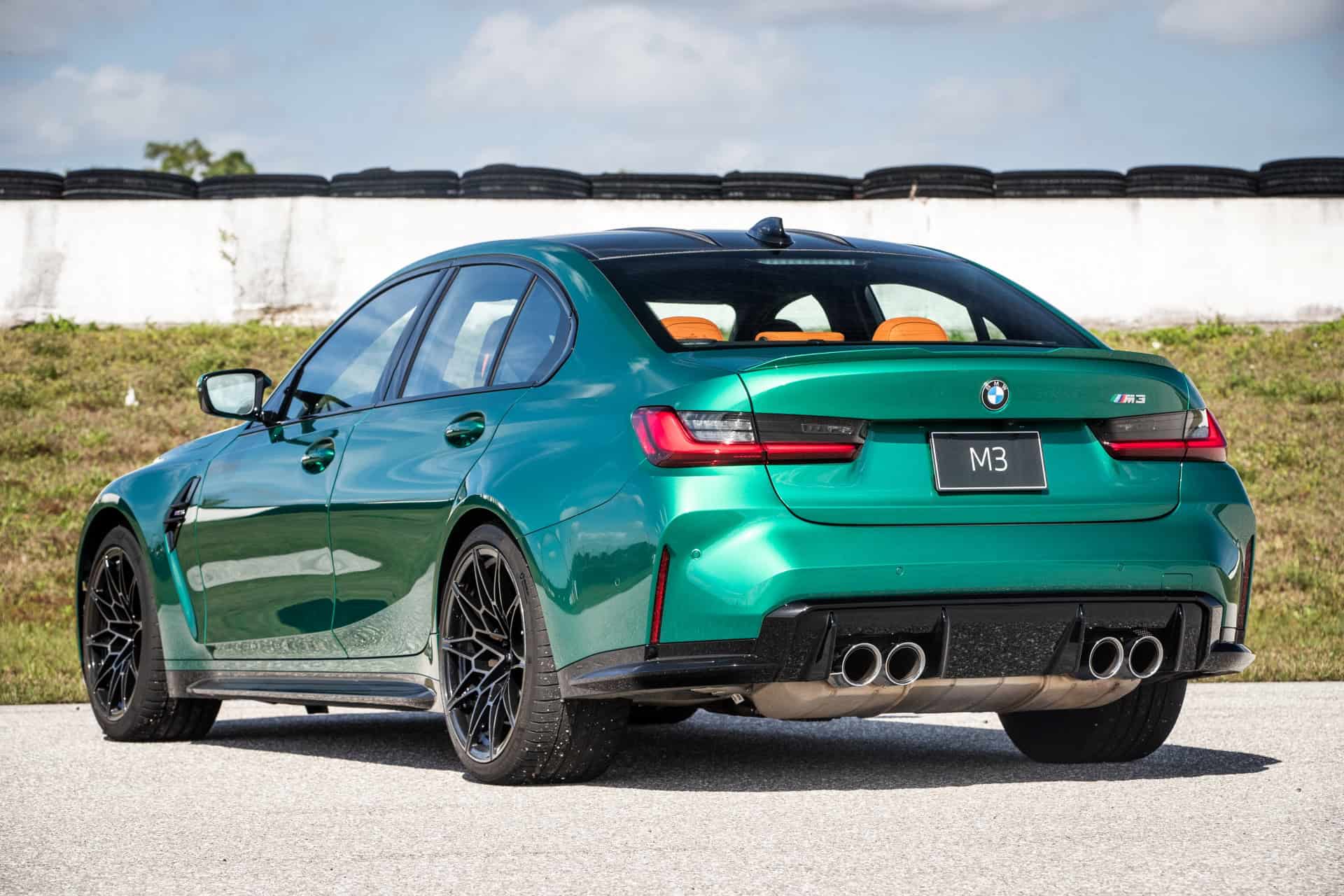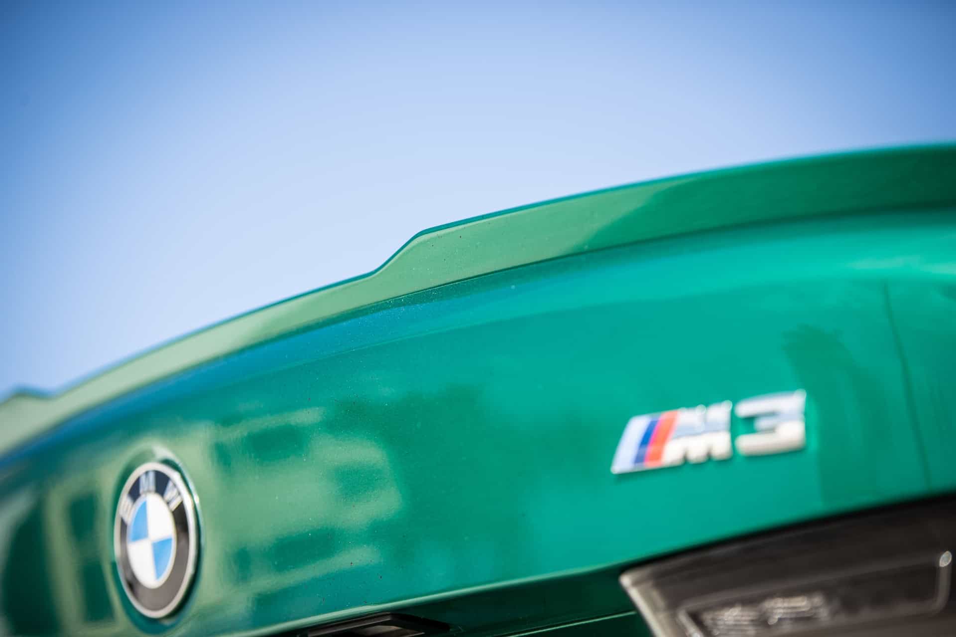 The M3 Sedan is featured in the Isle of Man Green metallic paintwork and it displays a Kyalami Orange/Black leather interior. Among other equipment, we mention the M Carbon ceramic brakes denoted by the gold-coloured callipers, the 19″/20″ 826M double-spoke, bicolor alloys and the BMW Live Cockpit Professional infotainment system.