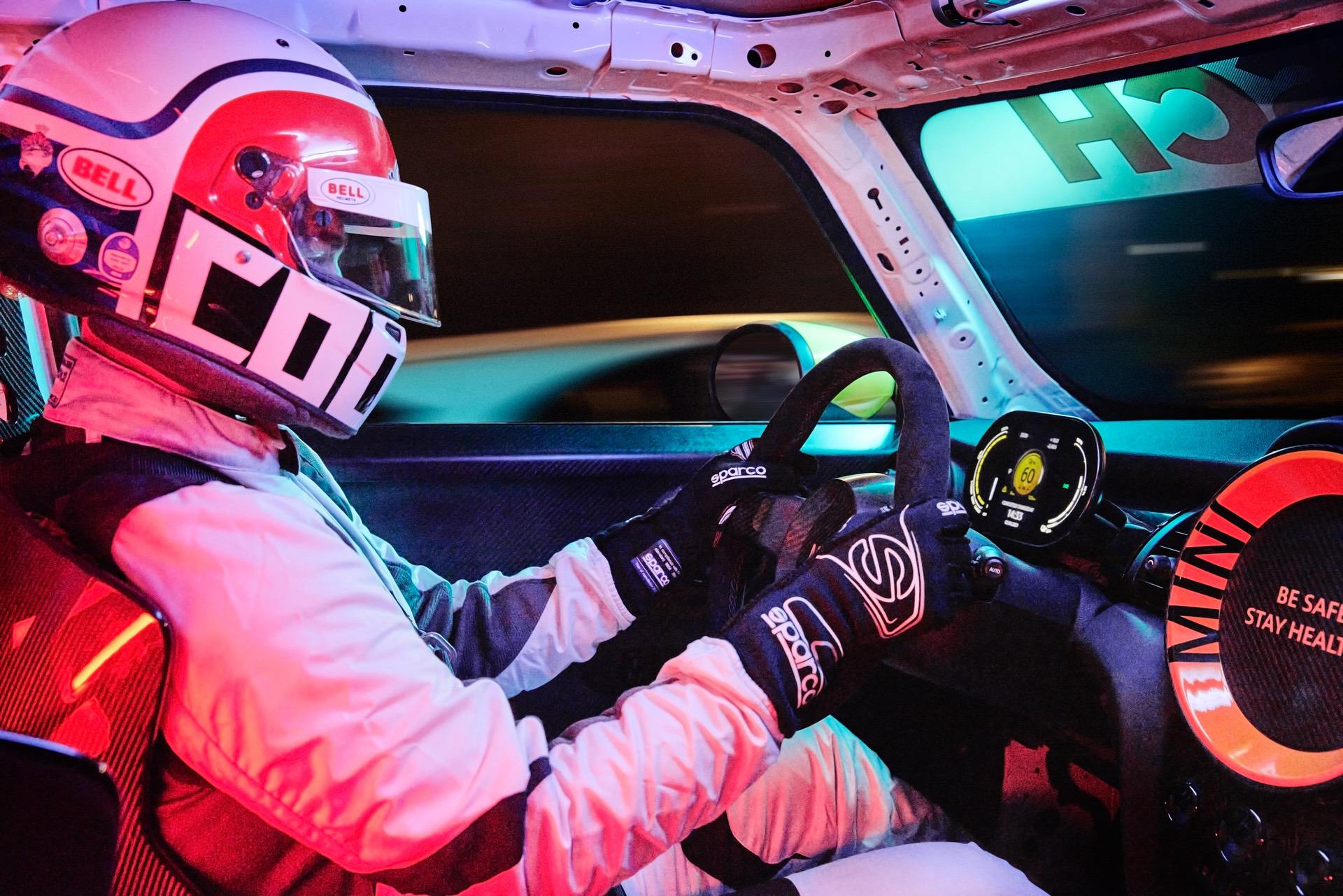 One look at the Pacesetter and it’s clear that the JCW GP was the basis for its styling. It gets similar fender blades, albeit painted rather than exposed carbon fiber, it has similar wheels, just in a different color scheme, and it has the same roof spoiler, only with a massive light bar on top. The Pacesetter wears a very cool electric-looking livery, with the MINI Electric plug logo on its roof, and the LED lights in the hood “scoop” are very slick.