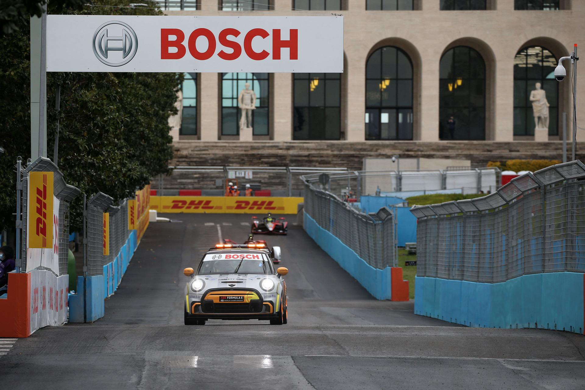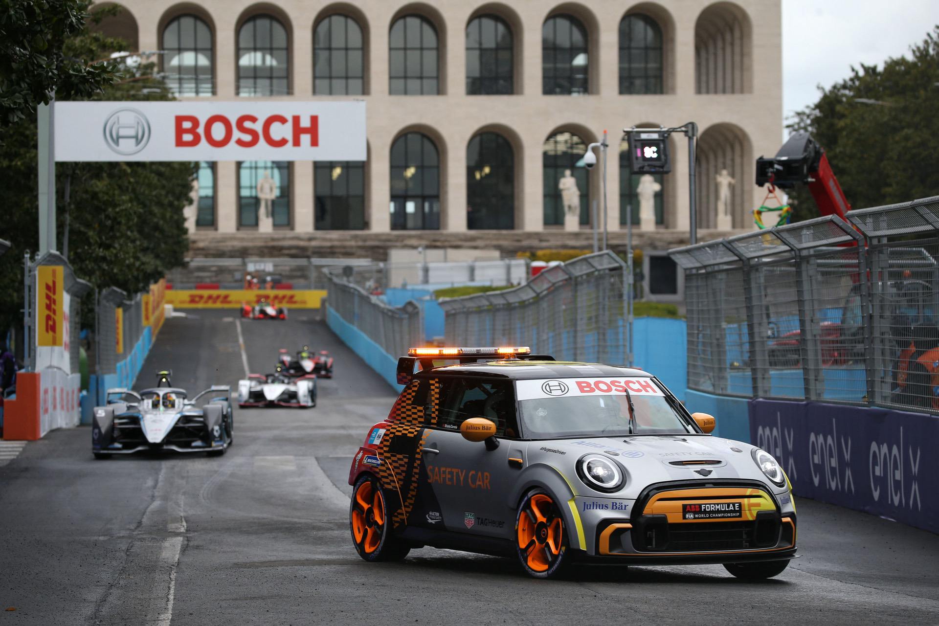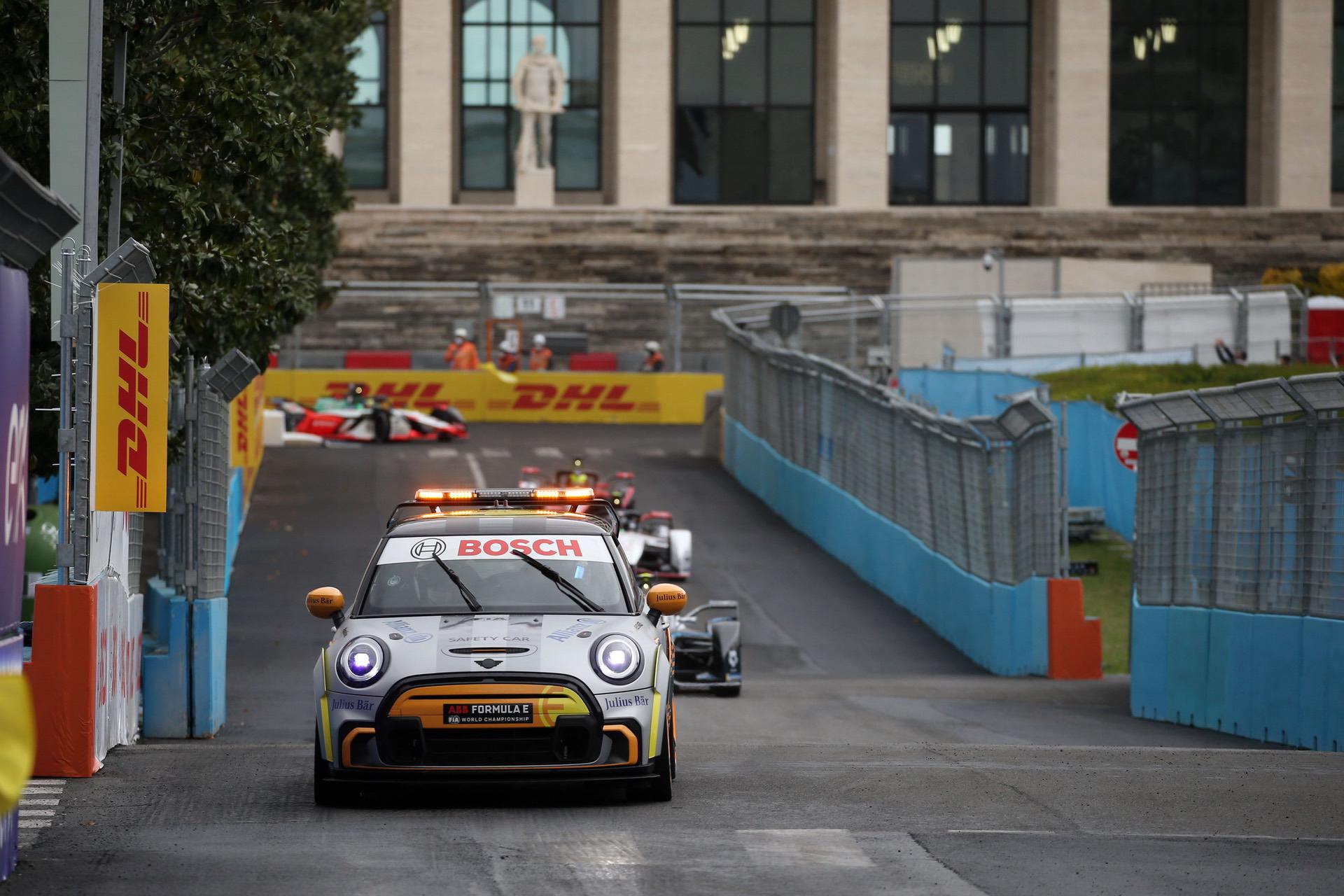 The new FIA Formula E Safety Car from BMW made its debut at Rome E-Prix: the MINI Electric Pacesetter inspired by JCW. And it was an eventful race for this electric MINI. In light of adverse weather conditions and turbulent races with several incidents, the new FIA Formula E safety car was called into action four times on its debut in Rome.