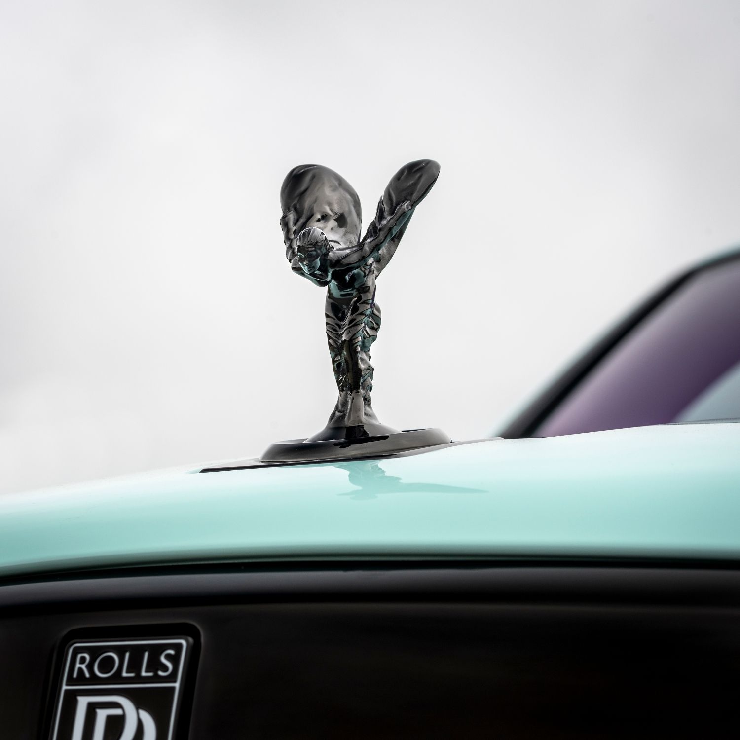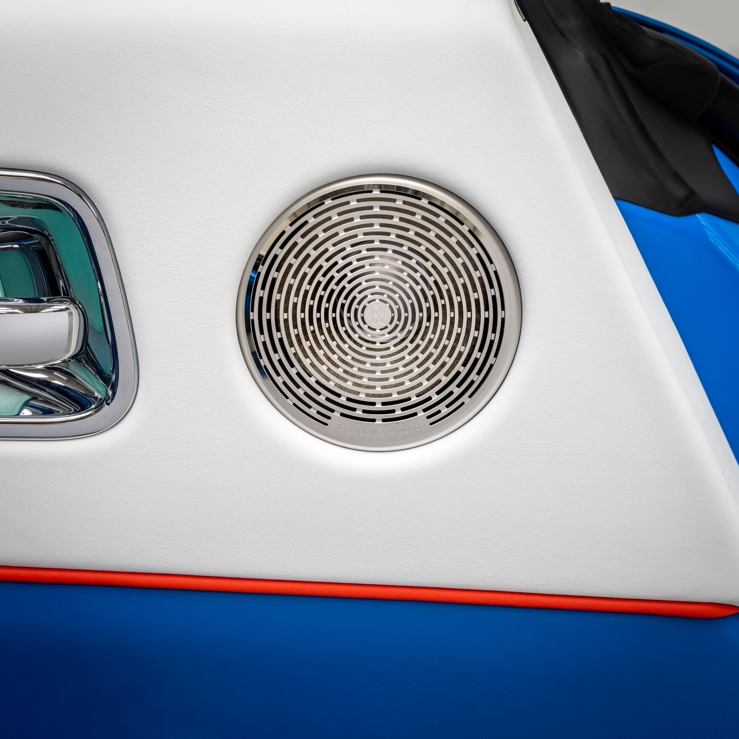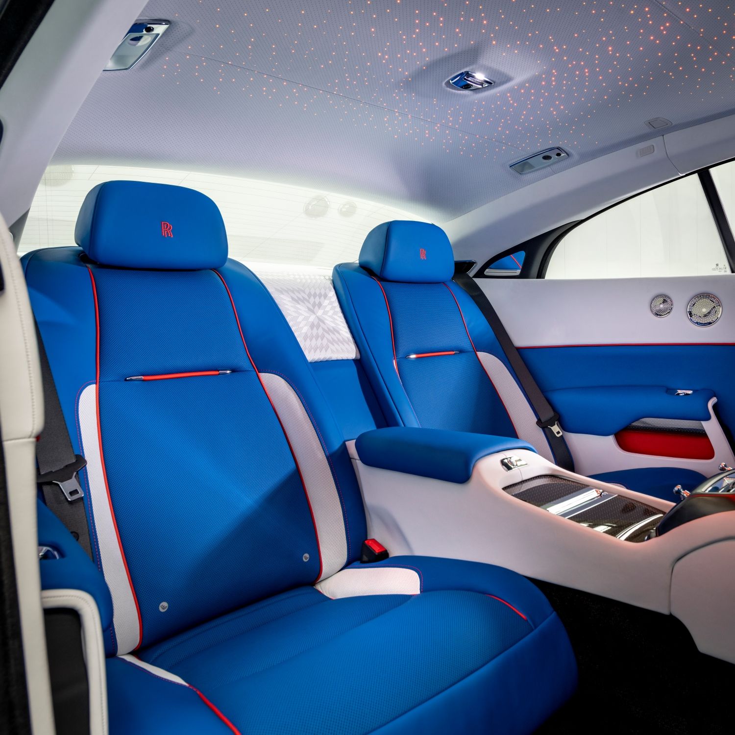 Last, but not least, the Wraith Black Badge, has a dramatic use of color. The two-tone Bespoke GT Blue and Arctic White coachwork is finished with a hand-painted Koi Red coachline and resolved with a bold motif, inspired by a volcanic eruption against a menacing blue sky. Flashes of Koi Red are also presented on the Muscari Blue and Arctic White interior that features a red Starlight Headliner.