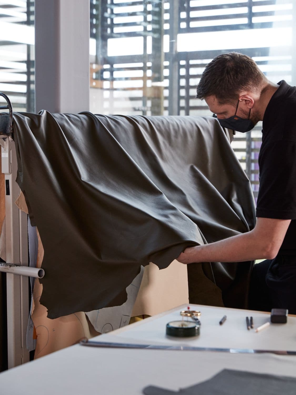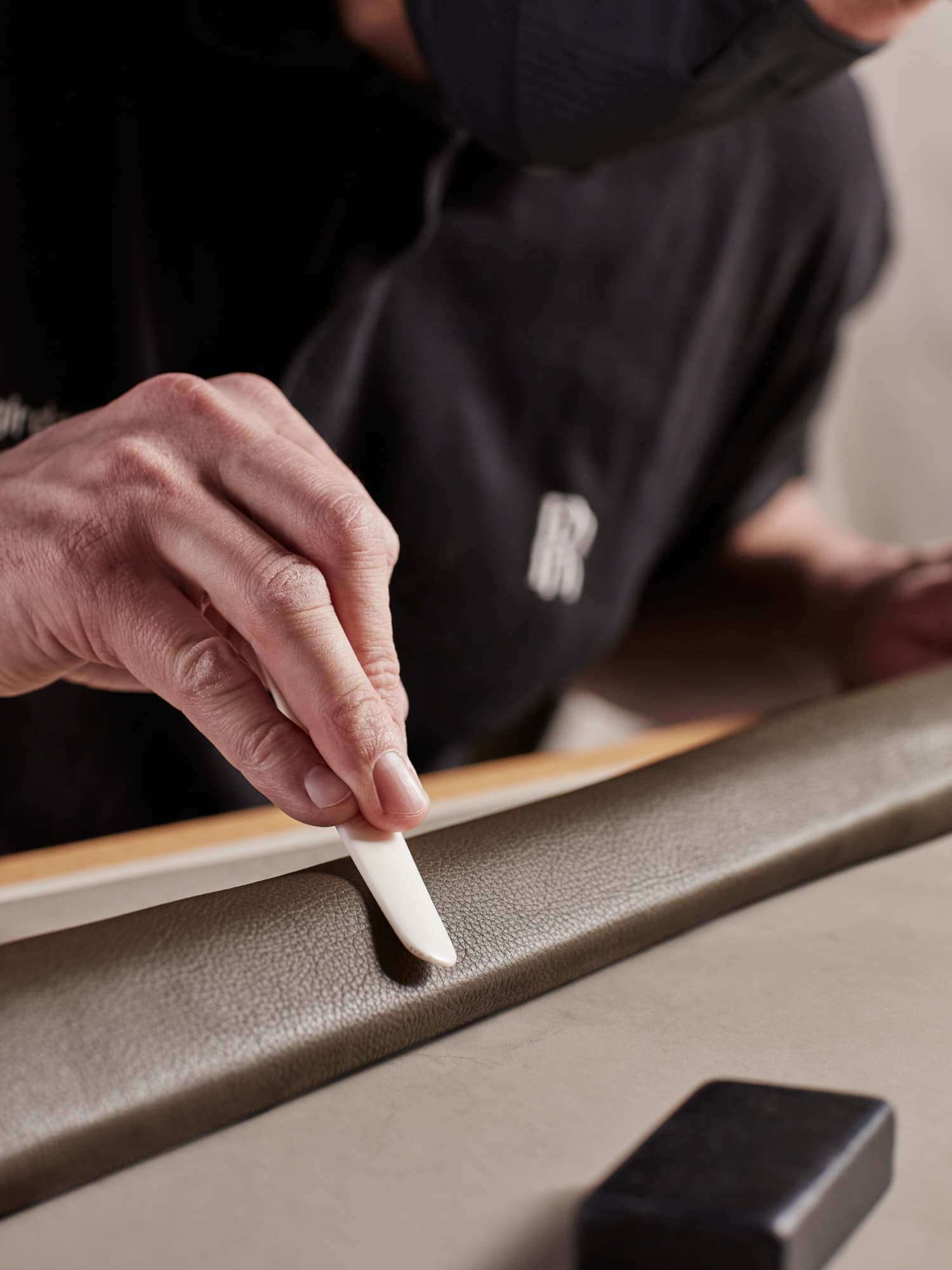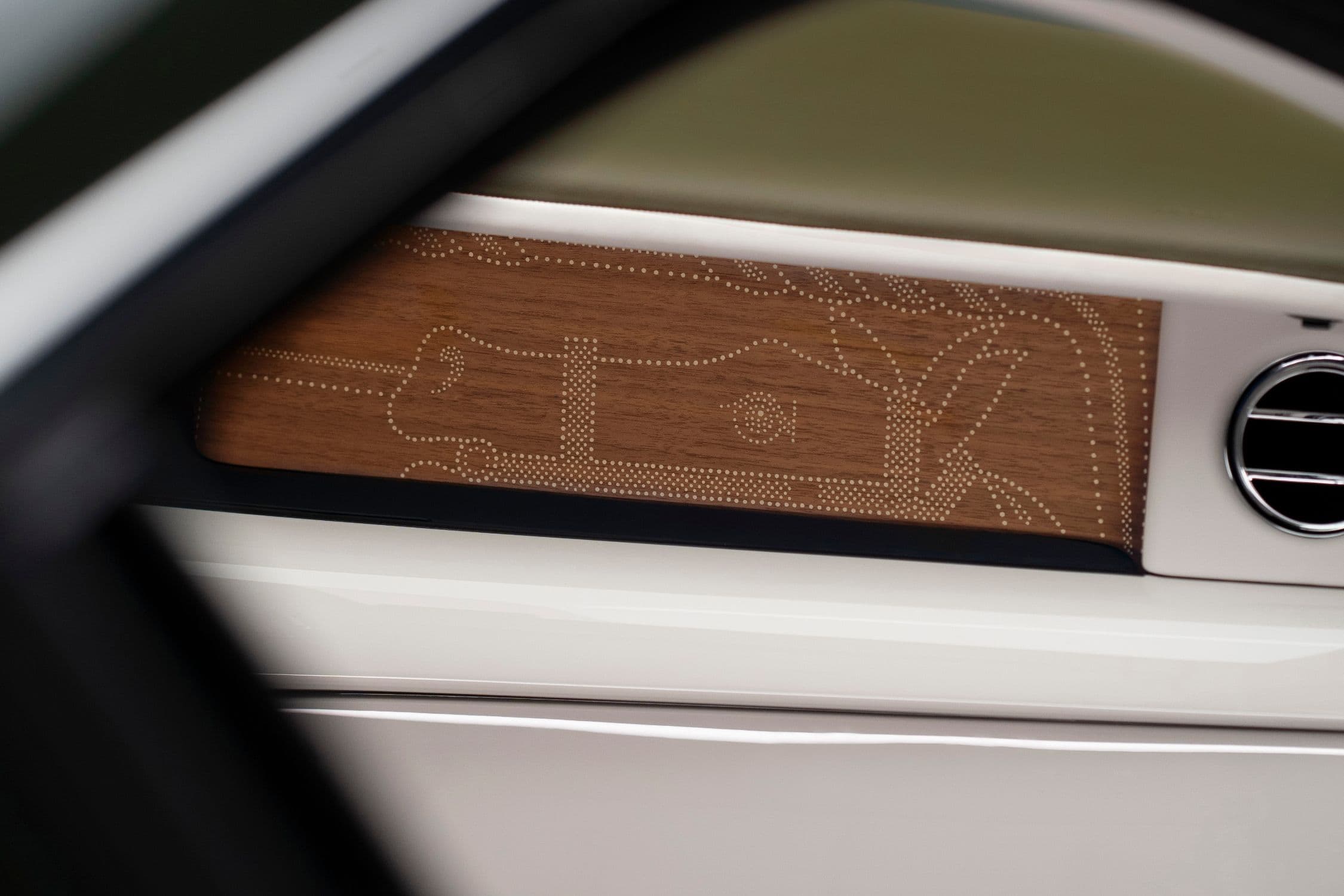 The interior is finished predominantly in Hermès Enea Green leather, extending to details that include the immediate touch-points of the client; for example, the steering wheel, duchess handles, gear selector and the rotary controls for the motor car’s climate settings. The Hermès leather was also used on the upper instrument panel, interior pillars and parcel shelf. It also enrobes less visible surfaces including the glove compartment and luggage compartment lining, centre console, decanter stowage compartment and Champagne cooler.