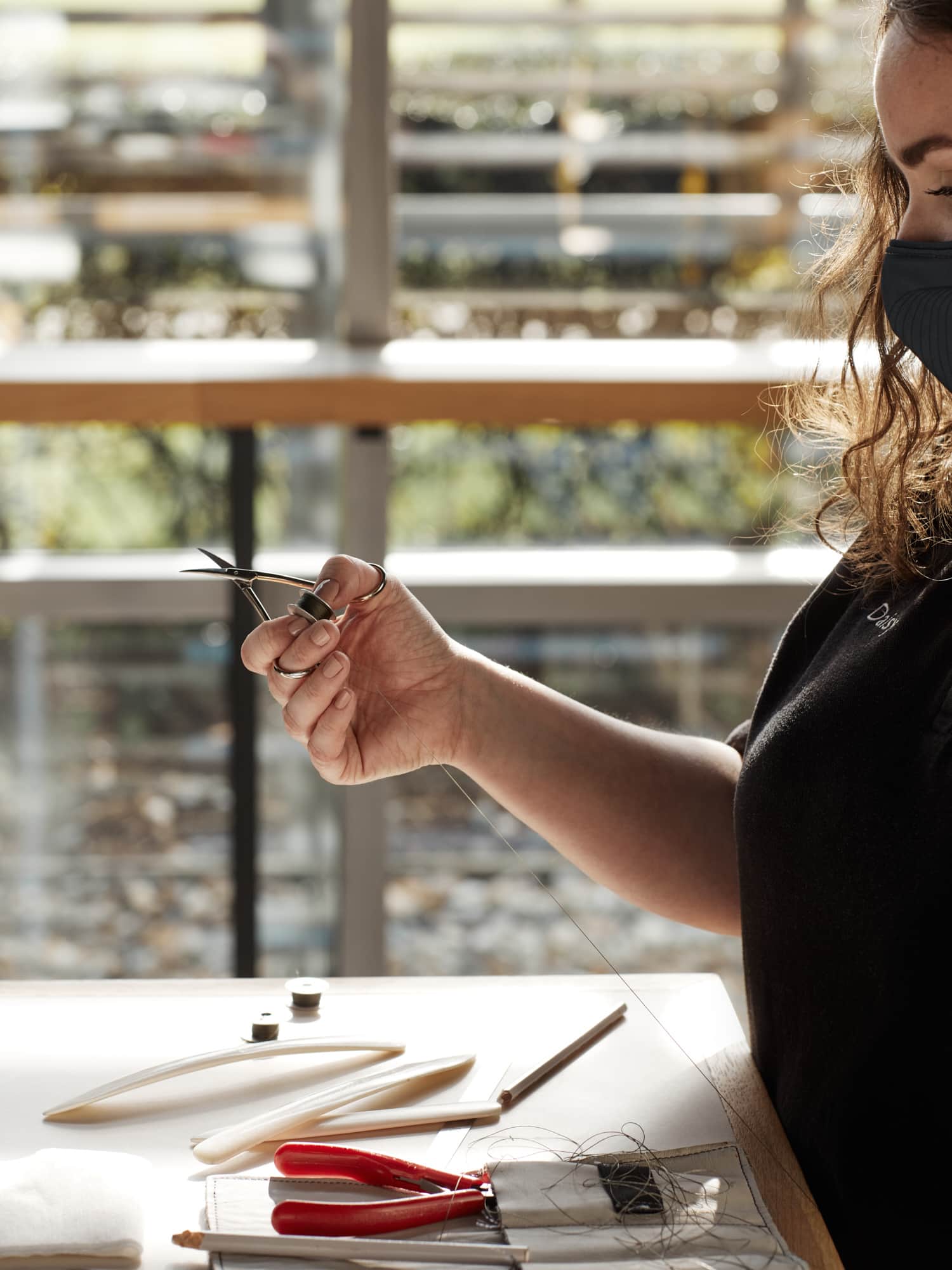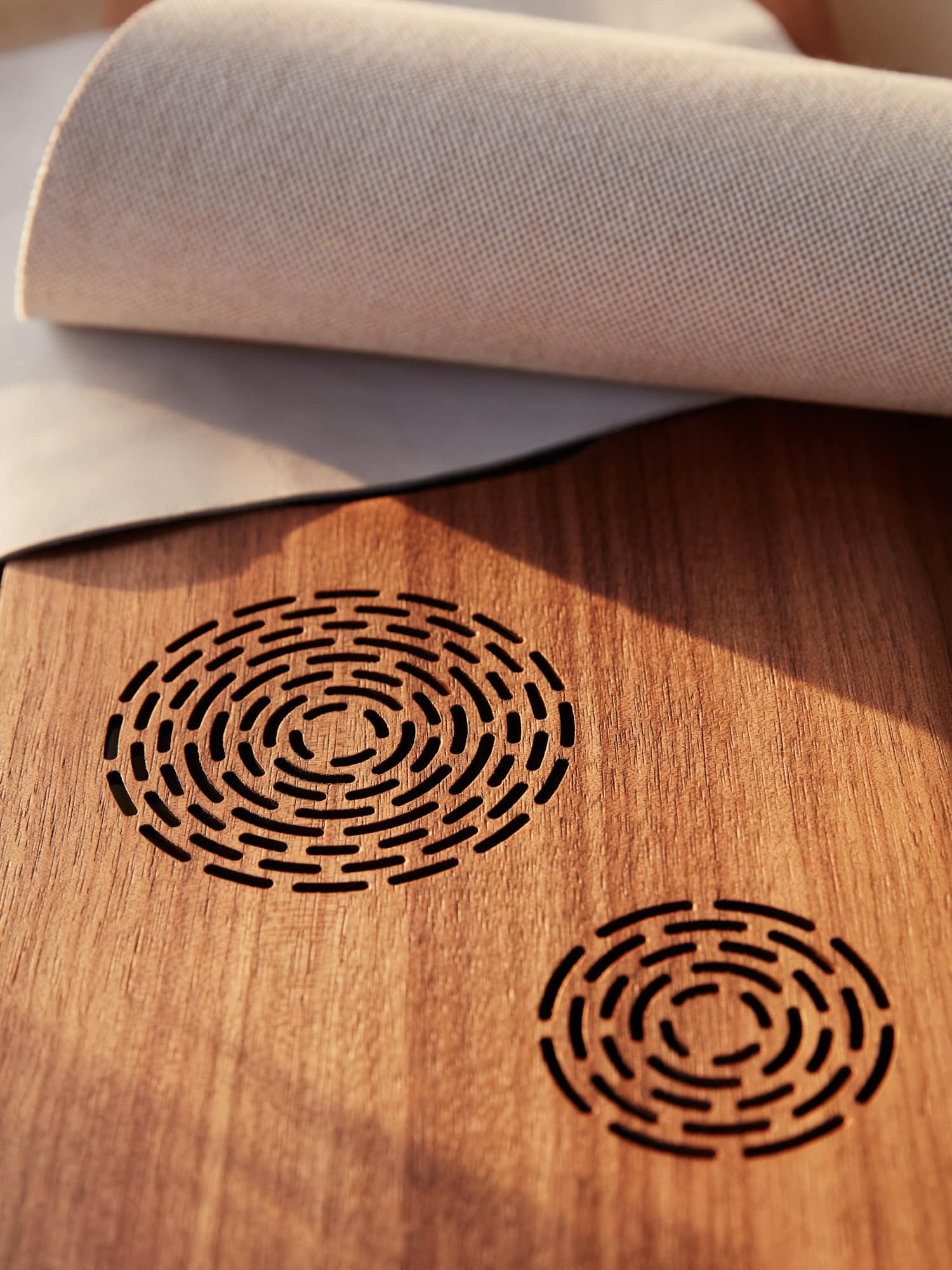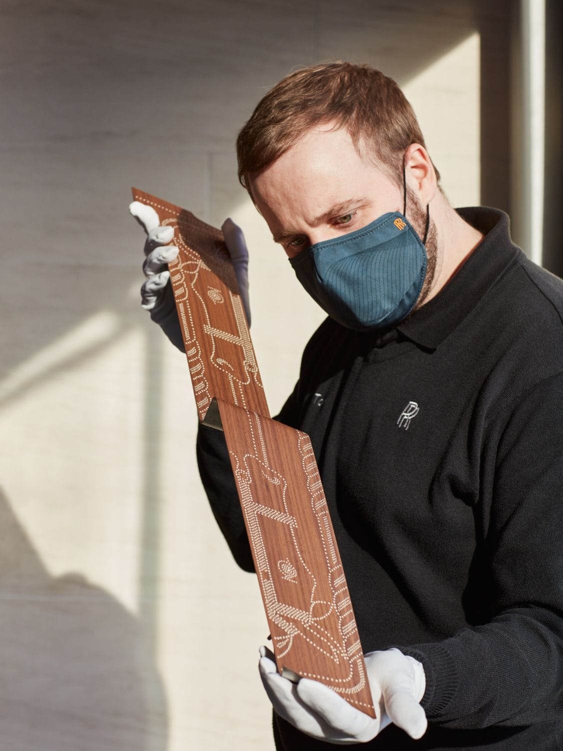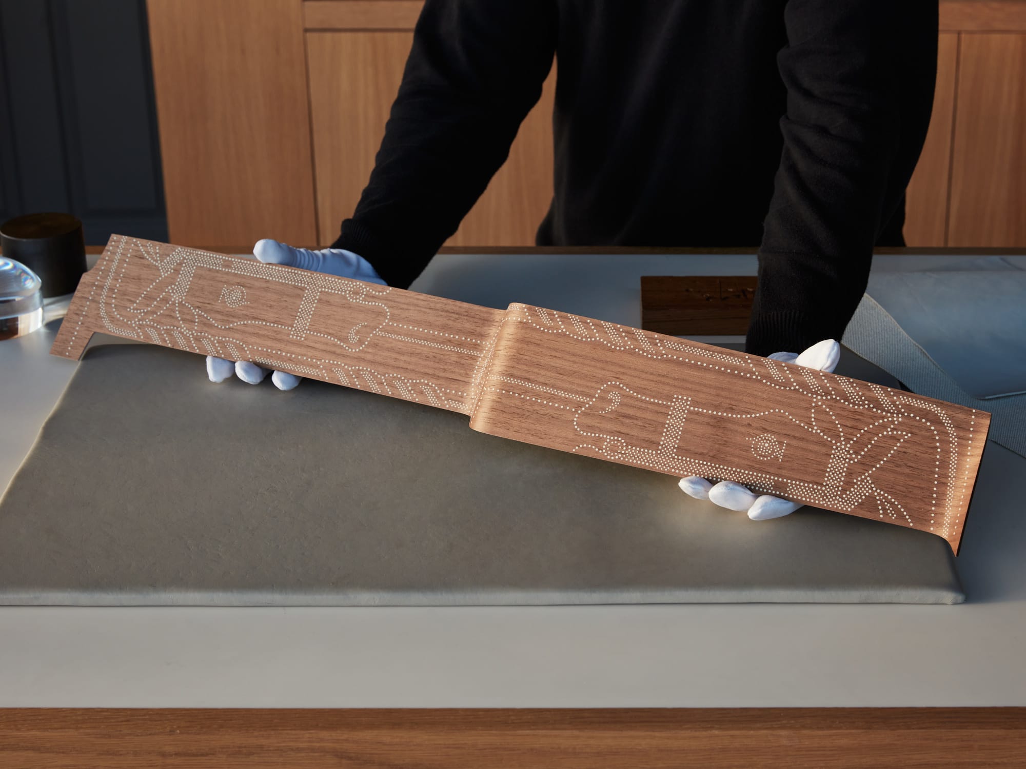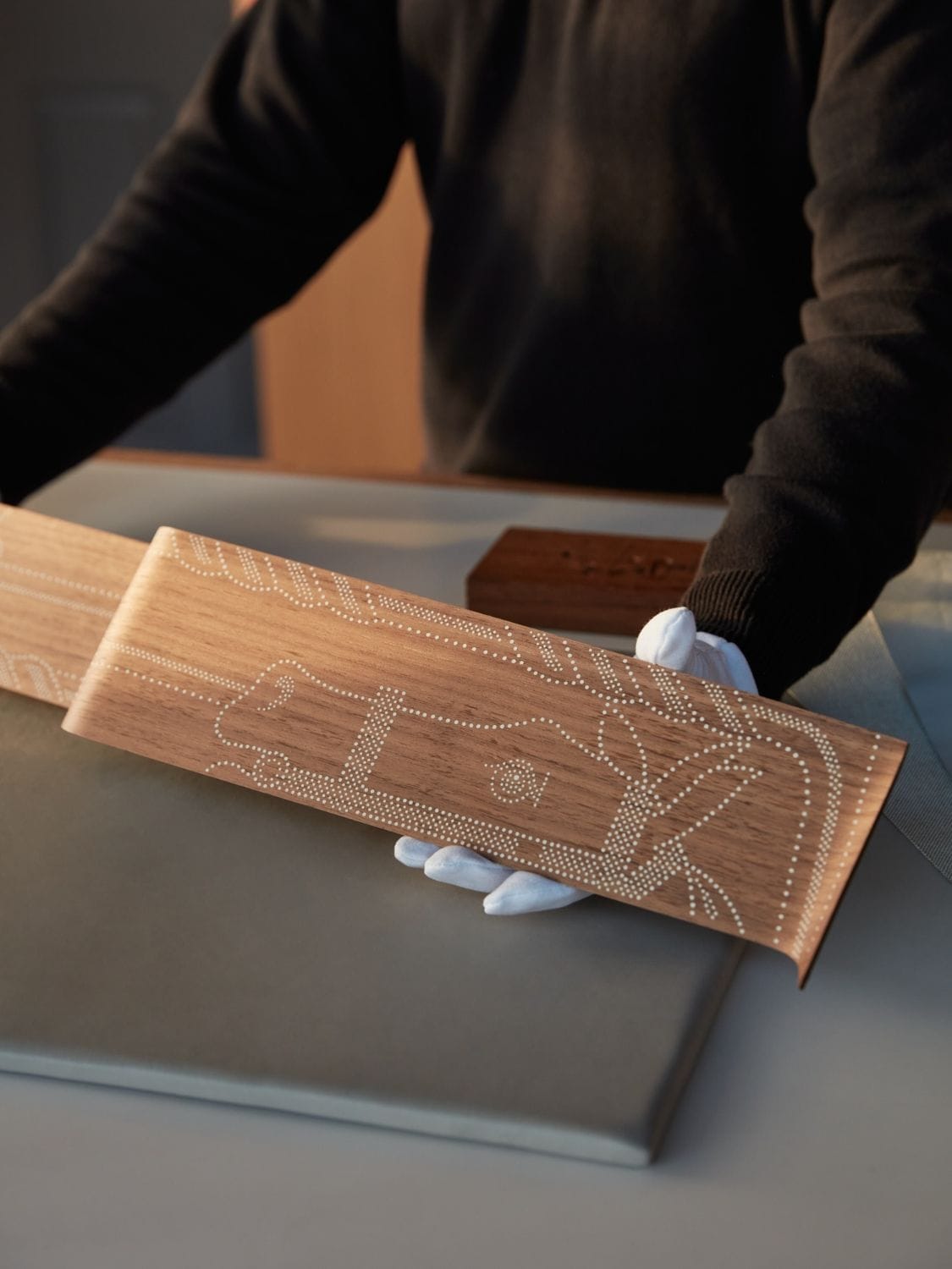 For this Phantom’s Gallery, Hermès commissioned an artwork based on a design by the celebrated French artist and illustrator Pierre Péron (1905–1988) who created many of the House’s iconic scarves. The work, inspired by the famous Hermès horse motif, is hand-painted on Open Pore Royal Walnut and is presented as though staged in an art gallery, behind glass.