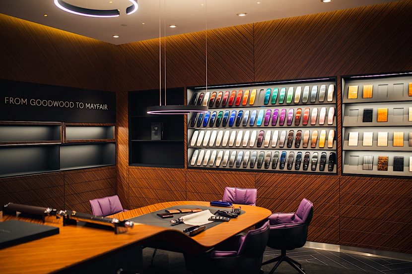 The true heart of the store is the Atelier, which houses samples of surface finishes, wood veneers, leathers, embroidery threads and numerous lambswool samples and fabrics. Other options on view include convertible hood fabrics and headliners, plus wheel options.