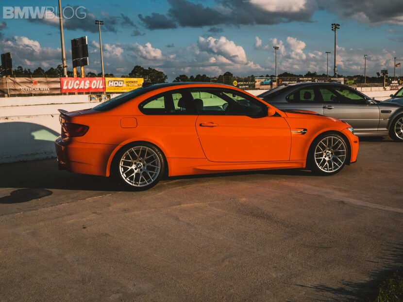 On the inside, this G-Power E92 BMW M3 is about as far from stock as it gets. The seats have been replaced with racing buckets and four-point harnesses. The steering wheel has a new rim, with orange leather at the nine and three o’clock positions, it has orange Alcantara trim, and Alcantara-covered center console and shifter, and a boost screen where one of the front air vents used to be.