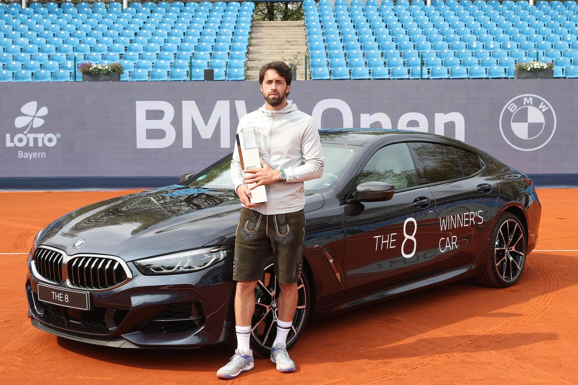 Nikoloz Basilashvili from Georgia is the recipient of a beautiful and unique BMW 8 Series Gran Coupe. Basilashvili won last week the BMW Open tennis tournament in Munich and therefore secured the top prize: a Macau Blue 8 Series. In addition, the winner in Munich receives the traditional Bavarian lederhosen as a reminder of his triumph. In the final, the Georgian prevailed 6:4 and 7:6 (5) over the German Jan-Lennard Struff. The win also came with a speedy record: only 86 minutes to close the final in his favor. Furthermore, Basilashvili hasn’t lost a single set in the entire BMW Open.