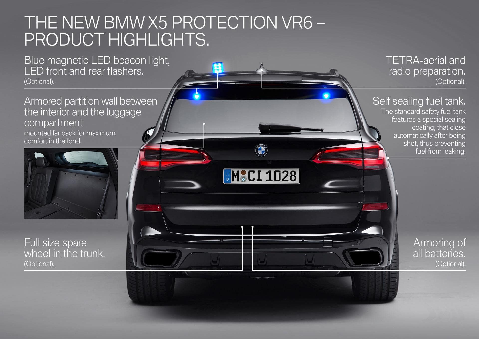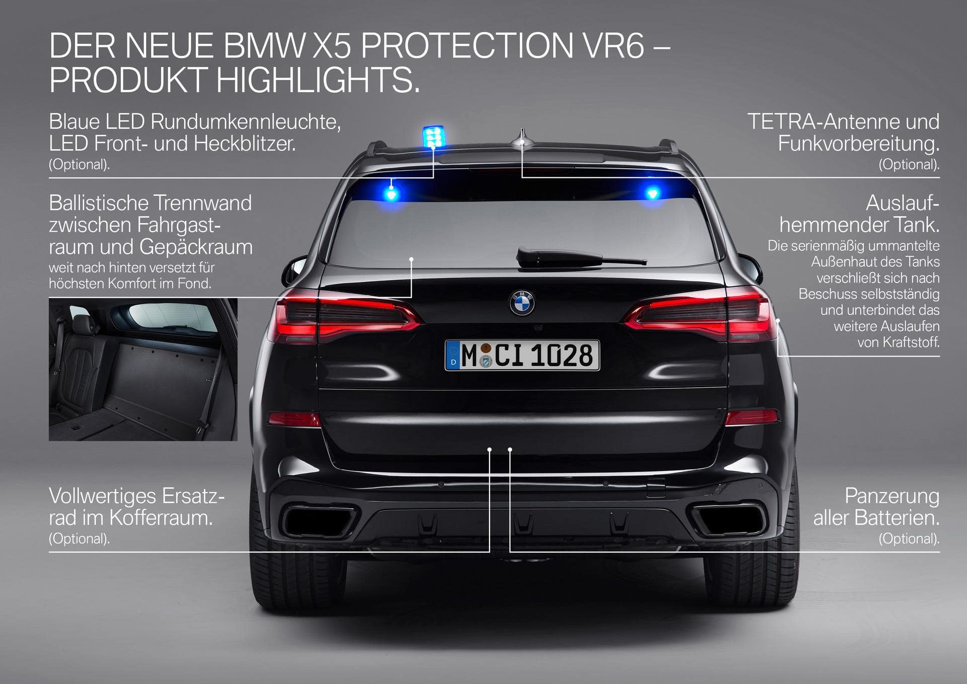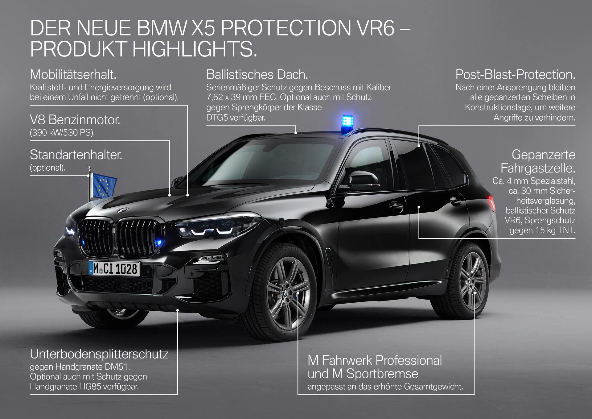 Innovative so-called Post Blast Protective Technology for the security glazing ensures particularly effective protection against secondary attacks. Even following a blast, all windows remain firmly in position, thus eliminating any formation of gaps between glazing and body. The armor-plated floor offers protection against hand grenades of the type DM51. Enhanced underbody reinforcement comprising fibre composite materials, which also withstands attack by hand grenades of the type HG85, is optionally available.