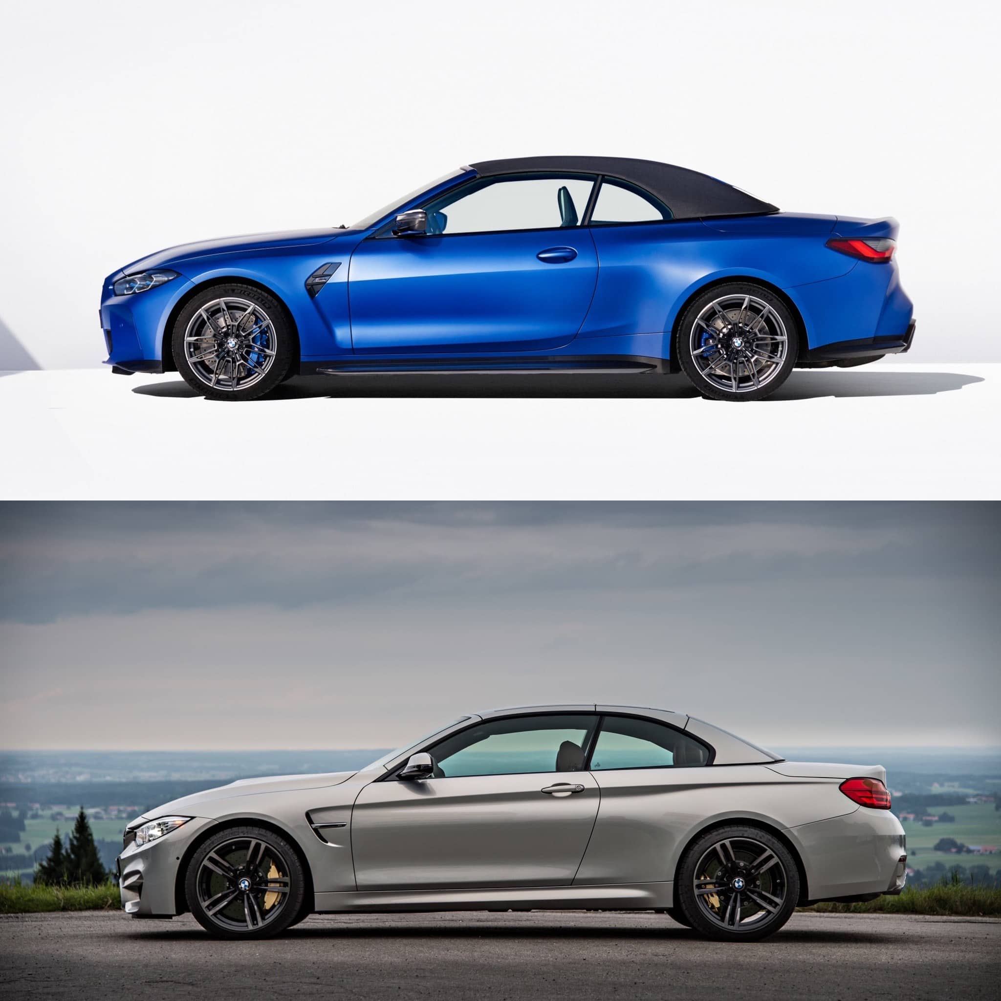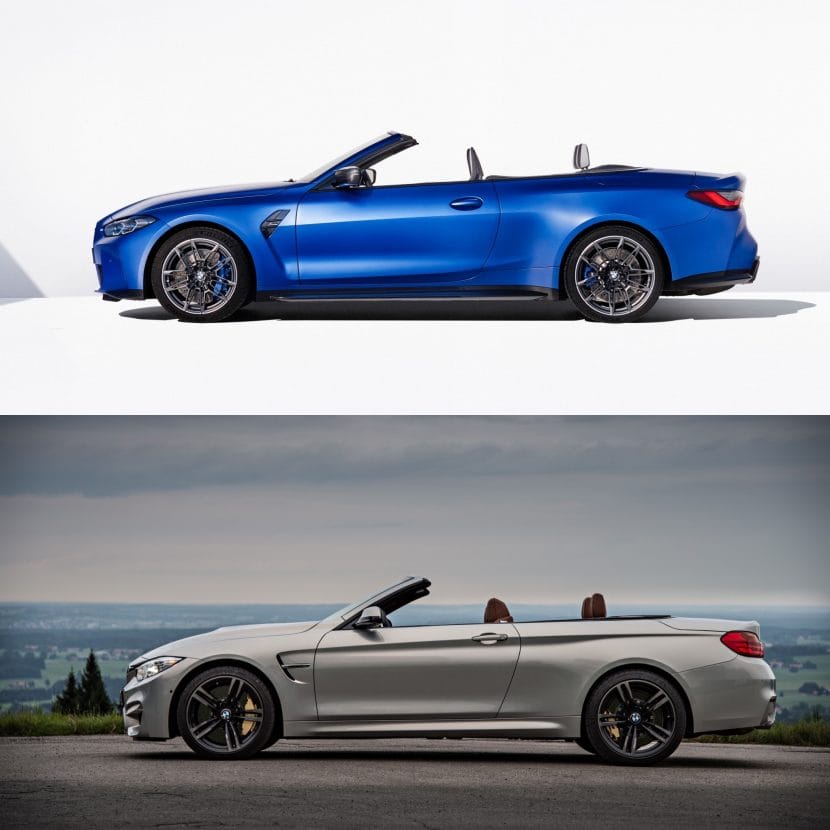 The rest of the comparison is more interesting, though. In profile, the new BMW M4 Convertible is actually a very handsome thing. it’s sleek, sporty, and well-proportioned. With the roof down, it looks like a proper sporty convertible. With the roof up, it looks classy and sophisticated. While the outgoing F83 M4 isn’t bad looking at all, it just looks a but frumpy compared to the new G83. Also, with the folding metal roof up, the old car looks like an M4 Coupe that’s been drawn by memory by a five year old. The new soft-top roof of the G83 is a bit improvement and why it wins this part of the comparison.