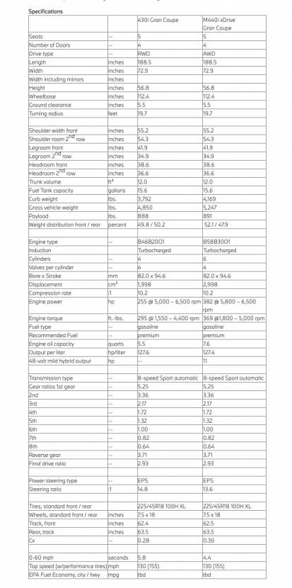 Like with its two-door sibling, the BMW M440i Gran Coupe will get a 3.0 liter turbocharged I6 under hood, making 382 horsepower (374 horsepower in Europe) and 369 lb-ft of torque. Also like the coupe, the M440i Gran Coupe’s engine is a mild hybrid, with a 48-volt starter generator that acts as a small electric motor and can assist the engine with an electric boost of 11 horsepower. That increases both efficiency and power, giving the engine a boost under acceleration and sharpening the engine’s response off the line or at low rpm.