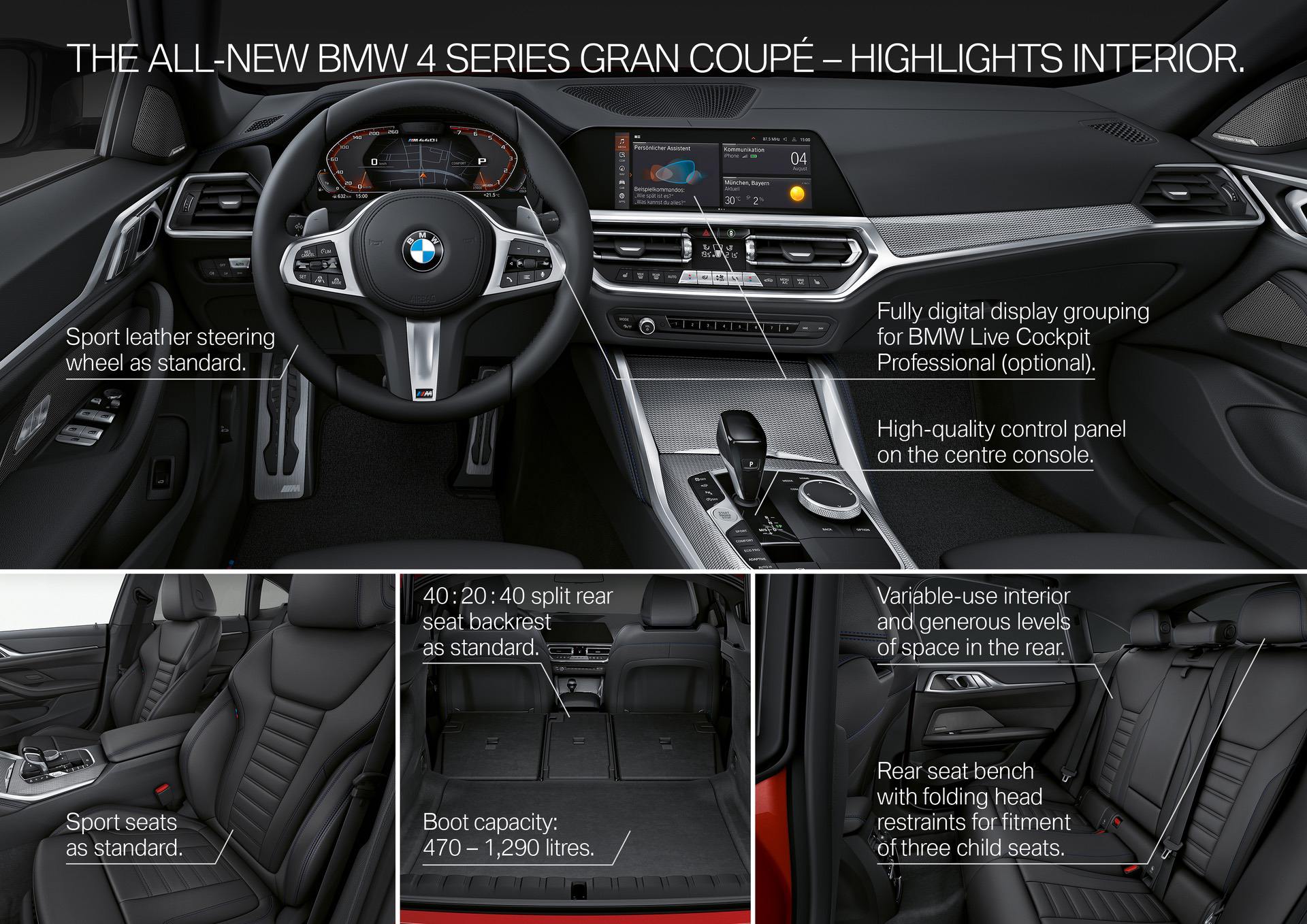 There will also be a couple more models for the European market. Both the BMW 420i Gran Coupe and 420d Gran Coupe will be available across the Atlantic. The BMW 420i Gran Coupe gets a 2.0 turbocharged four-cylinder engine with 184 horsepower and 221 lb-ft of torque, an eight-speed auto, and rear-wheel drive. According to BMW, 0-62 happens in 7.9 seconds and return 7.3 – 6.6 l/100 km (38.7 – 42.8 mpg imp).