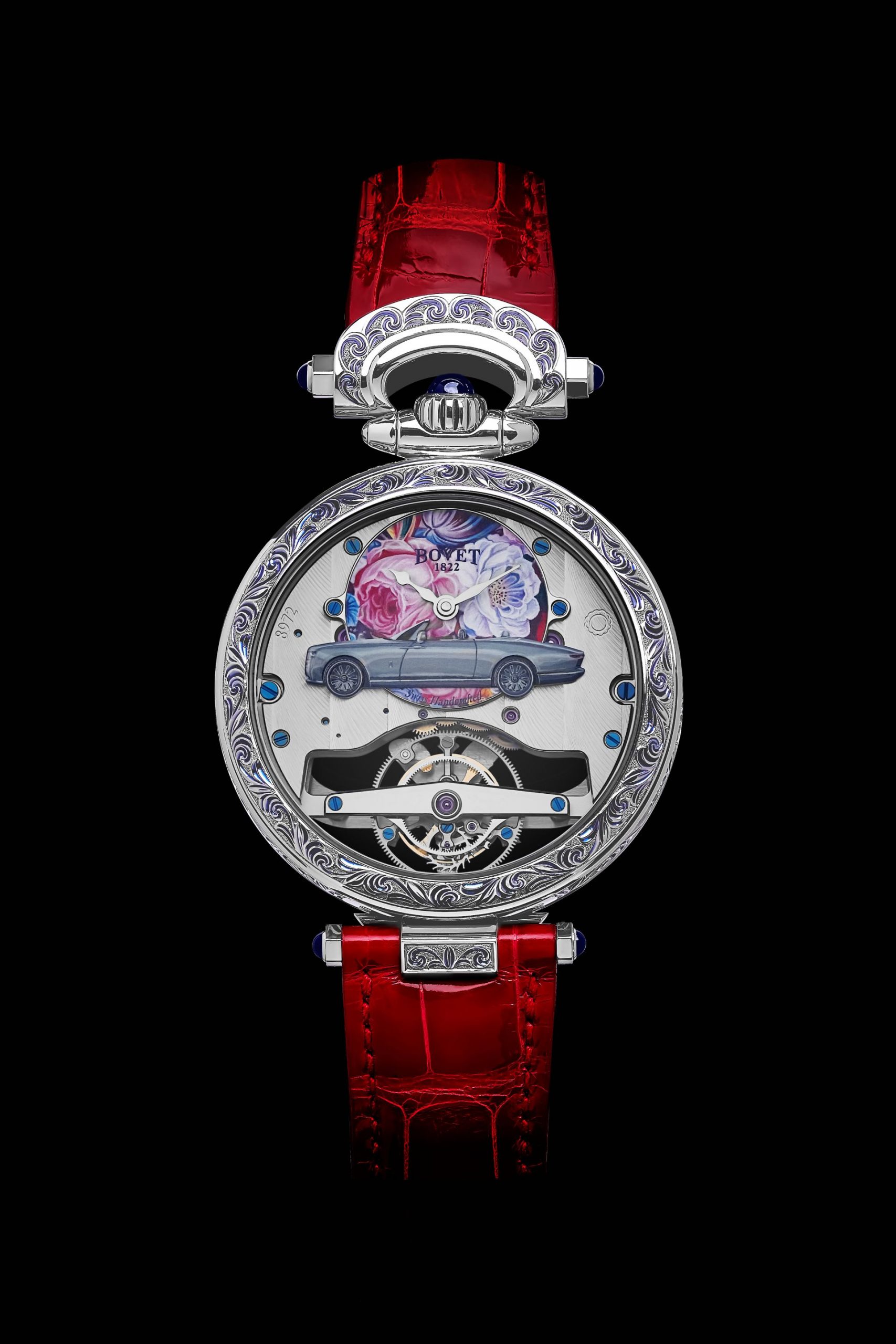 On the reverse side, the dials are more individual. The gentleman’s features an aventurine dial with the celestial arrangement of the night sky over the place of his birth on his birth date; the lady’s is decorated with an ornate miniature painting of a flower bouquet on a mother-of-pearl dial. This design is a traditional BOVET 1822 motif, chosen by and personalized for the owner. Both reverse dials have hand-engraved Bespoke sculptures of Boat Tail, complete with wheels, door handle, mirrors and other fine details.