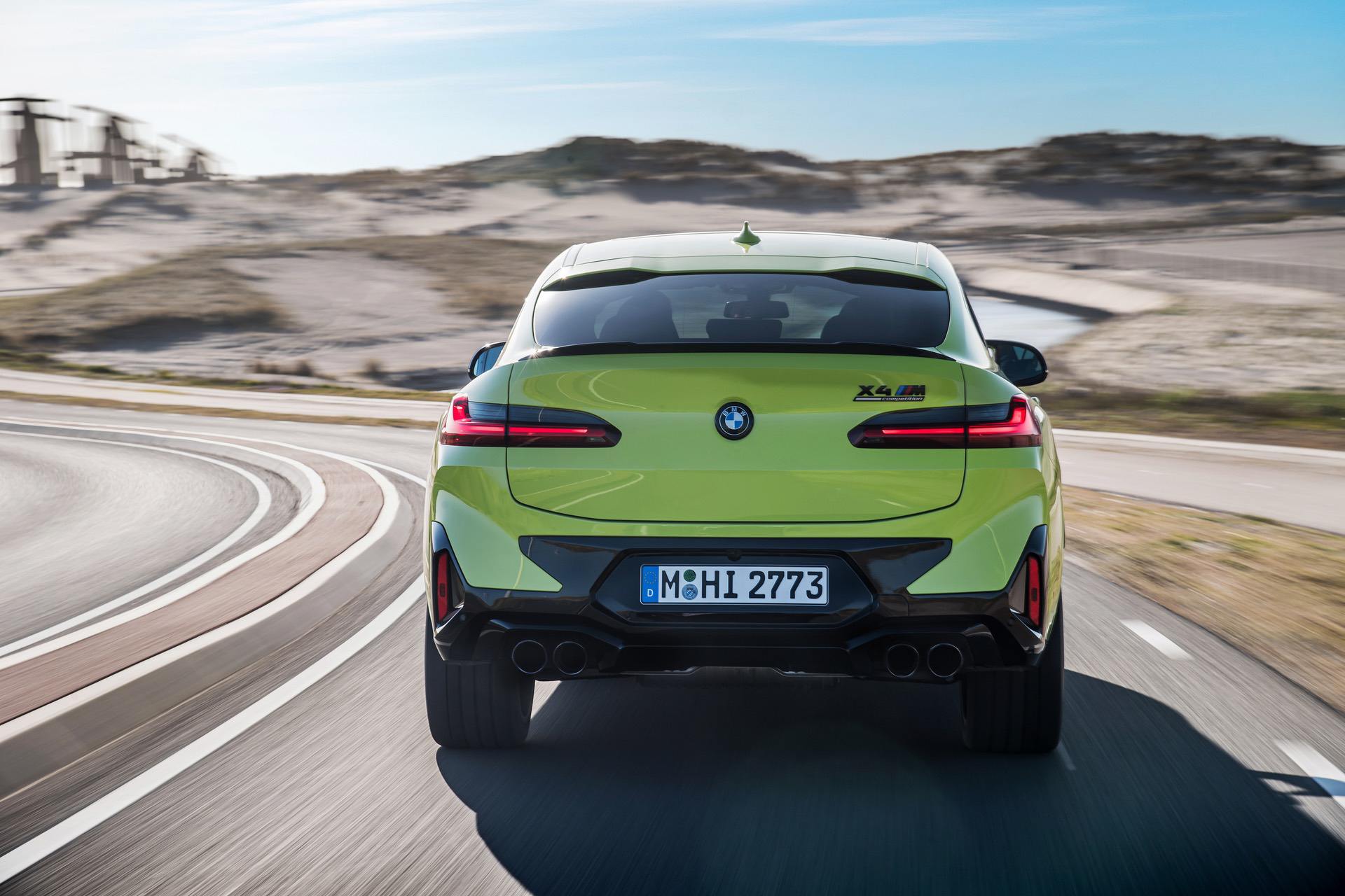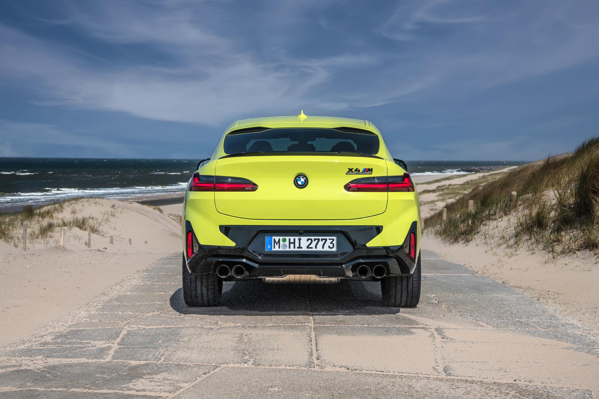 In the back, the X4 M retains the typical coupe shape with a spoiler is mounted on the trunk lid. Optional M Carbon exterior mirrors and, on the BMW X4 M, a CFRP rear spoiler are available. The new rear bumper of the BMW X4 M features a wide, offset insert in the shape of an anvil. Like the lateral air-curtain-panels, which also accommodate the now vertical reflectors, this is finished in high-gloss black.