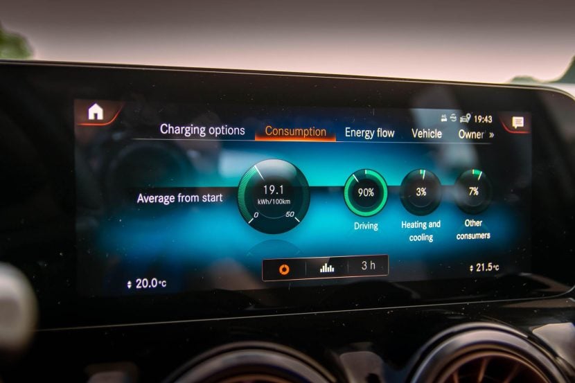 In those conditions, I saw the energy consumption of the EQA stay around the 20-kWh range per 100 kilometers covered around town. Mind you the AC was always on, because it was getting kind-of hot at times and I only used comfort mode. The average speed recorded was 20 km/h. That means your average range in these conditions would add up to about 330 kilometers with a full charge (205 miles). Quite off from the claimed figures and this was in almost perfect weather.