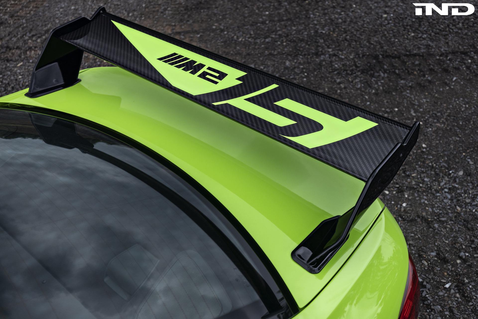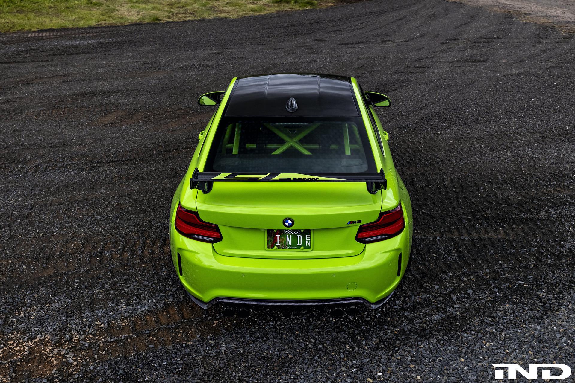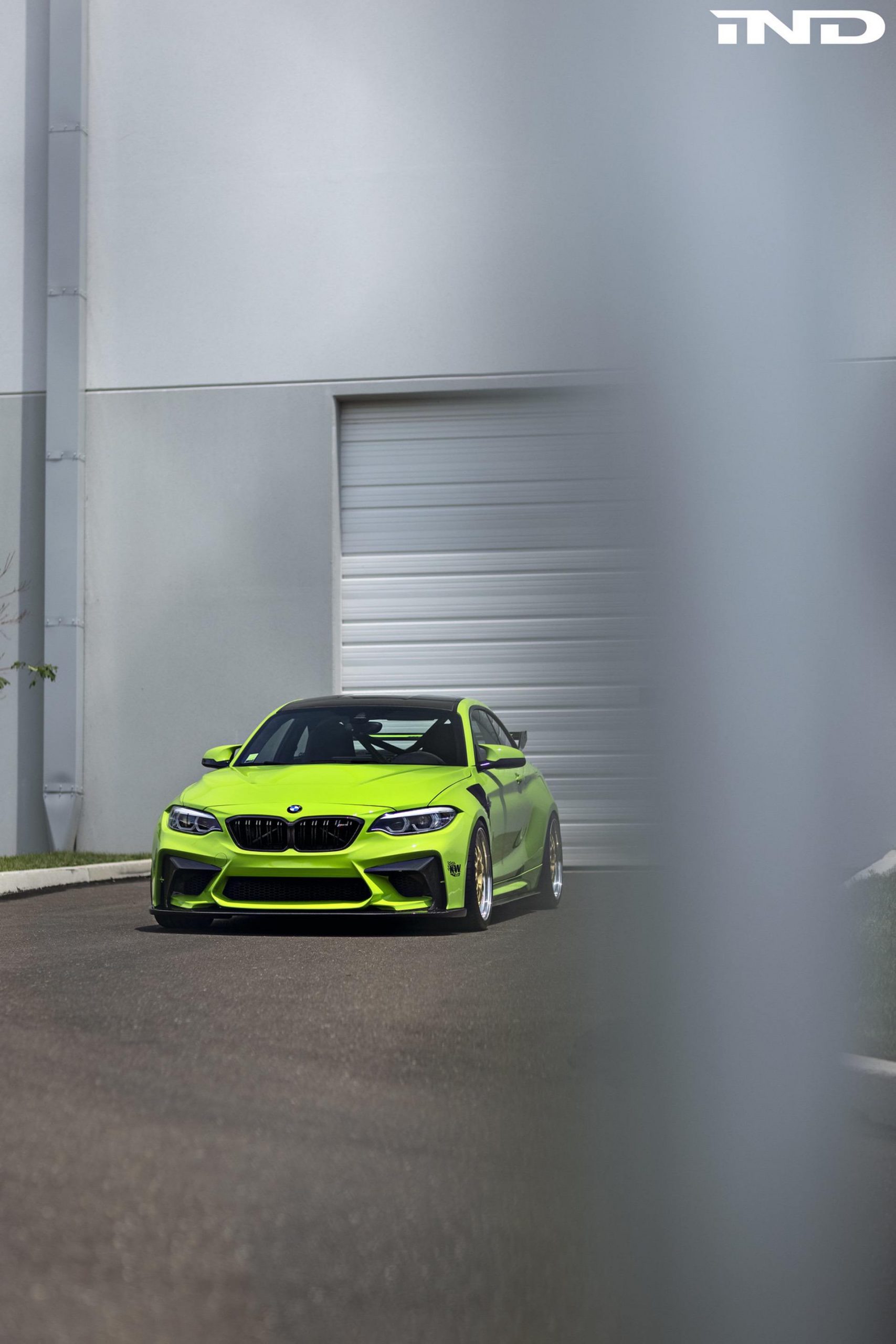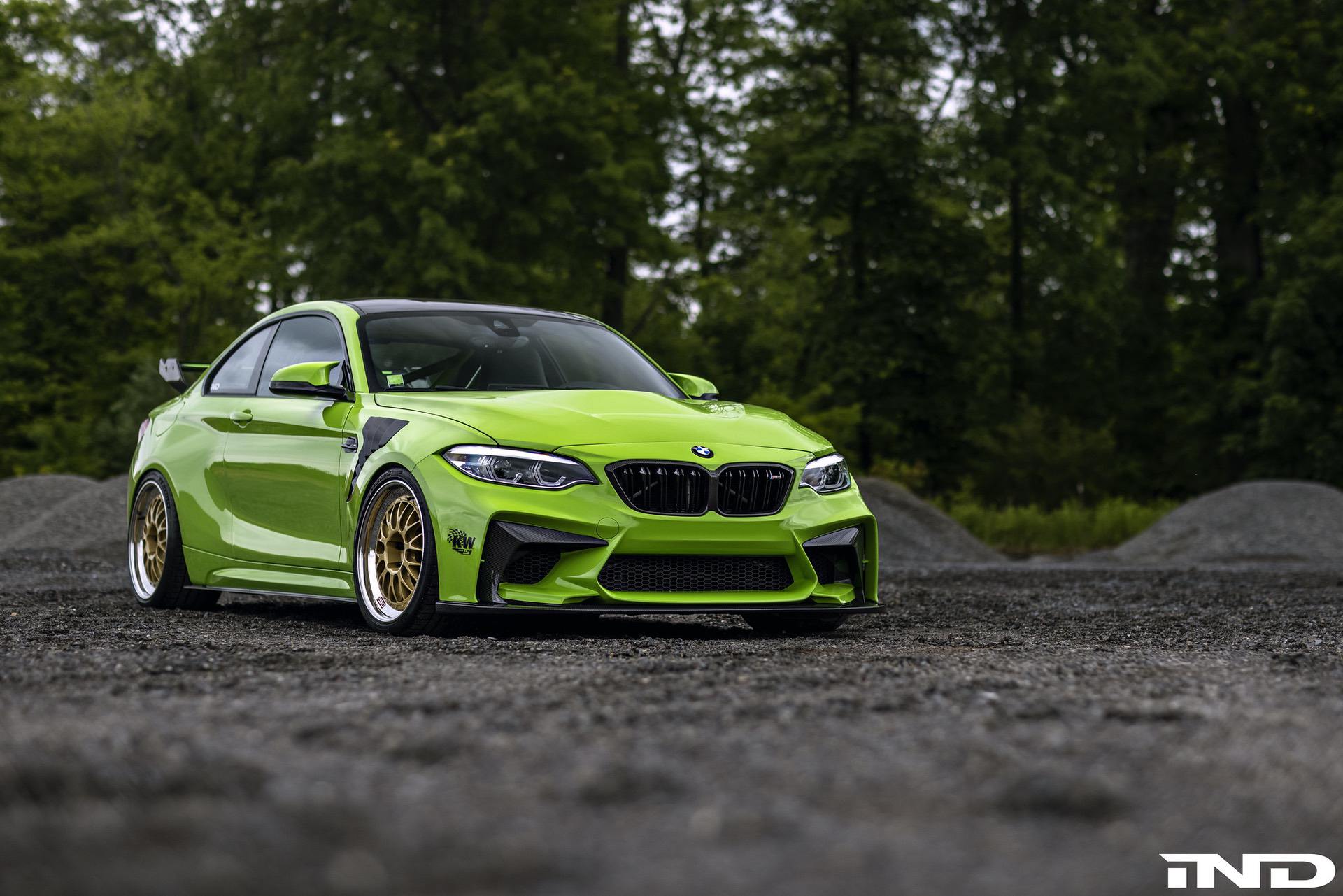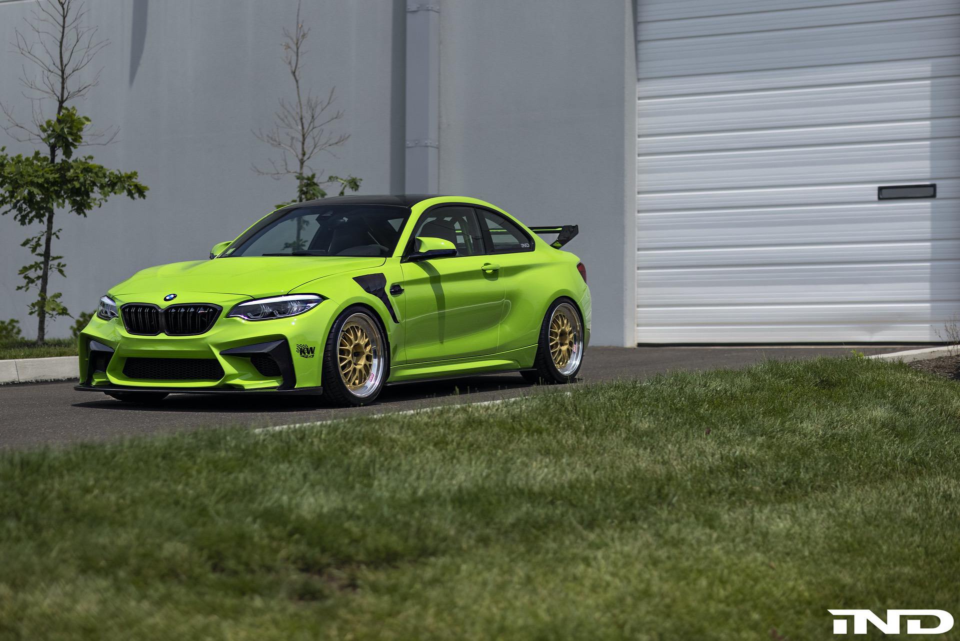 On the outside, this BMW M2 has the rear wing from the M2 CS Racing, 3D Design bumpers and side skirts, the carbon fiber hood from an M2 CS, an RKP carbon fiber roof, IND M3/M4 mirror caps, gold three-piece BBS wheels, front fender louvers, and a Porsche Yellow-Green custom paint, along with some decals. As I said — intense.