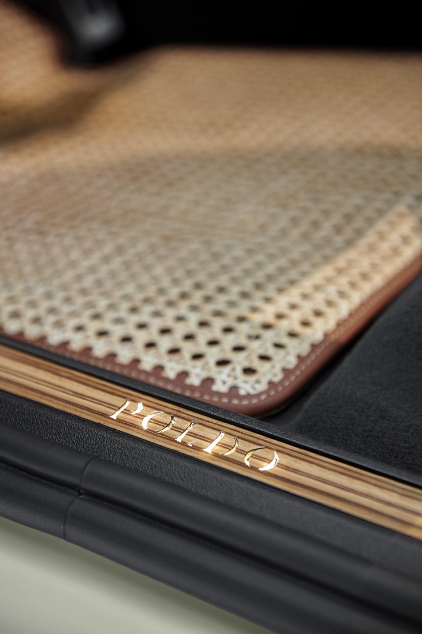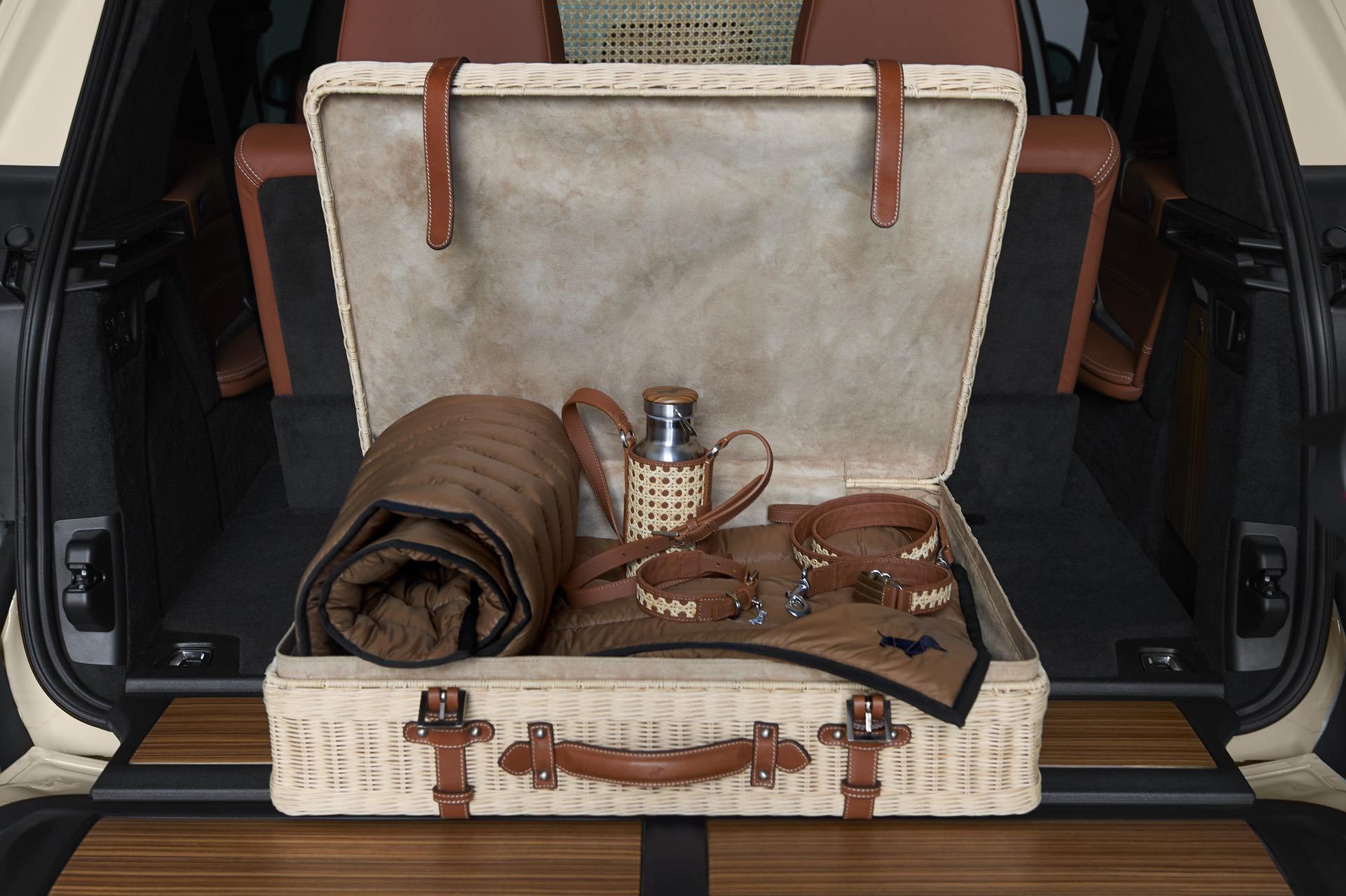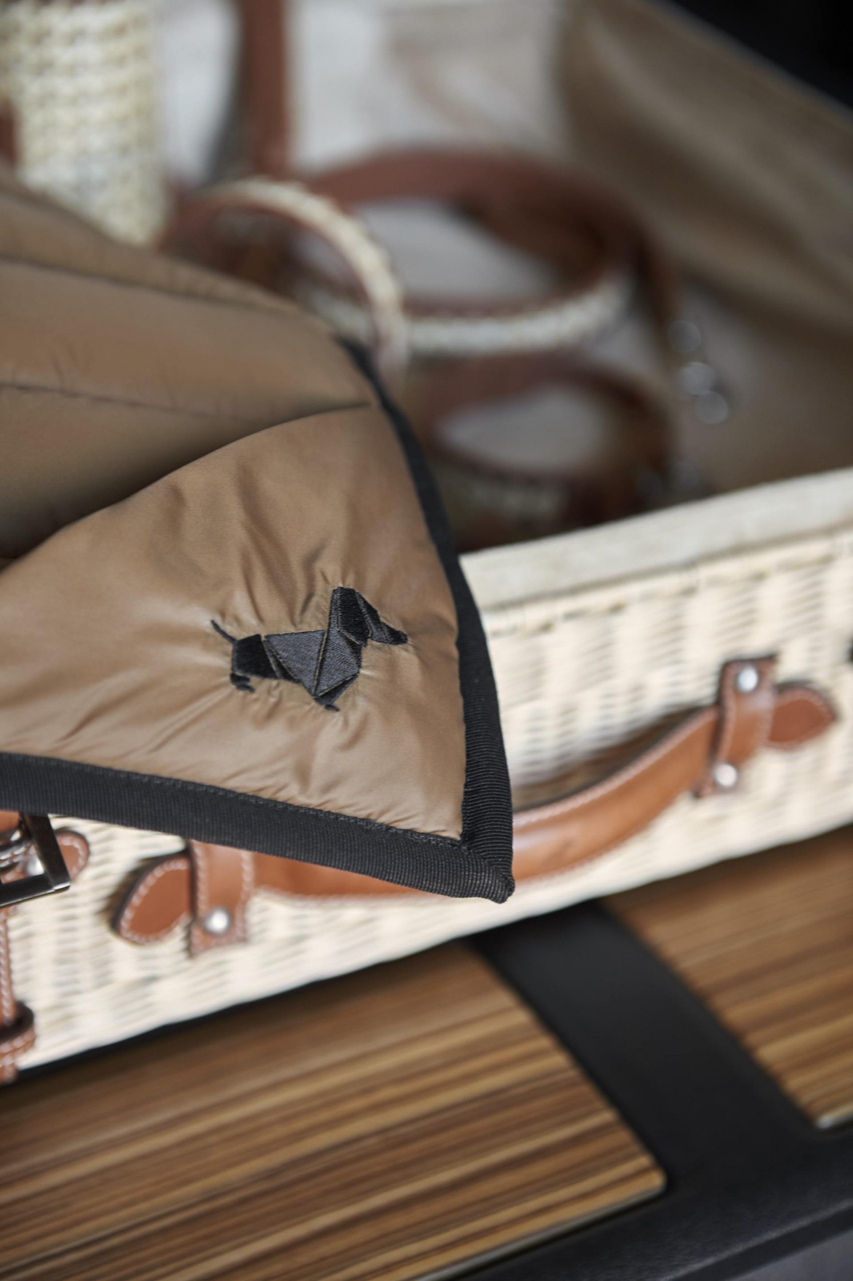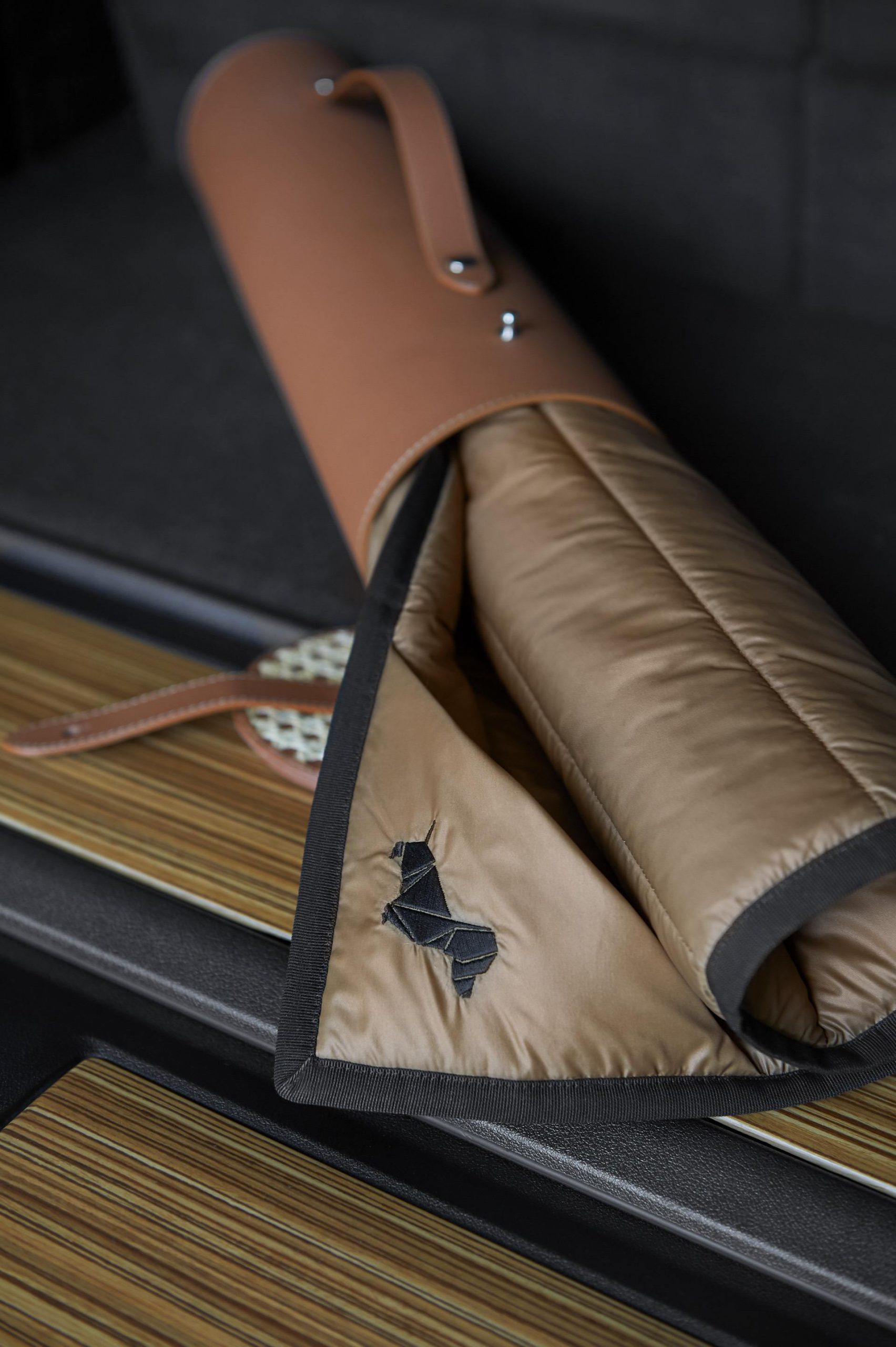 - A 50×50 cm cover for the rear seat that can be rolled up into a convenient cylindrical-shaped carrier, entirely in leather and Vienna straw to take with you when you get out of the car