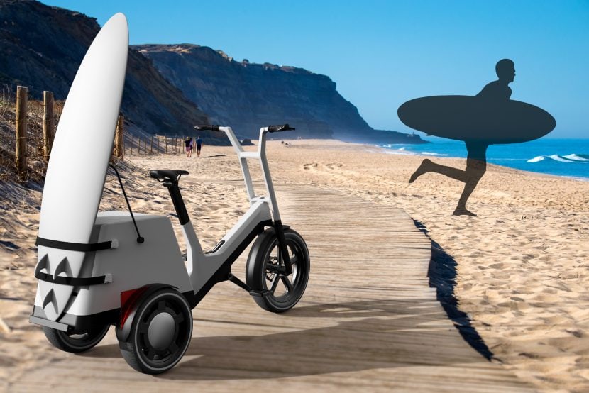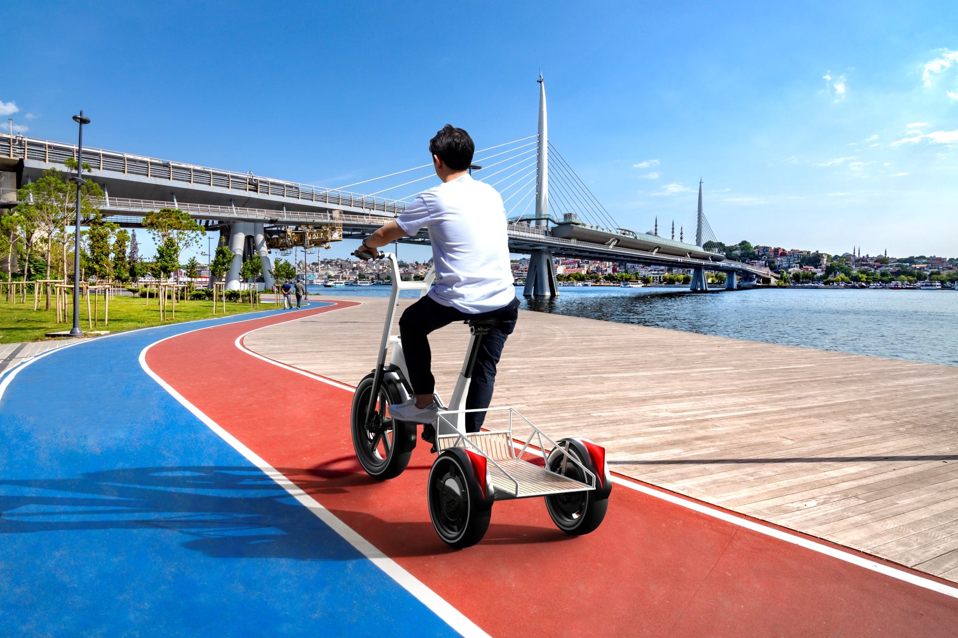 The DYNAMIC CARGO bike makes up for the inconveniences of ordinary cargo bikes, which are wider and heavier than two-wheelers, thus making them less agile and more difficult to handle.