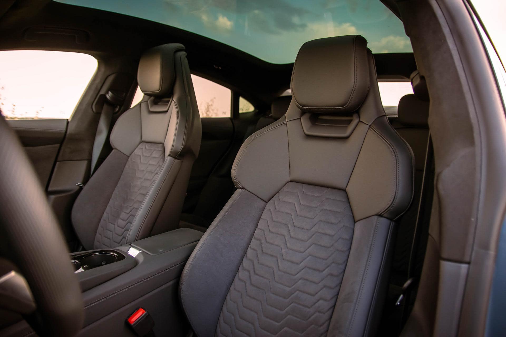 While the sleek, low-slung roofline does look cool from the outside, once you step inside the cabin you start noticing the downsides. For starters, the Audi e-tron GT comes, as standard, with a panoramic sunroof and that’s made with a specially treated glass meant to keep things cool and quiet inside. This measure also offers a bit more headroom inside the car, that’s especially noticeable in the back, compared to the Taycan, for example.
