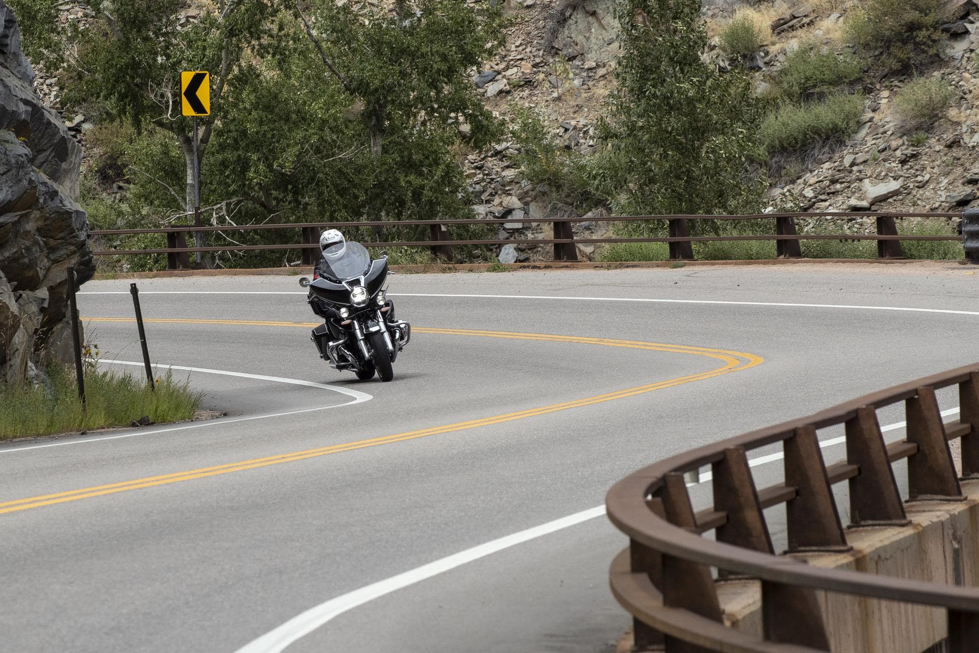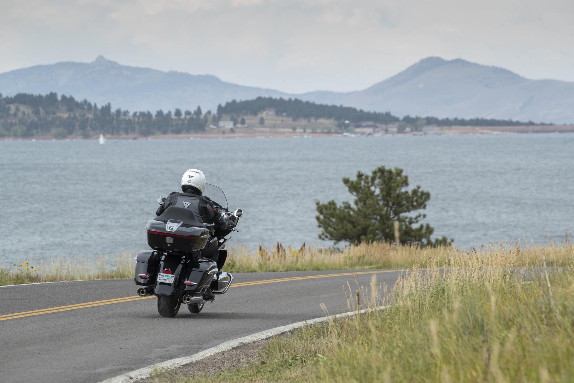 North of Boulder, we made our way through the glorious canyons leading to Estes Park, and the bikes proved to be lively companions.  Steering is direct and precise, and though the heft of the machines generally makes them want to press onward, a bit of braking followed by a judicious use of throttle lightens up the front and helps with turn-in.  While the bikes always feel substantial, they also fall into an easy rhythm; weight transfer is predictable and progressive.  Lean angles are necessarily compromised by the size of the cylinder heads, but in the canyons, I found myself regularly scraping the plastic guards under the chromed floorboards.  Fun stuff.
