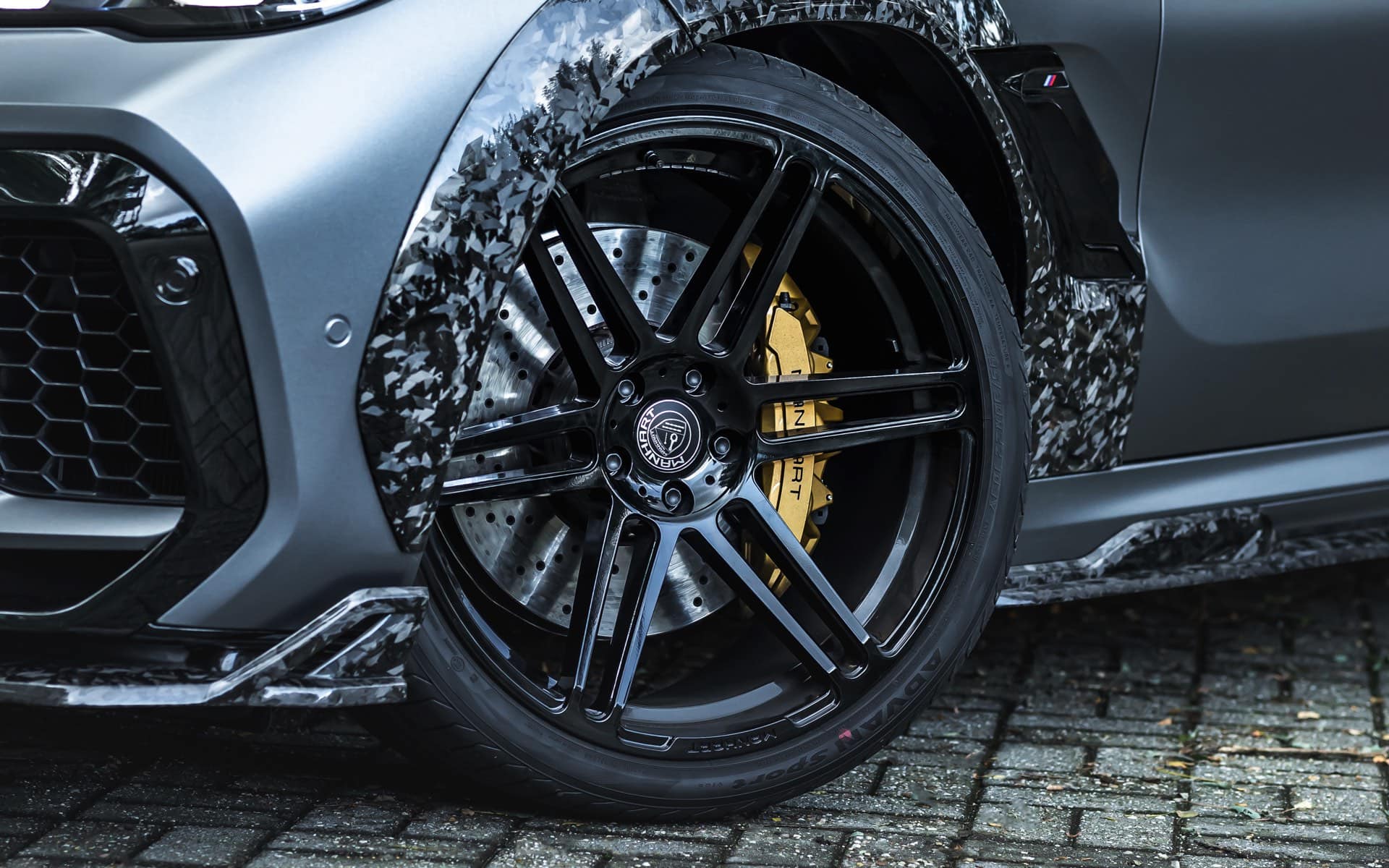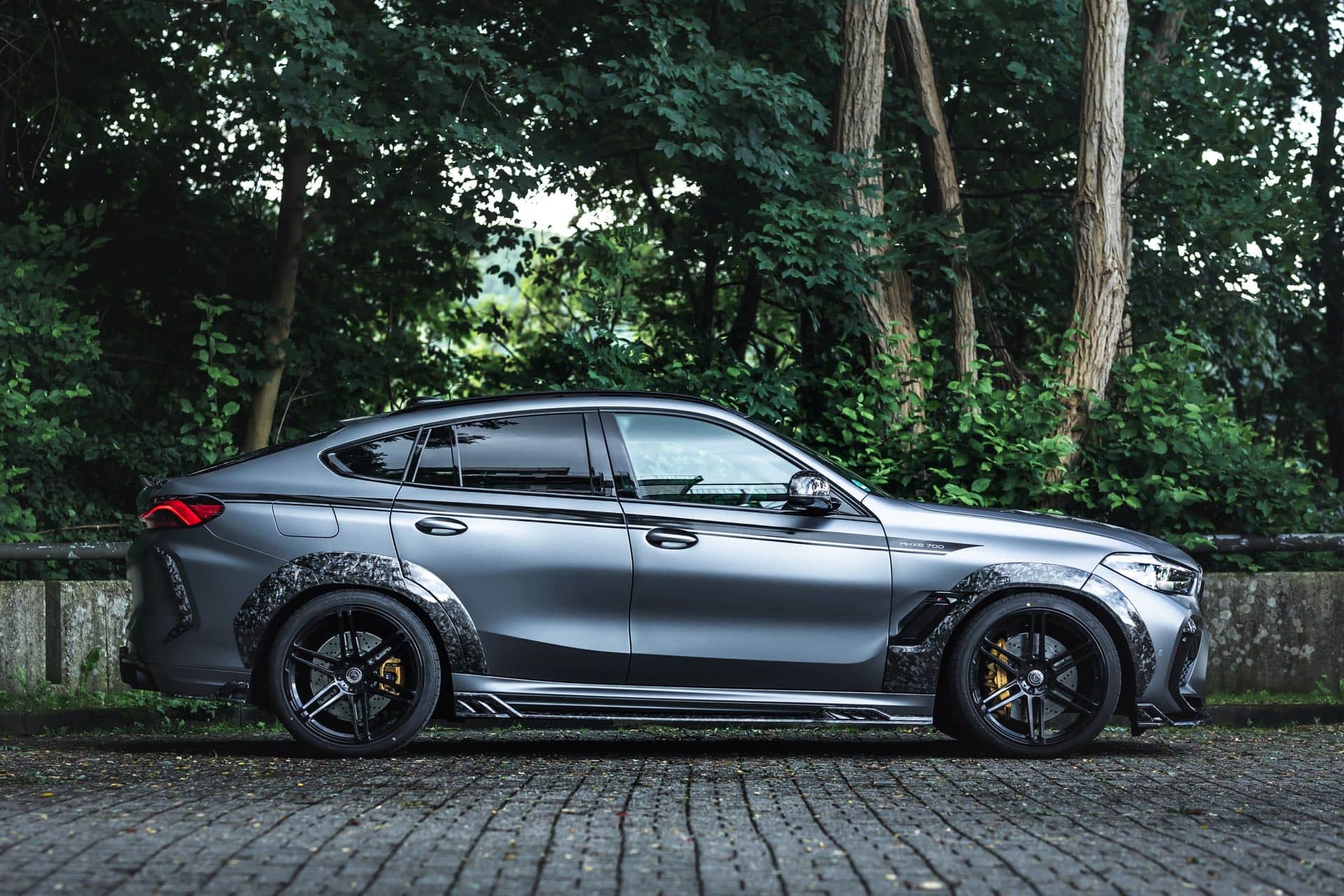 WB in the car’s name stands for widebody, so as you’d expect, some extra work was applied to the X6 M’s body. The 24-piece widebody bodykit is made of artistic forged carbon, with a fiber structure whose irregularity is almost reminiscent of polished marble or granite. This bodykit includes a front spoiler, radiator grille, two-part rear spoiler, rear diffuser, side skirts, multi-part wing extensions, exterior mirror housings and other Forged Carbon parts.