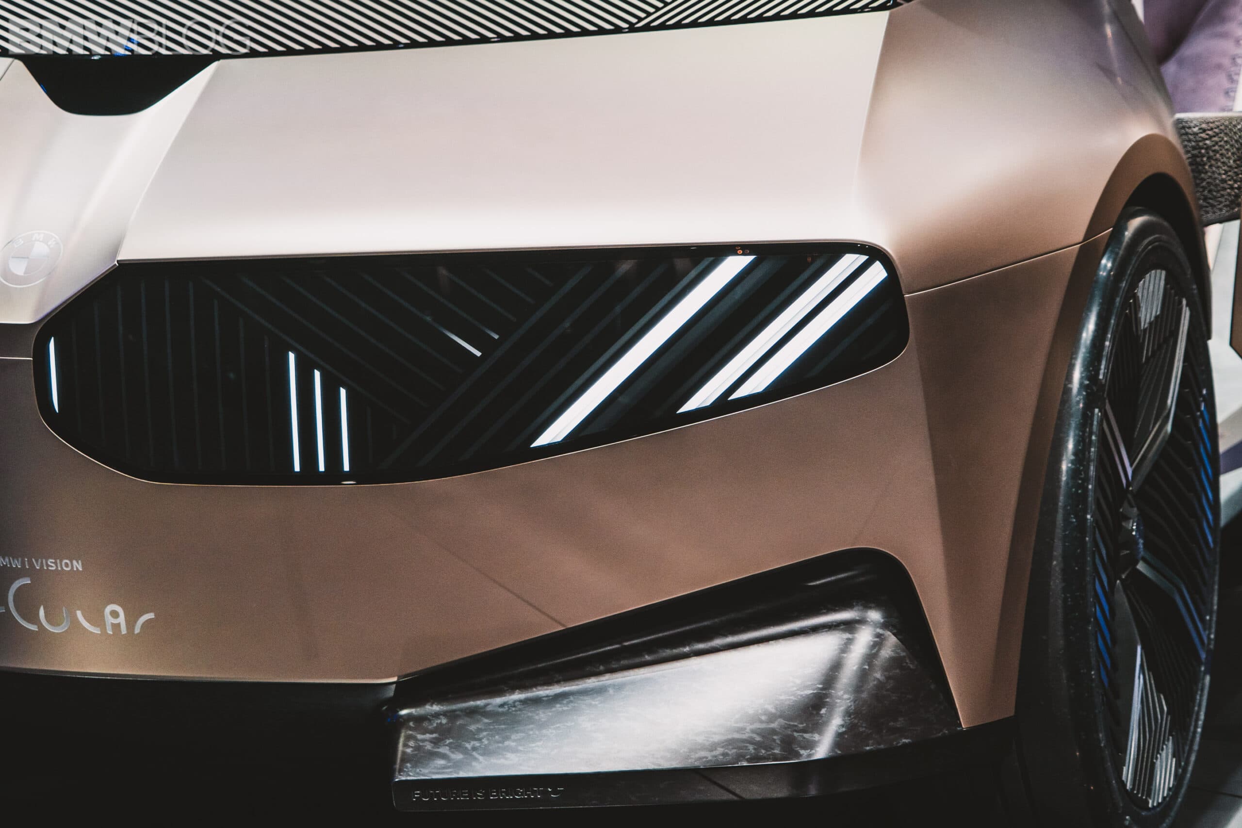 The exterior of the i Vision Circular looks unlike any other BMW before it. The kidney grilles and headlights are digital, the taillights are built into a rear glass panel, and its body isn’t even painted. The latter is the funkiest of its exterior design quirks. Rather than paint the body shell, the i Vision Concept’s aluminum panels get light gold anodized finish, which BMW calls Anodized Mystic Bronze. Snazzy.