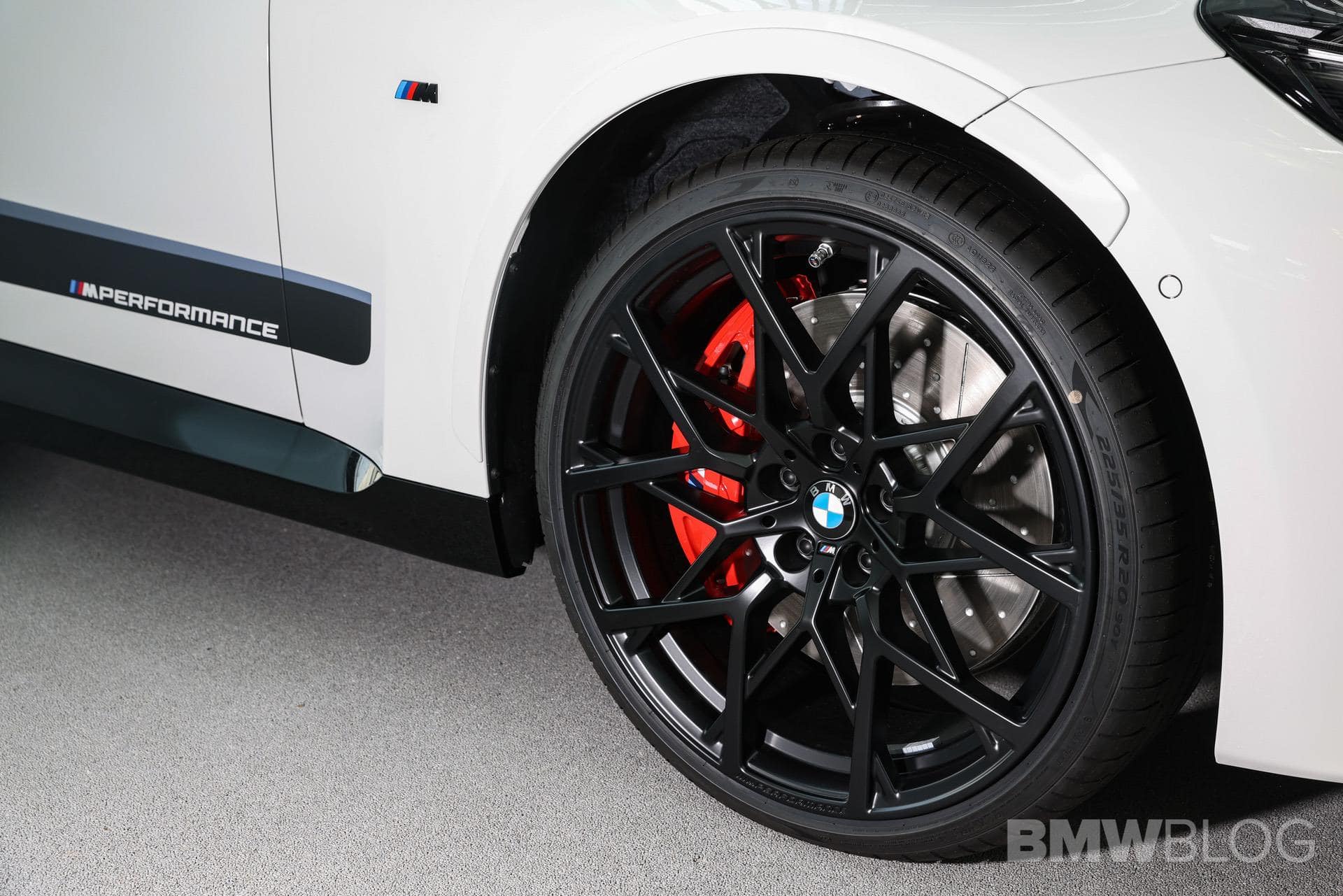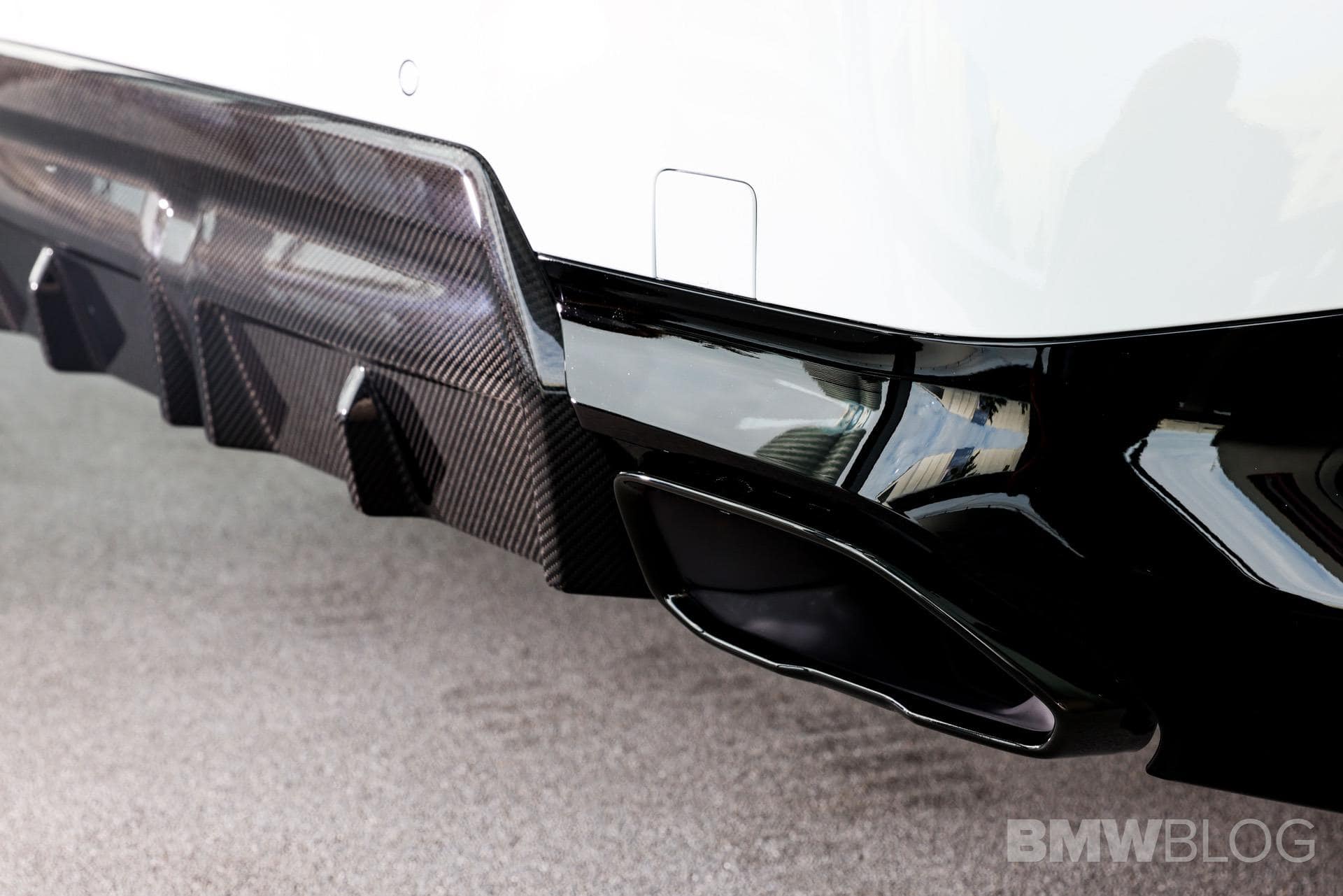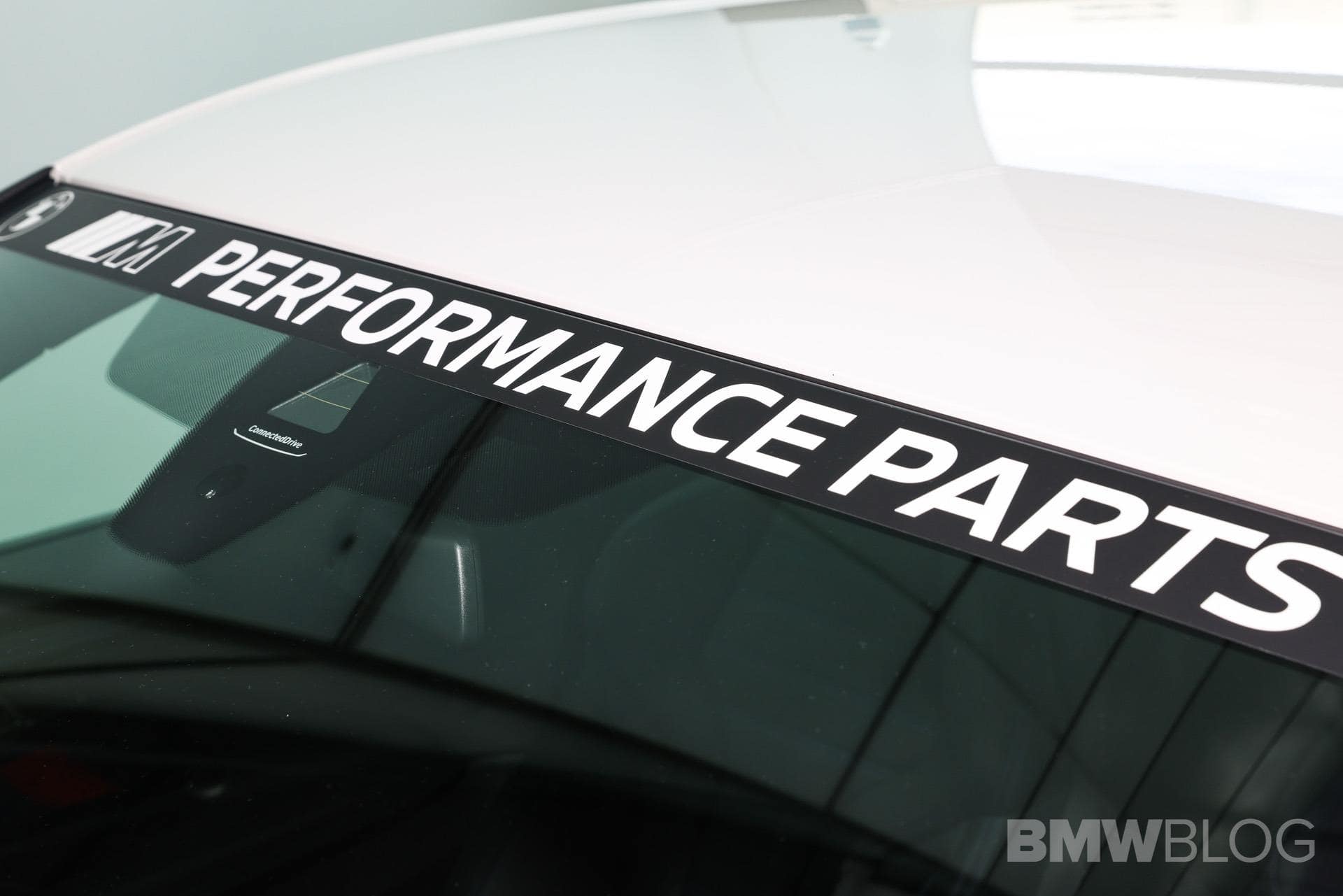 Inside, there’s an M Performance steering wheel, with Alcantara nine and three o’clock positions, as well as a red twelve o’clock stripe. You can also get the paddle shifters in carbon fiber. Thickly bolstered sport seats feature M Performance badging, what seems to be Alcantara on the seat backs, and some carbon fiber trim on the back of the headrests.