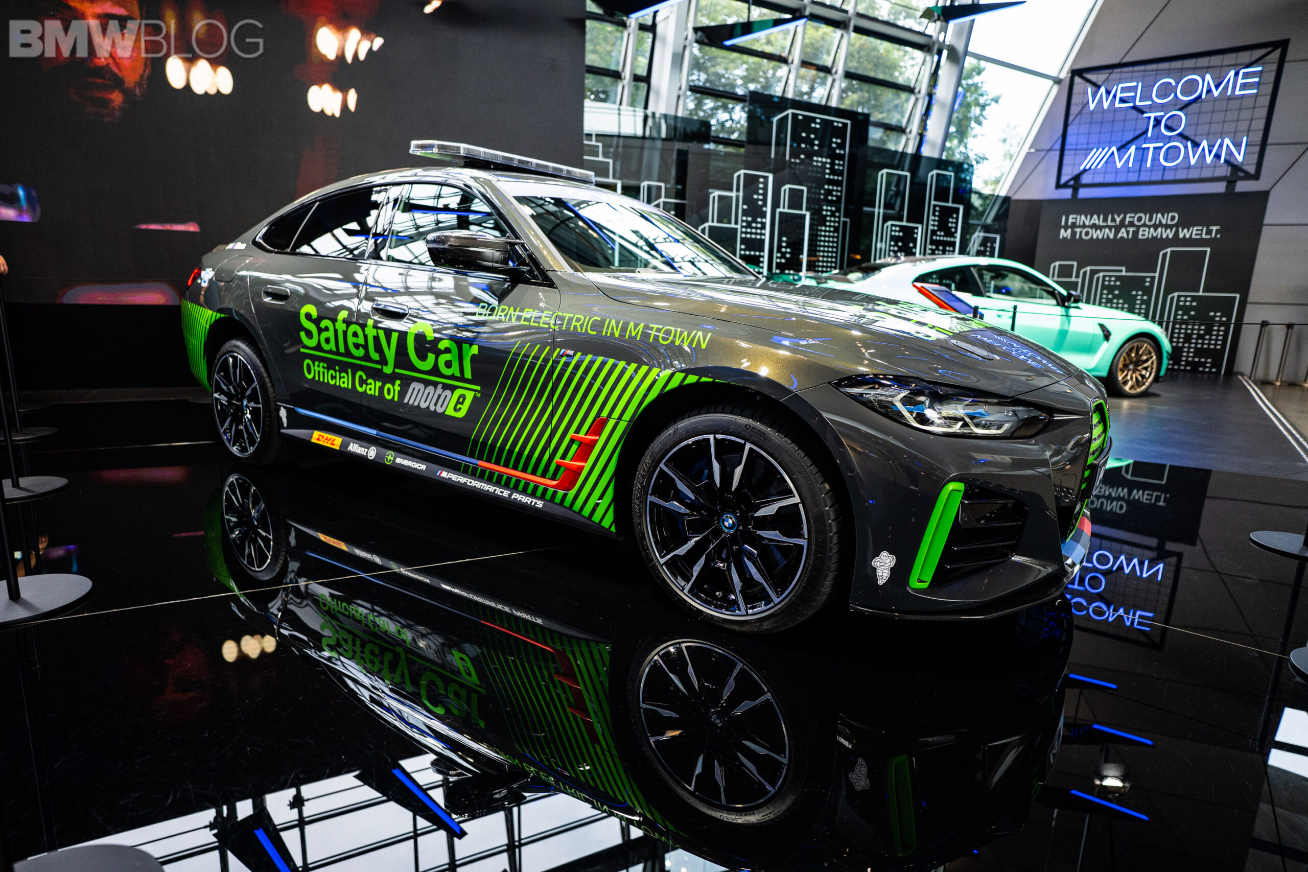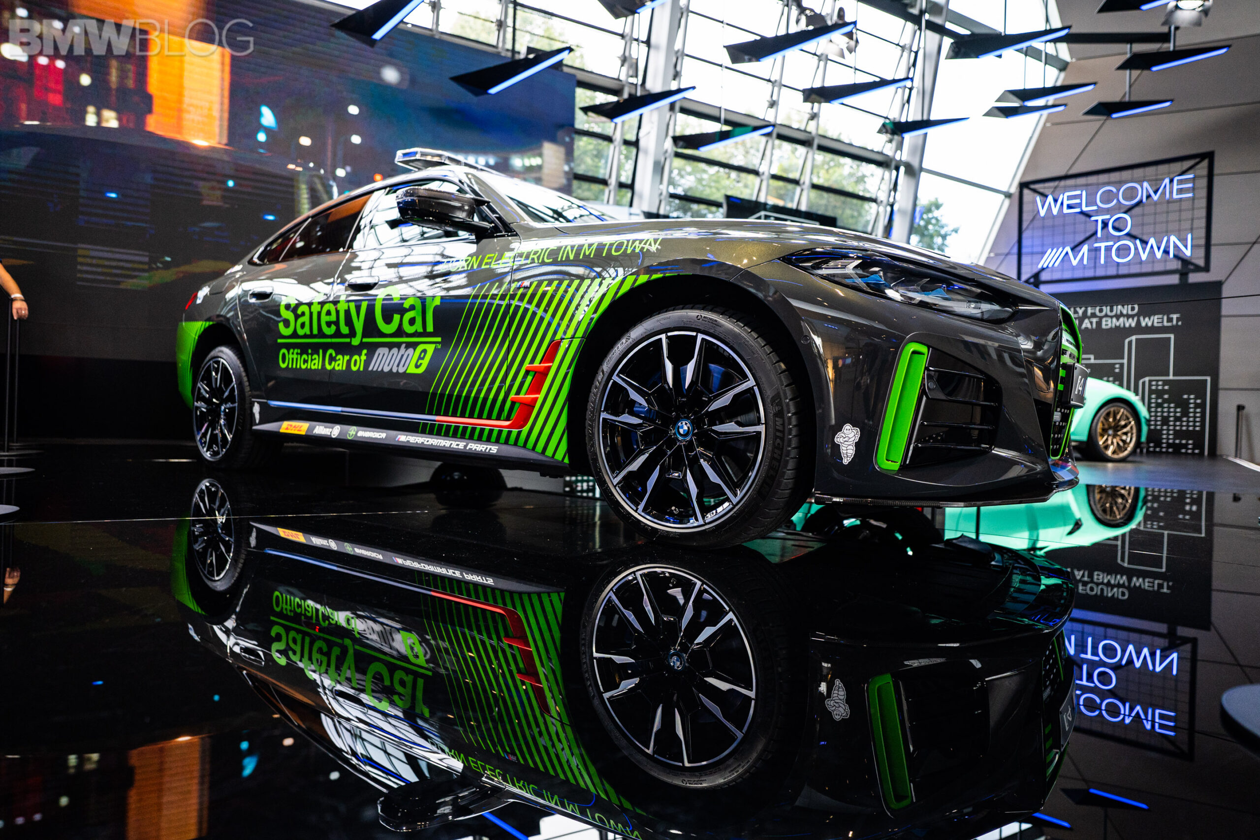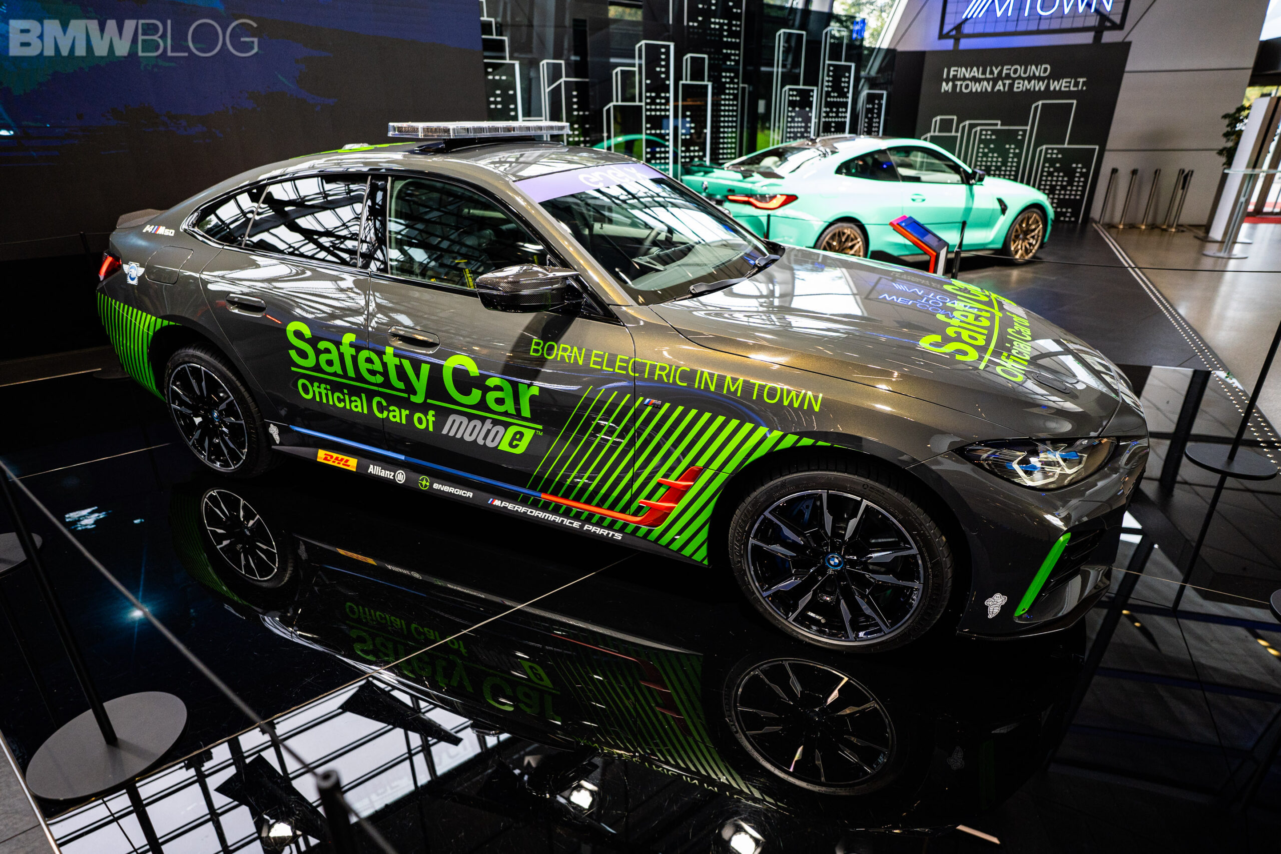 The car features a grey and green paint scheme, including a kidney grille with green slats and the M colors at the bottom. There are also additional green inserts throughout the body of the i4, including green decals. On top of the roof you will find the typical emergency lights of a safety and pace car, while the rear end also features a decent-sized spoiler.
