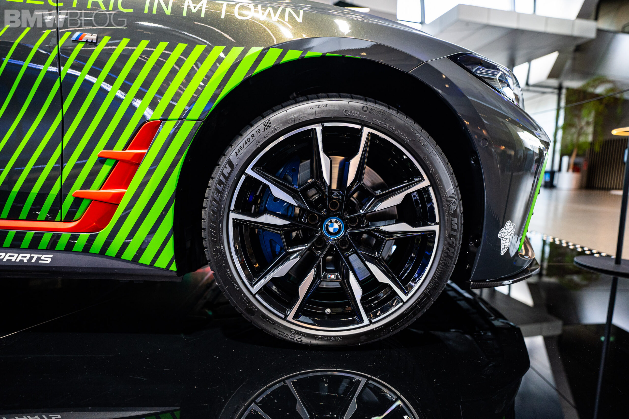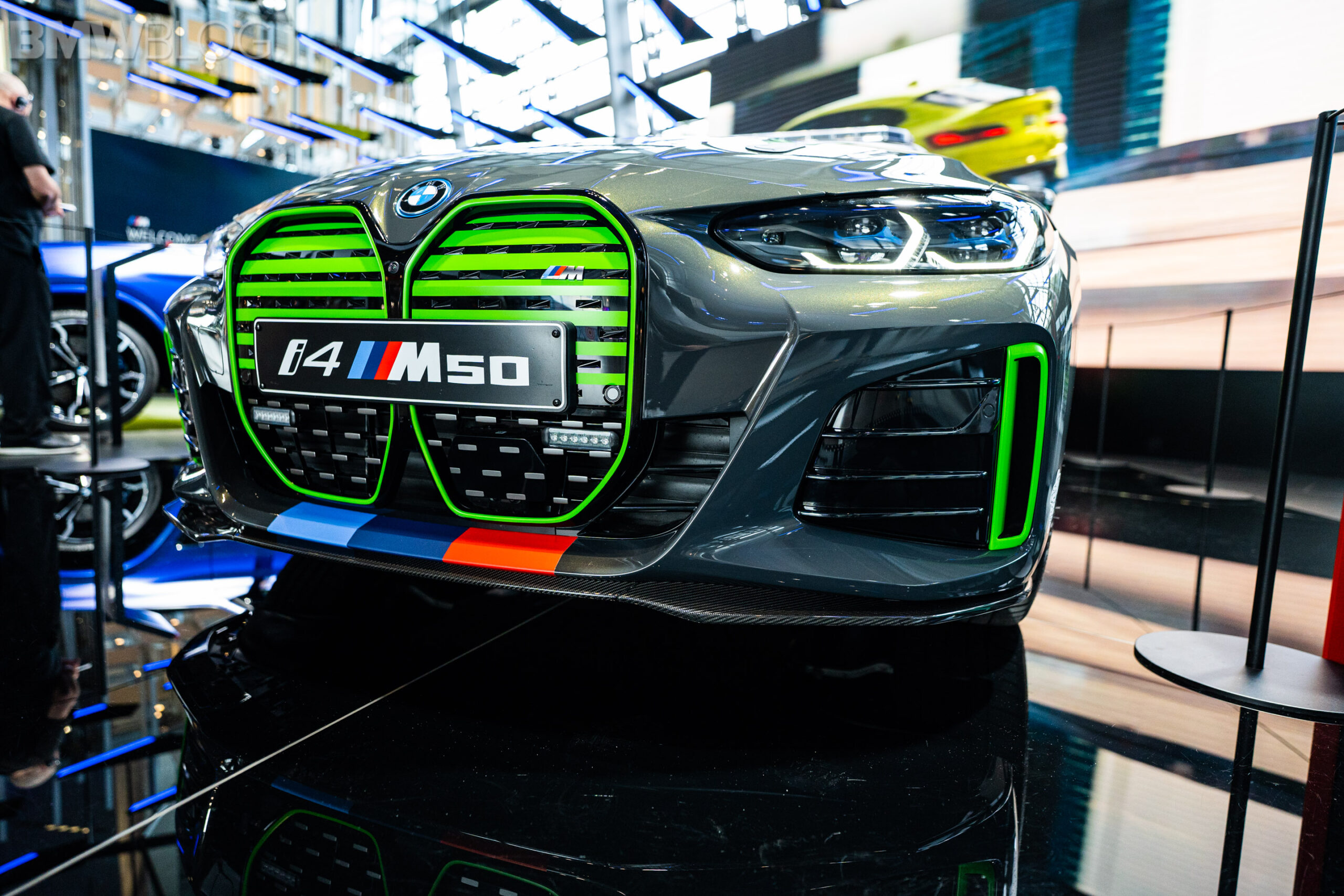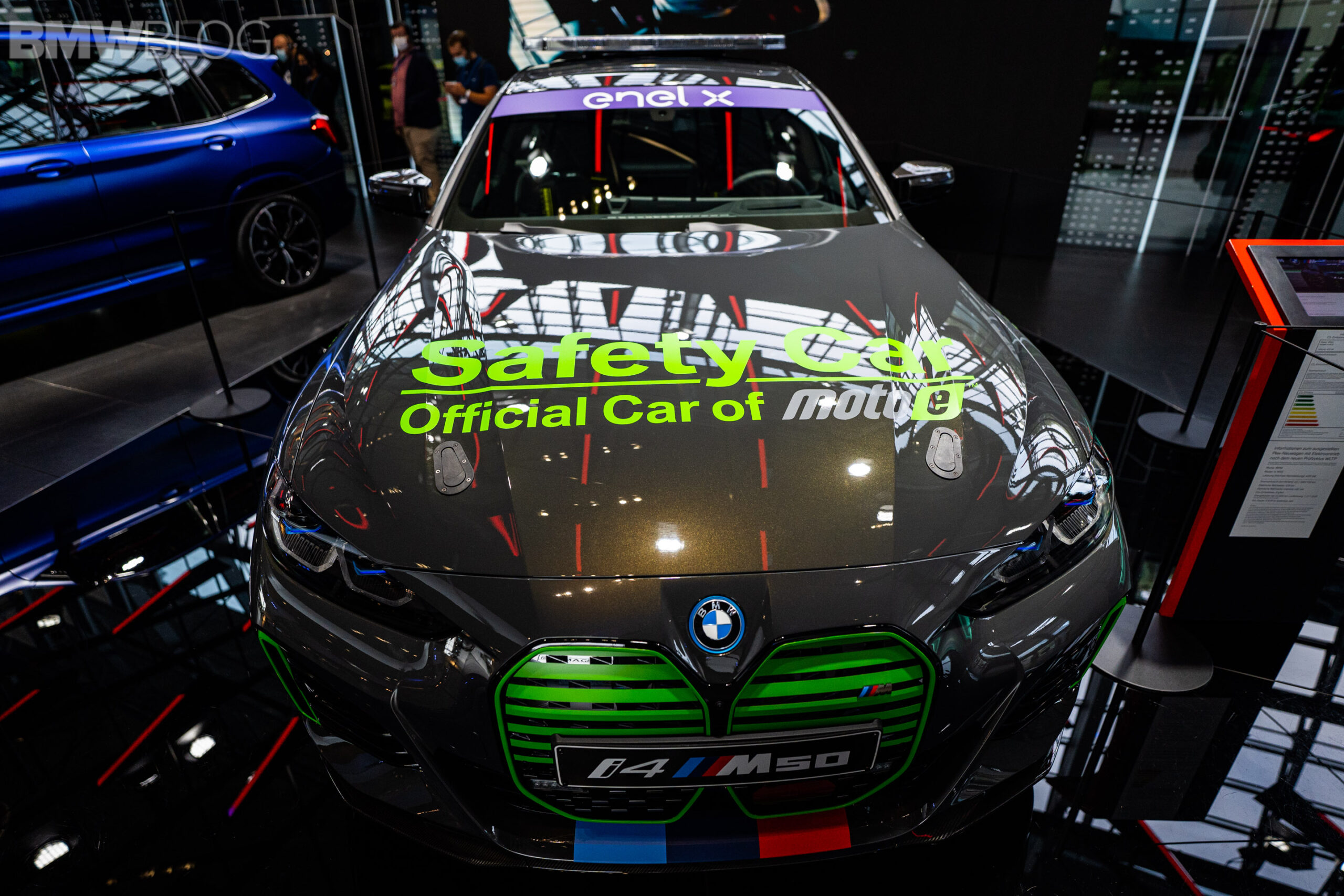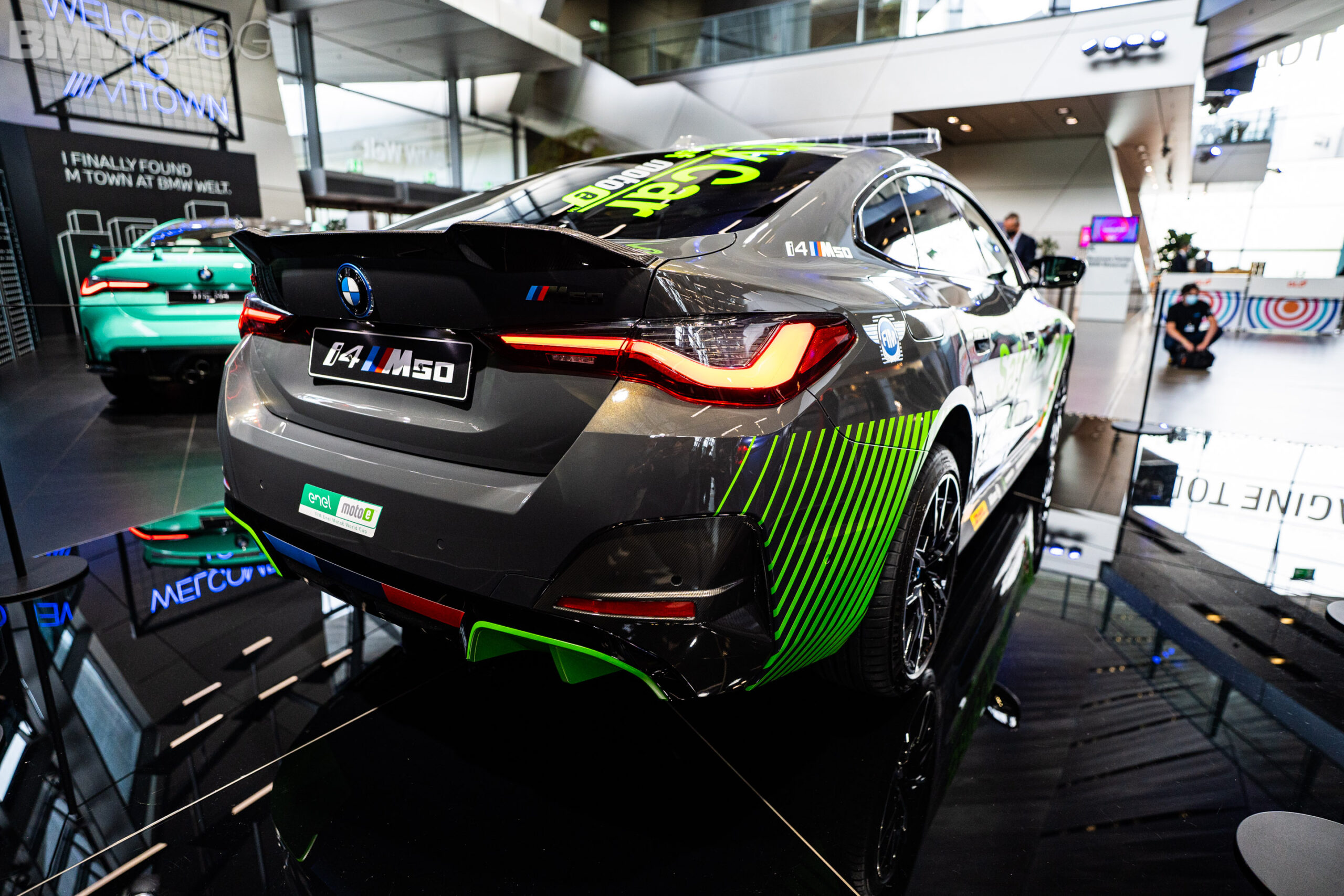 The car features a grey and green paint scheme, including a kidney grille with green slats and the M colors at the bottom. There are also additional green inserts throughout the body of the i4, including green decals. On top of the roof you will find the typical emergency lights of a safety and pace car, while the rear end also features a decent-sized spoiler.