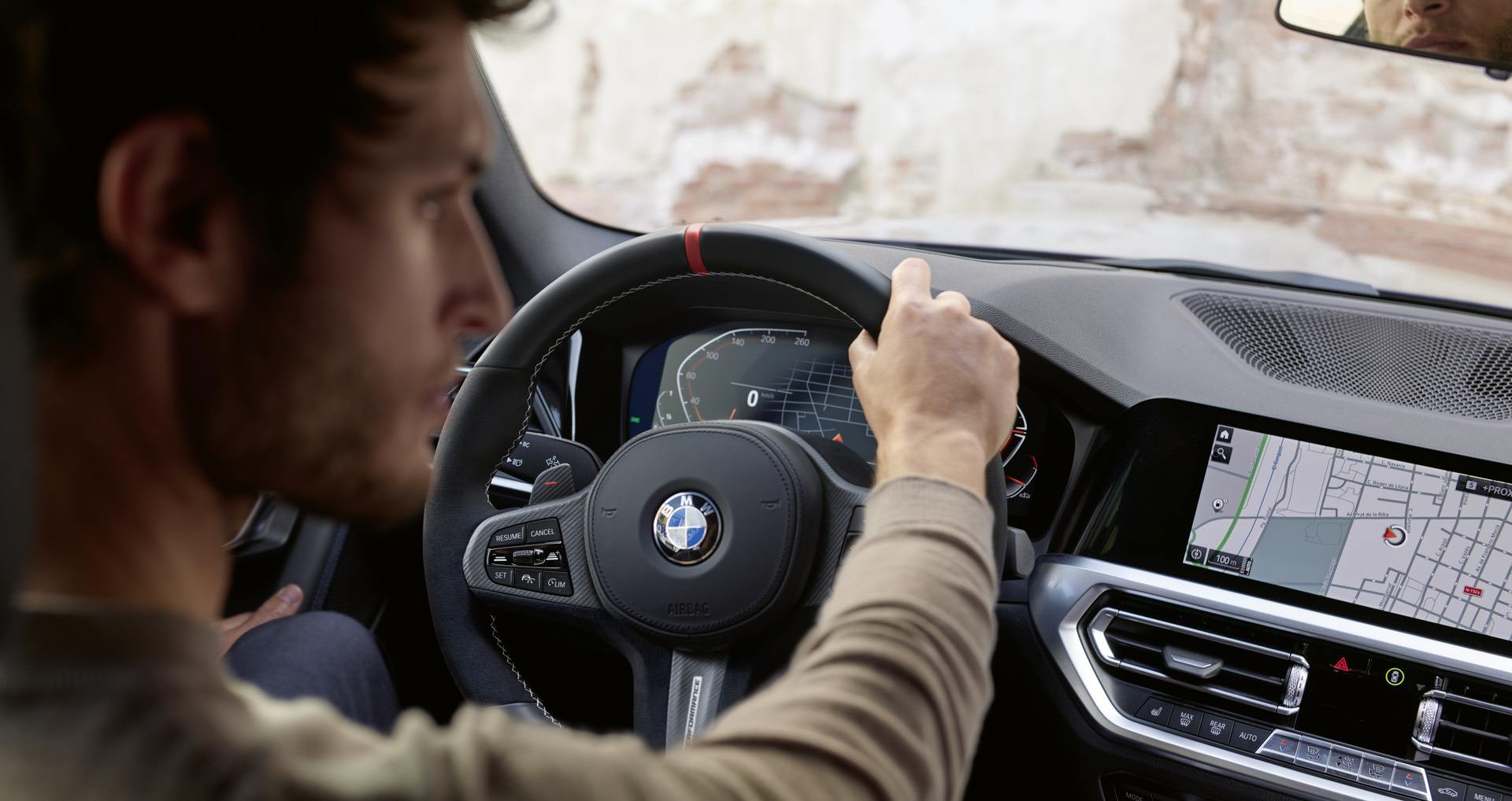 Inside, there’s an M Performance steering wheel, with Alcantara nine and three o’clock positions, as well as a red twelve o’clock stripe. You can also get the paddle shifters in carbon fiber. Thickly bolstered sport seats feature M Performance badging, what seems to be Alcantara on the seat backs, and some carbon fiber trim on the back of the headrests.