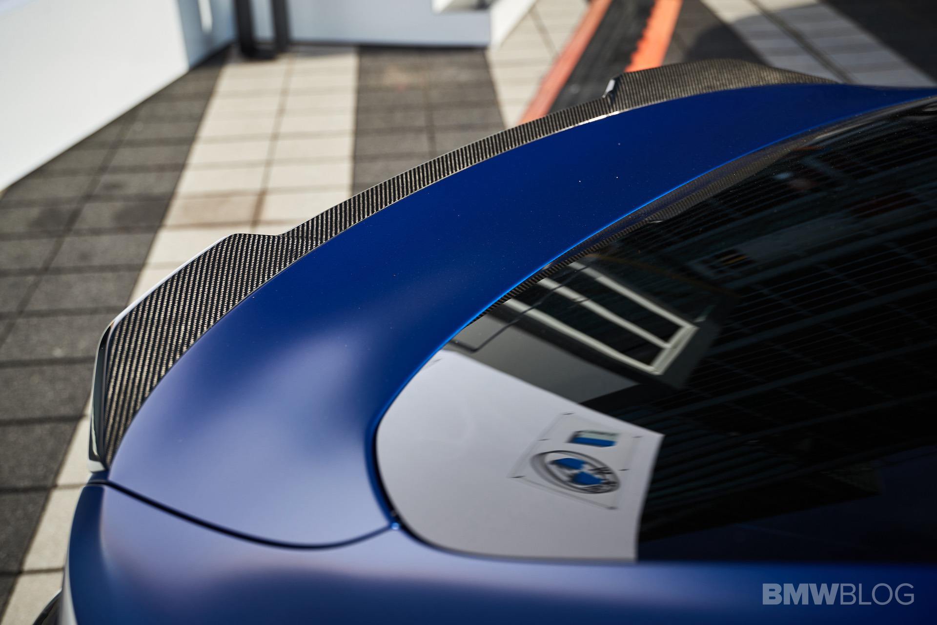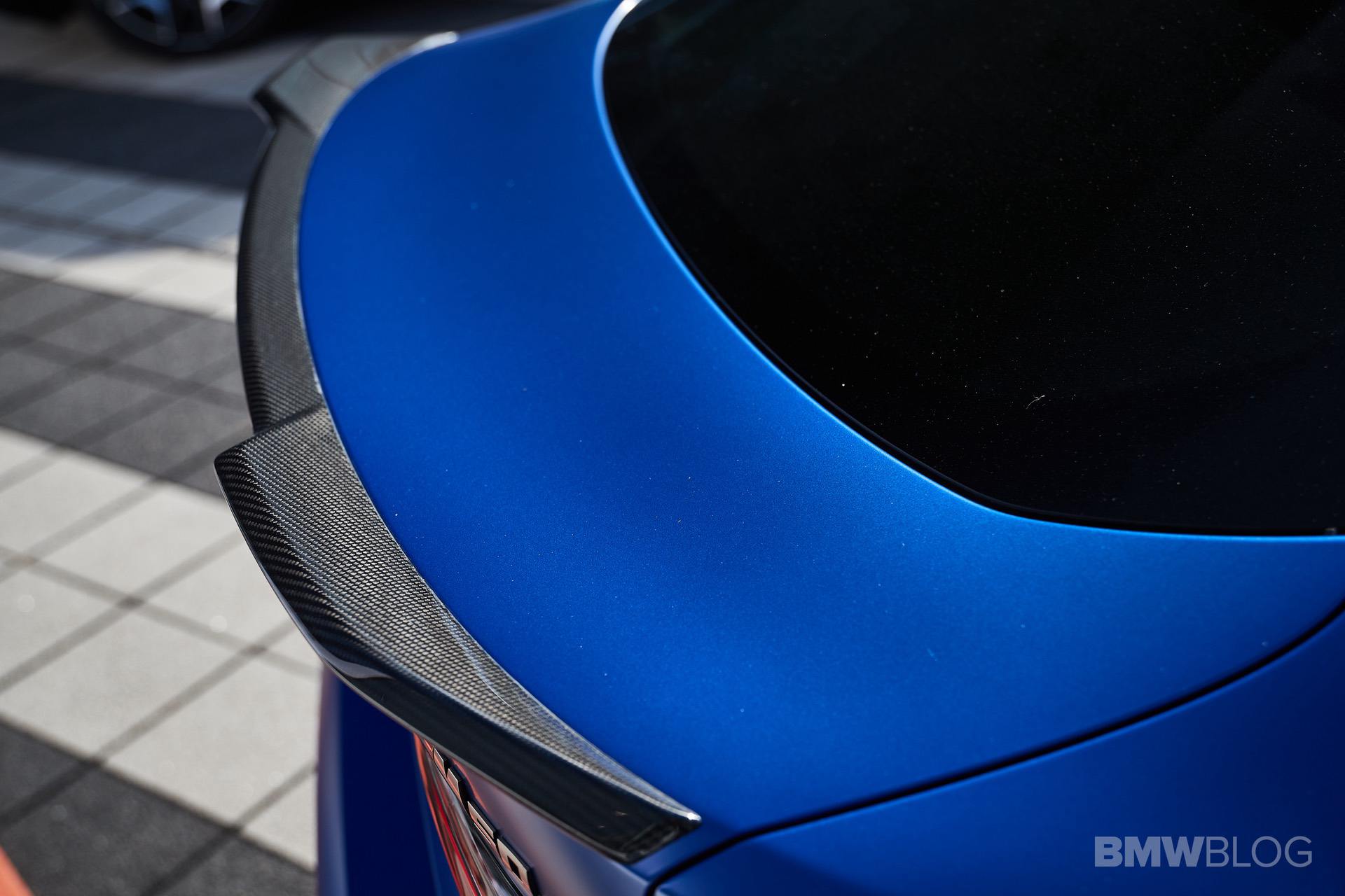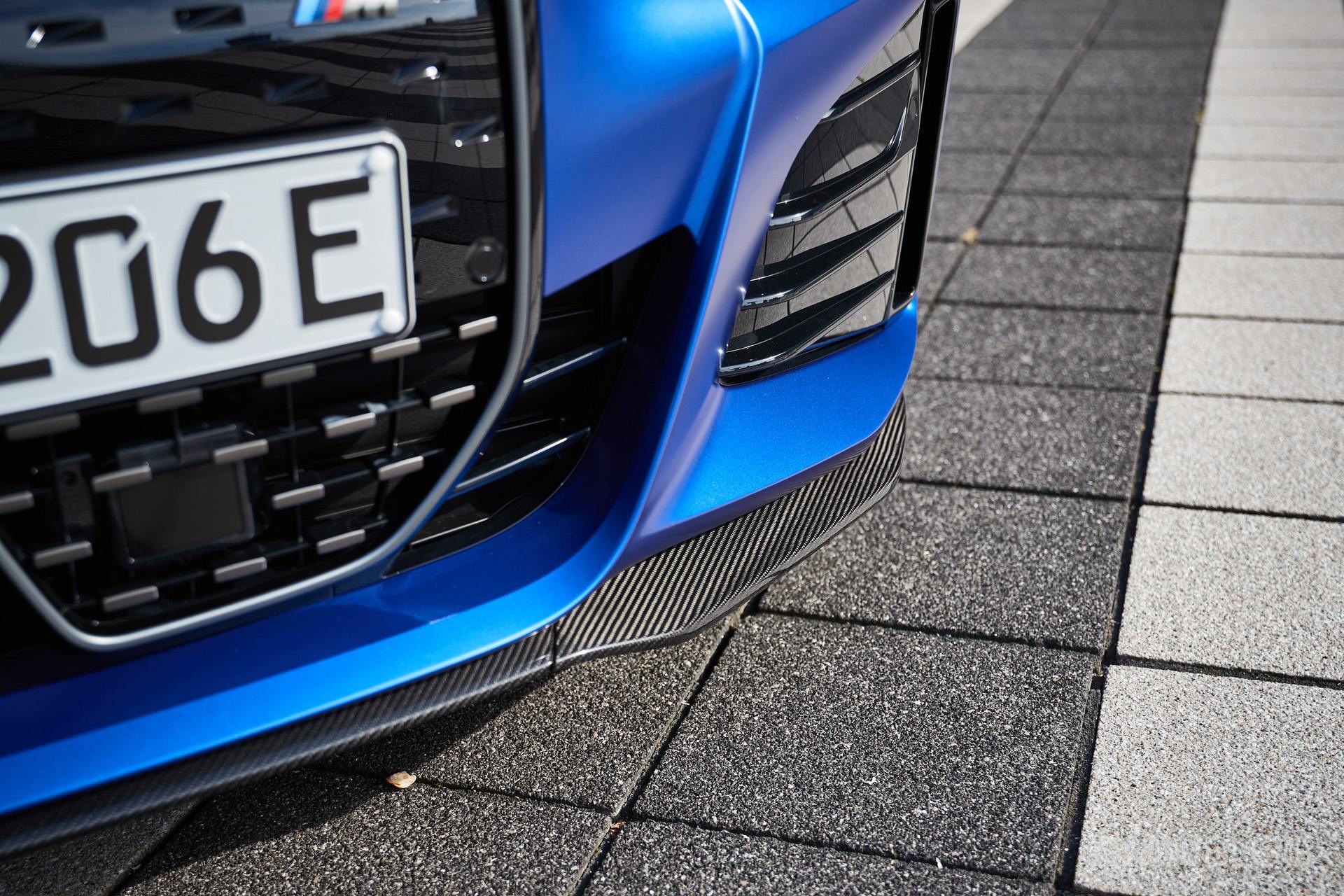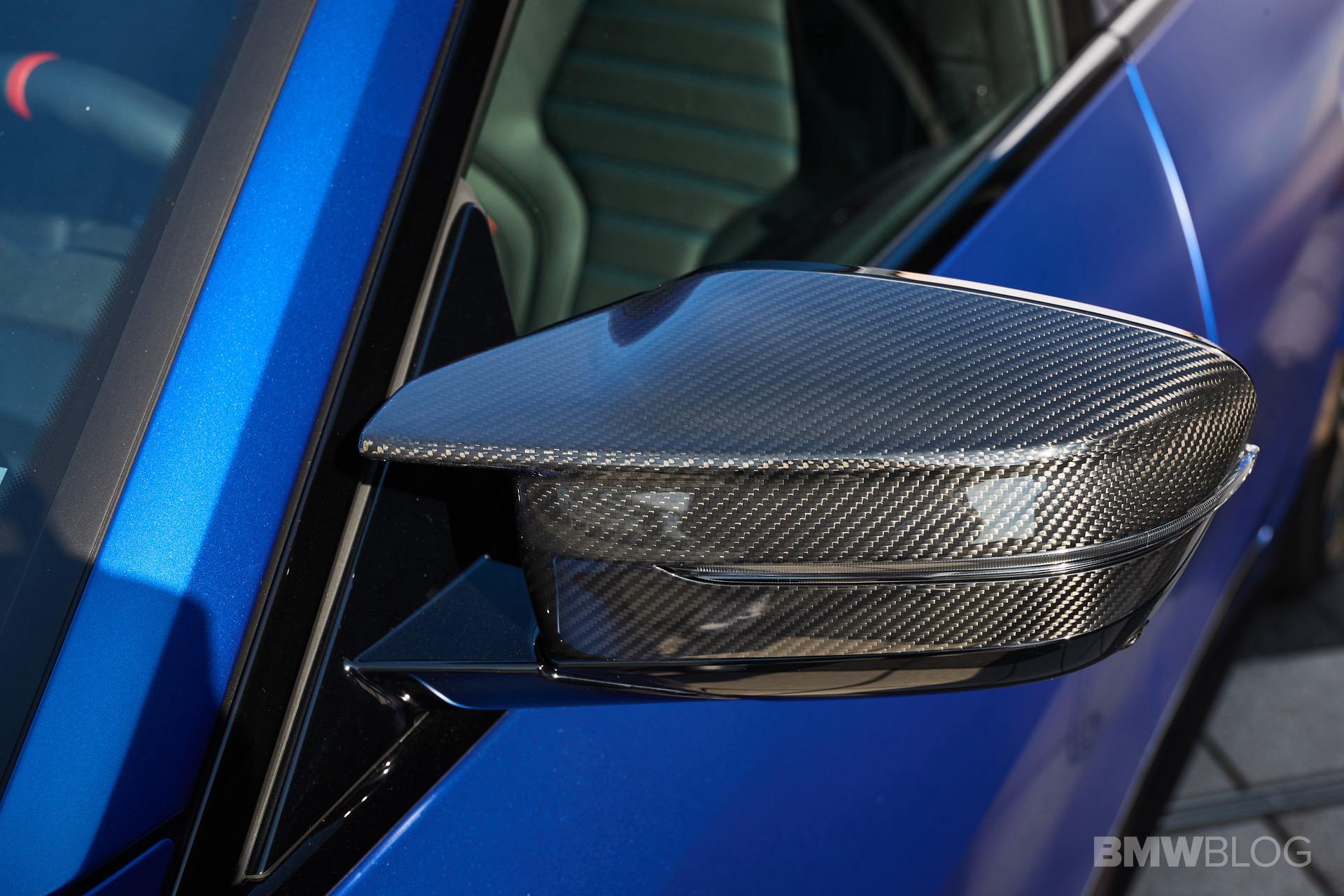 The carbon fiber parts for the BMW i4 include a Carbon Fiber Grille, Carbon Fiber Diffuser, Carbon Fiber Trunk Spoiler and a carbon fiber front splitter. Of course, the M carbon fiber mirror caps are also present on the BMW i4 M50. Another special eye-catcher is the roof fin made of carbon fiber as well.