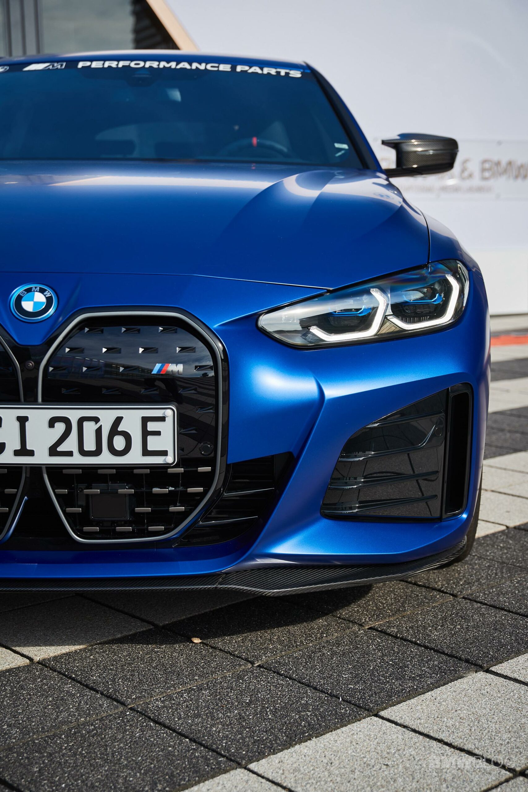 The M Performance Parts catalog extends further into the deep BMW product lineup with the addition of the BMW i4 electric Gran Coupe model. Our photos from the BMW i4 Media Launch in Munich feature the i4 M50 with a series of aero and carbon fiber parts, along with exclusive wheels and special equipment. The extensive M Performance Parts offerings further enhance the sporty looks of the new electric vehicle which is based on the 4 Series Gran Coupe.