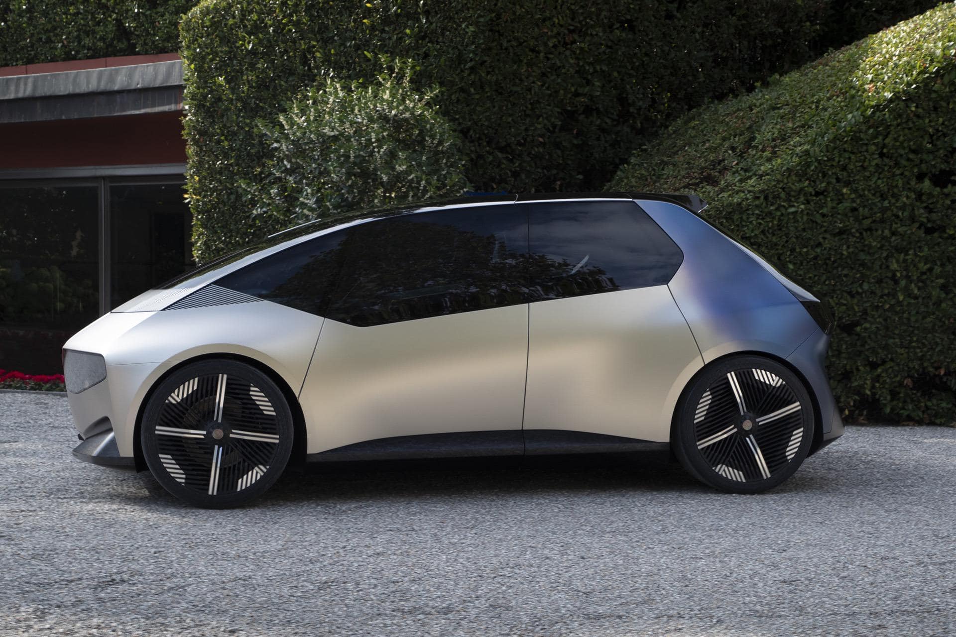 The BMW i Vision Circular’s body isn’t even painted. Instead, the secondary aluminum that makes up the main body shell gets a light gold anodized finish, dubbed Anodized Mystic Bronze. The back end of the body is made from a heat-treated steel, called Temper Blue Steel, to give a contrasting color at the back.