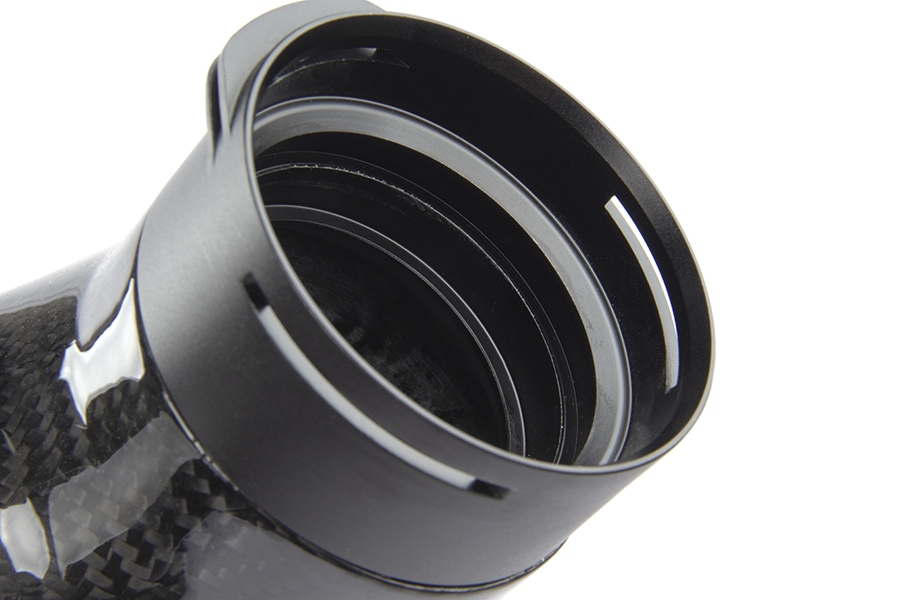 This is a problem Dinan is fixing with these new inlets. They are designed to mate with whatever level of modification to the intake system you anticipate (paired with either stock air boxes or the full Dinan Cold Air Intake System). Where the carbon fiber ends an aluminum adapter to connect to the stock turbocharger begins. Using the same factory locking system, installation in this area is as straightforward as it gets.