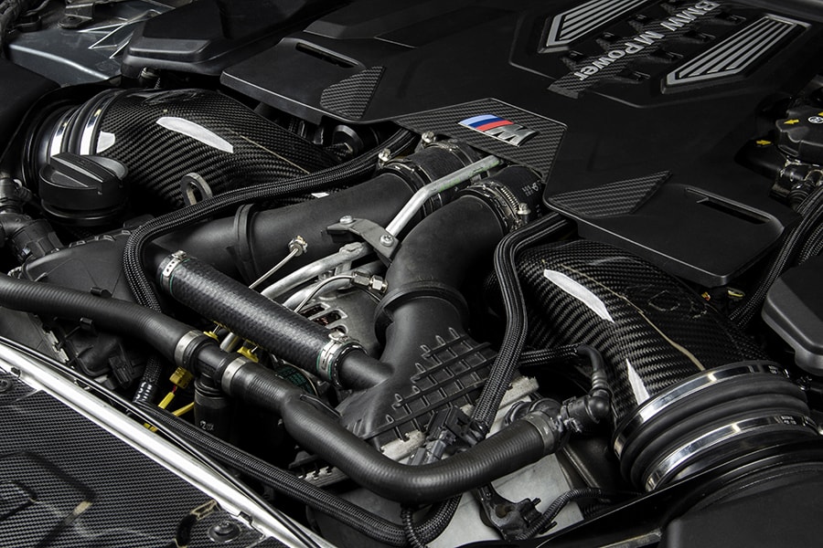 The BMW specialist just unveiled a new carbon fiber set for the S63 engine that’s meant not just to look cool but actually improve the car’s performance. According to Dinan, the factory plastic inlets used on the F90 M5 allow very little volume to pass as they neck down dramatically to the turbochargers themselves. This reduction stifles flow and increases the pressure ratio pre-turbine causing the turbochargers to work harder than necessary.