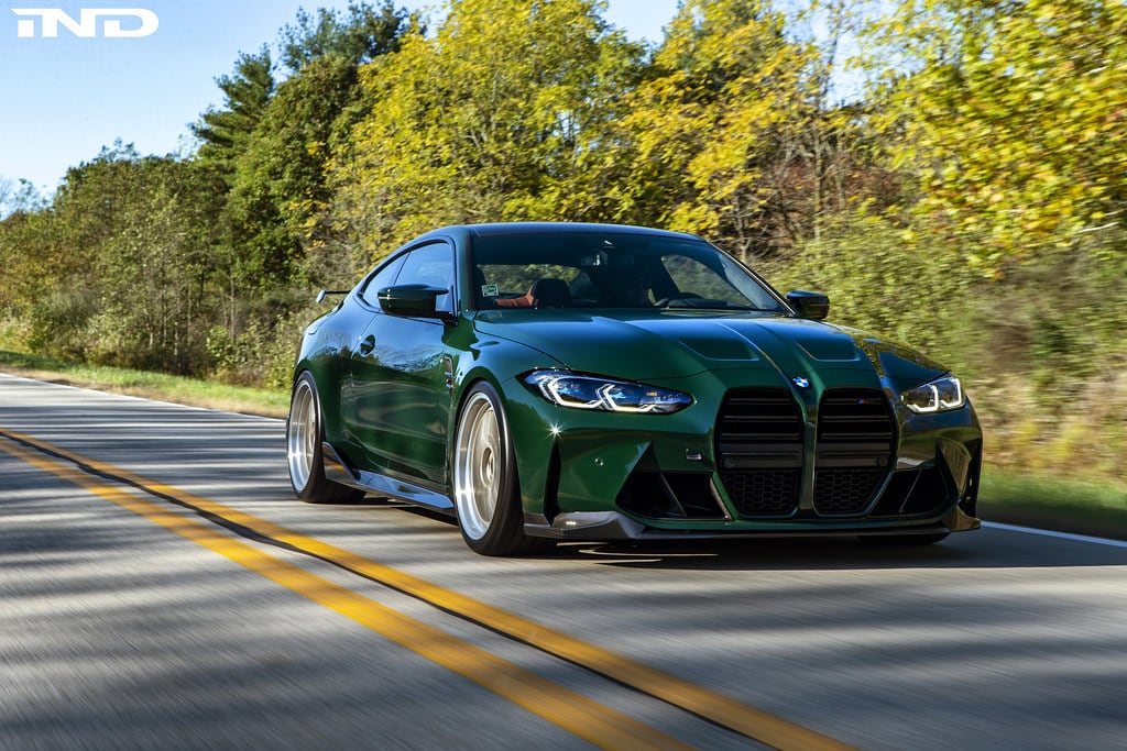 IND Distribution set up shop 15 years ago and will be heading to SEMA next week to celebrate the milestone with a new build based on the 2021 BMW M4 Coupe. What used to be an Alpine White G82 is now finished in a lovely shade of British Racing Green contrasted by the 20-inch BBS wheels with gold accents to make a bold statement. The paint choice was inspired by the European E36 M3 GT as well as the AC Schnitzer CLS II.
